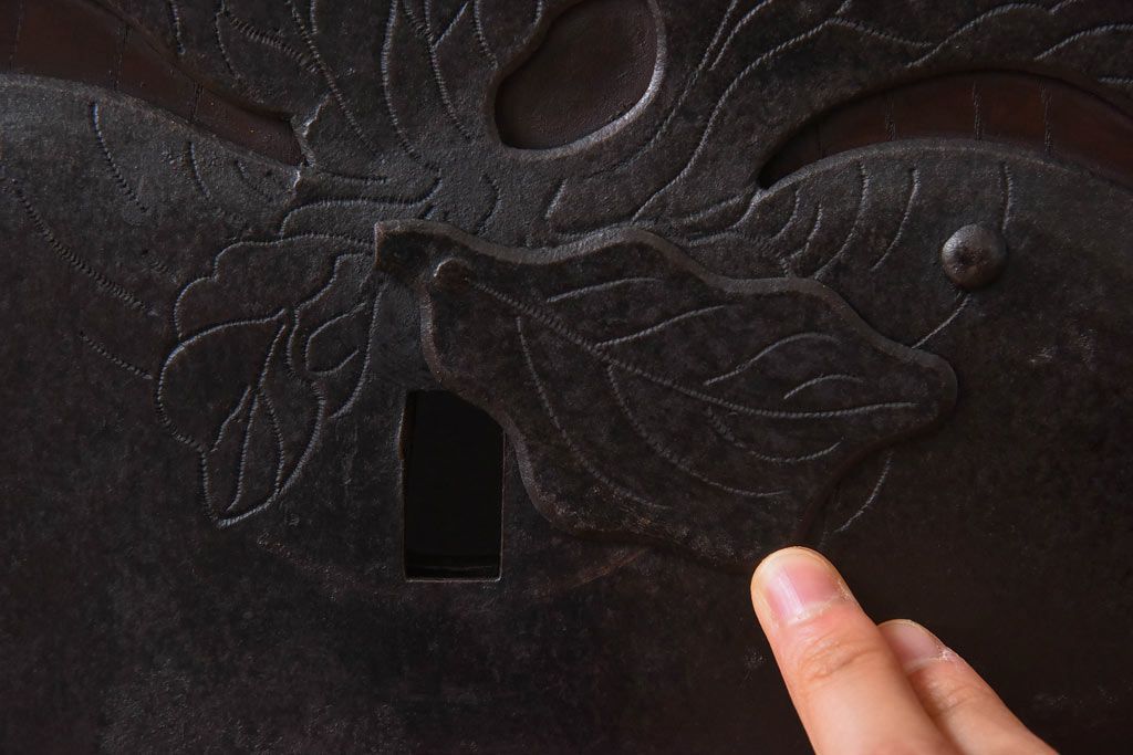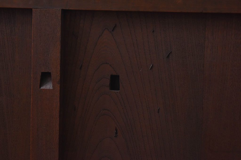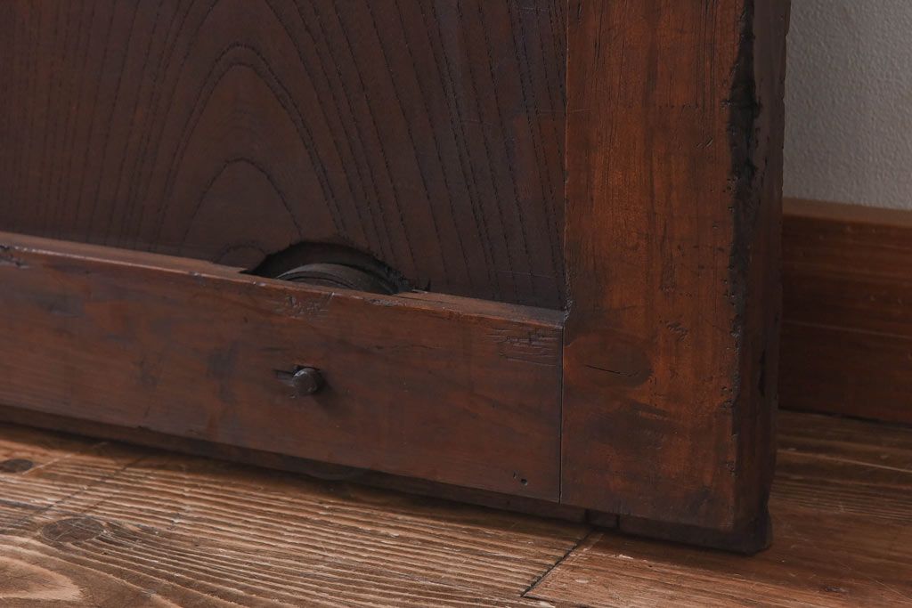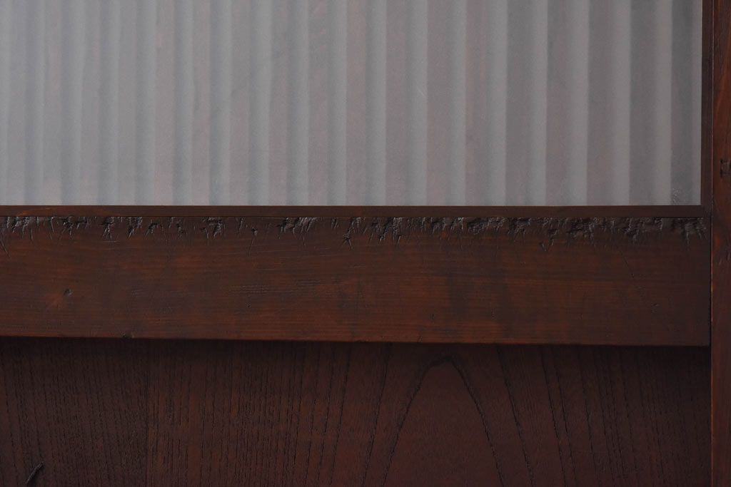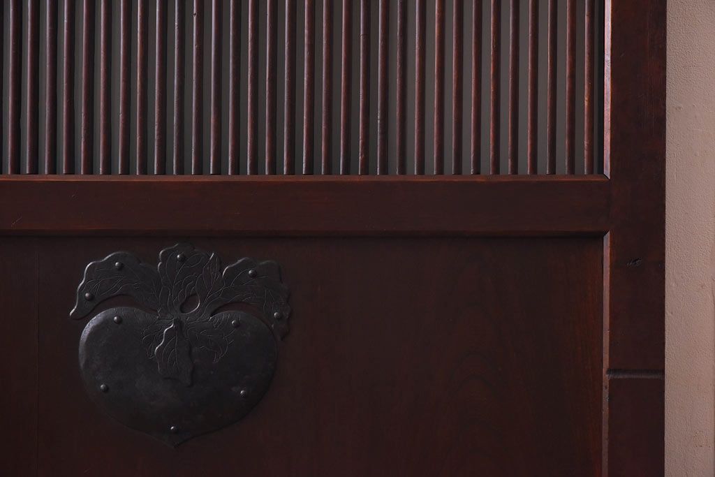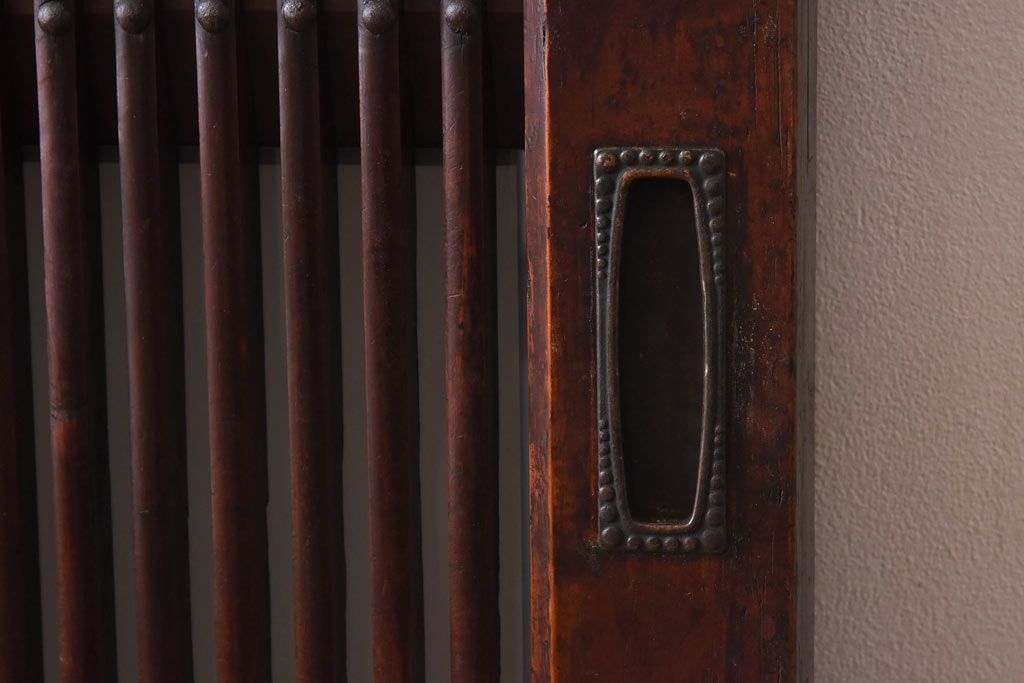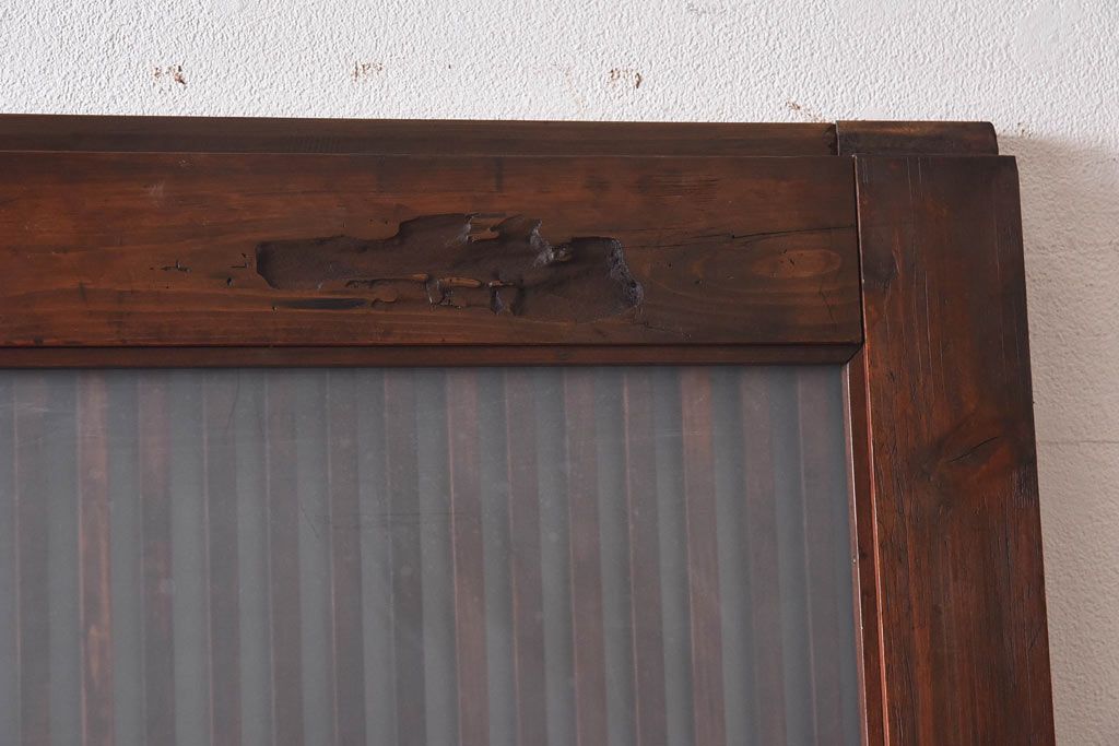 ラフジュ工房> 衝立・パーテーション > 和製アンティーク ヒノキ材 漆塗り 金具の細工が美しいガラス入り蔵戸(ガラス引き戸、格子戸、建具、玄関戸)