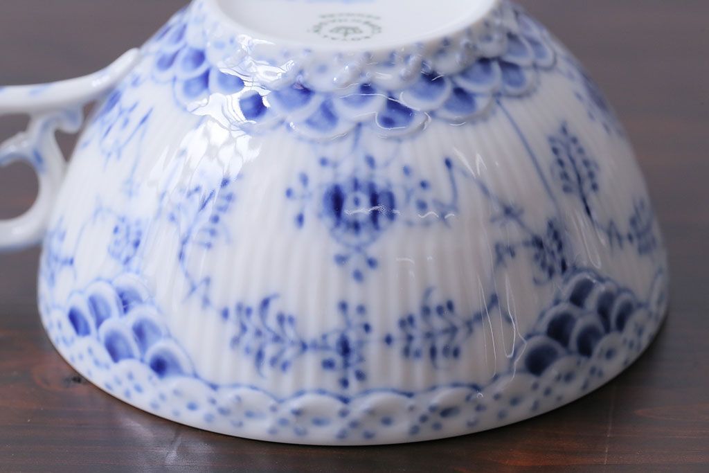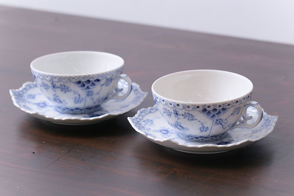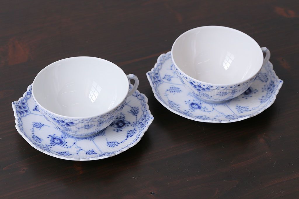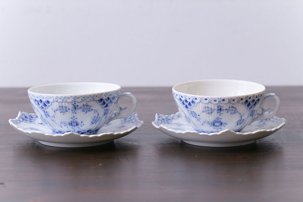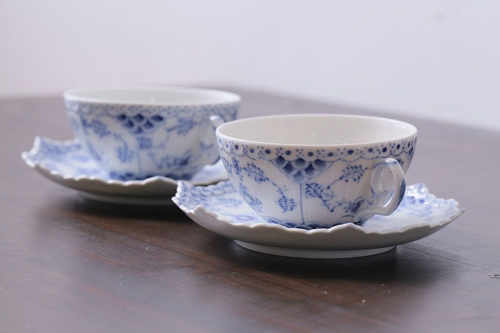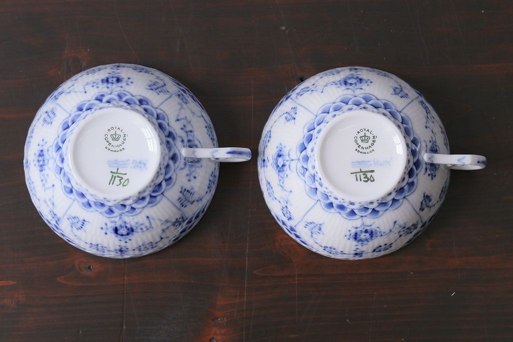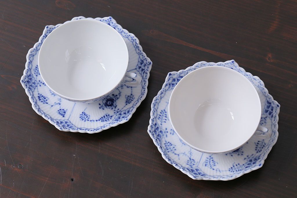 アンティーク雑貨 中古 ROYAL COPENHAGEN(ロイヤルコペンハーゲン) ブルーフルーテッド フルレース カップ&ソーサー(ティーカップ、洋食器)2客セット(定価約8万6千円)(1)