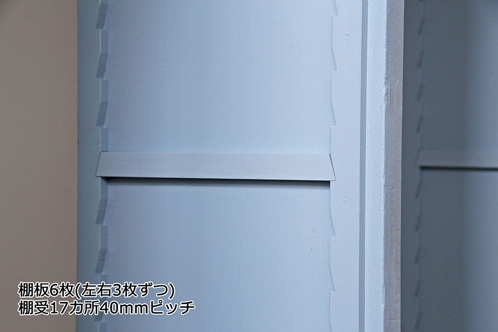 棚板は取り外しできます。棚板は6枚あります。棚受け穴は17ヶ所、40mmピッチで調整できます。棚幅サイズのものが1枚の作りです。