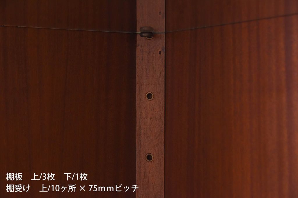 上段の棚板は取り外しできます。棚板は3枚、棚受け穴は10ヶ所あります。75mmピッチで調整できます。