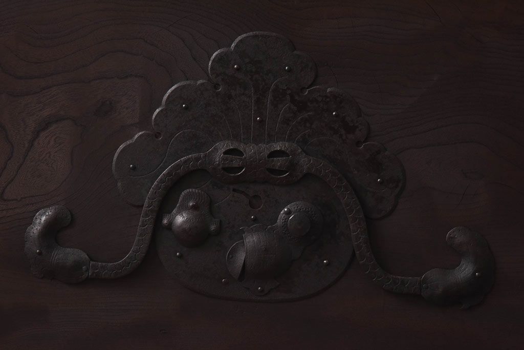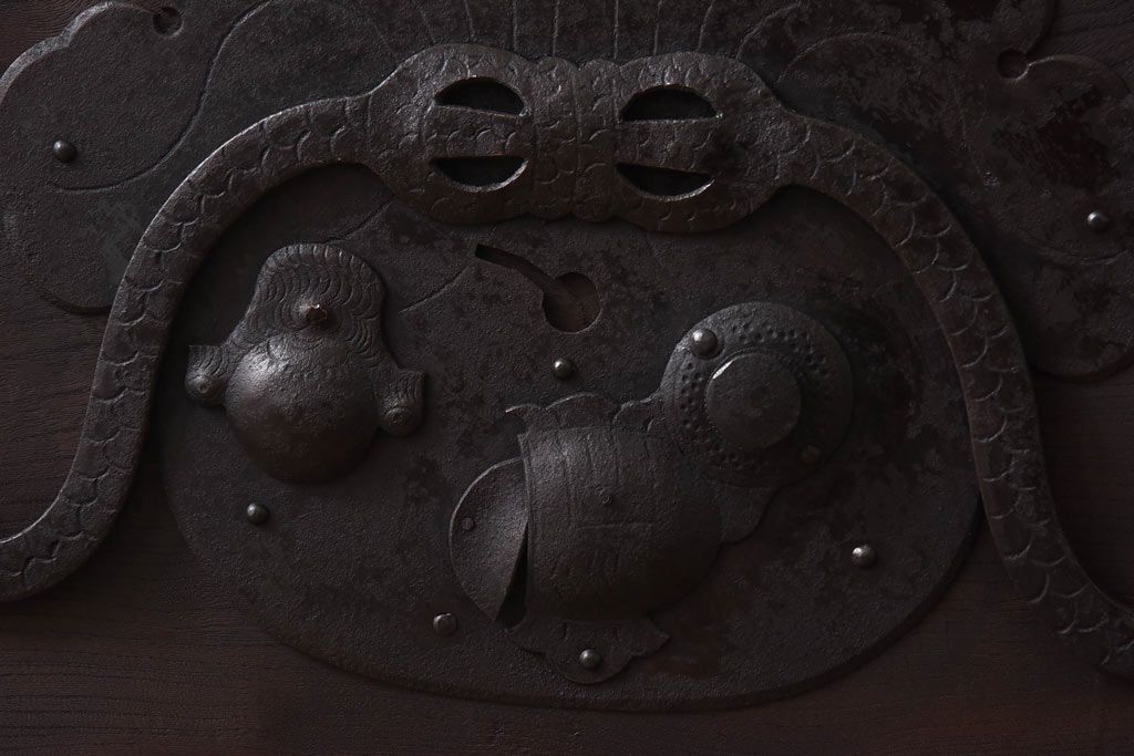 ラフジュ工房> ドア・建具> 玄関ドア・玄関戸 > 和製アンティーク 金網入り! 大振りの金具が目を惹く鉄格子蔵戸(引き戸、蔵戸、玄関戸)