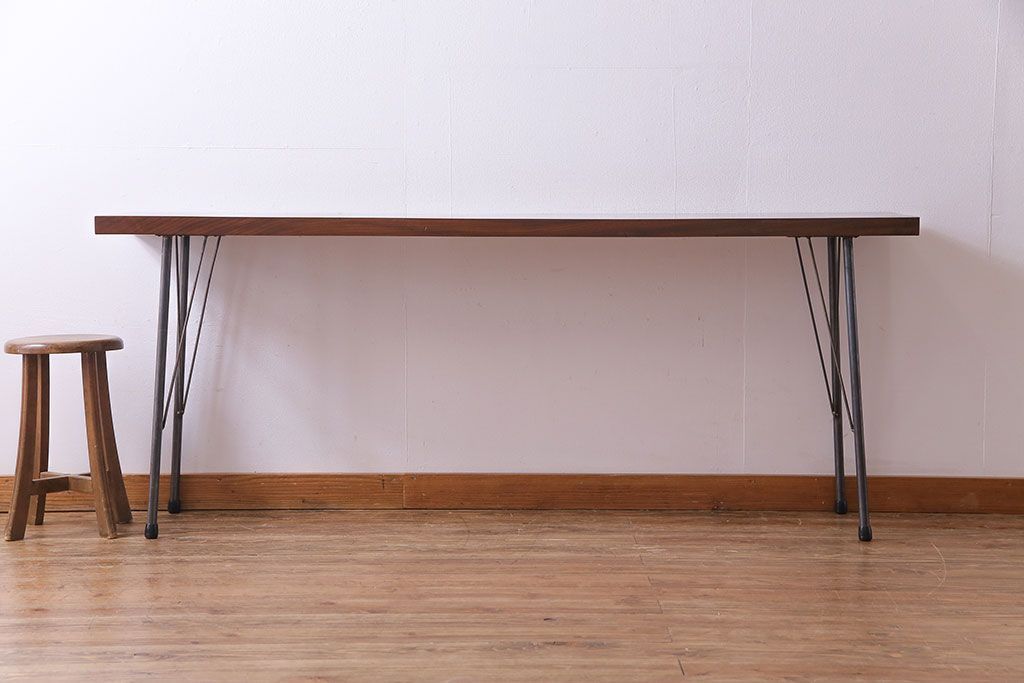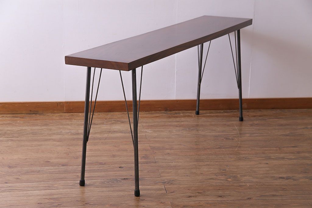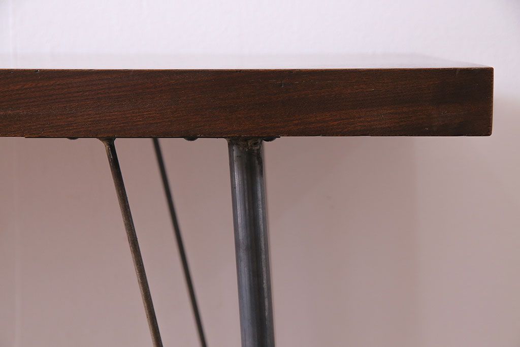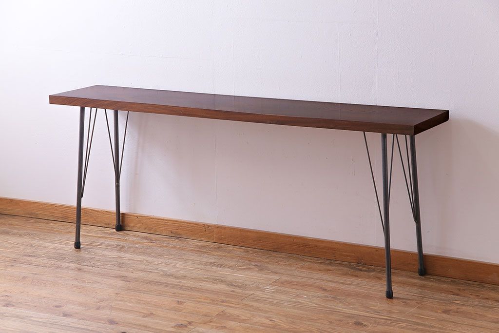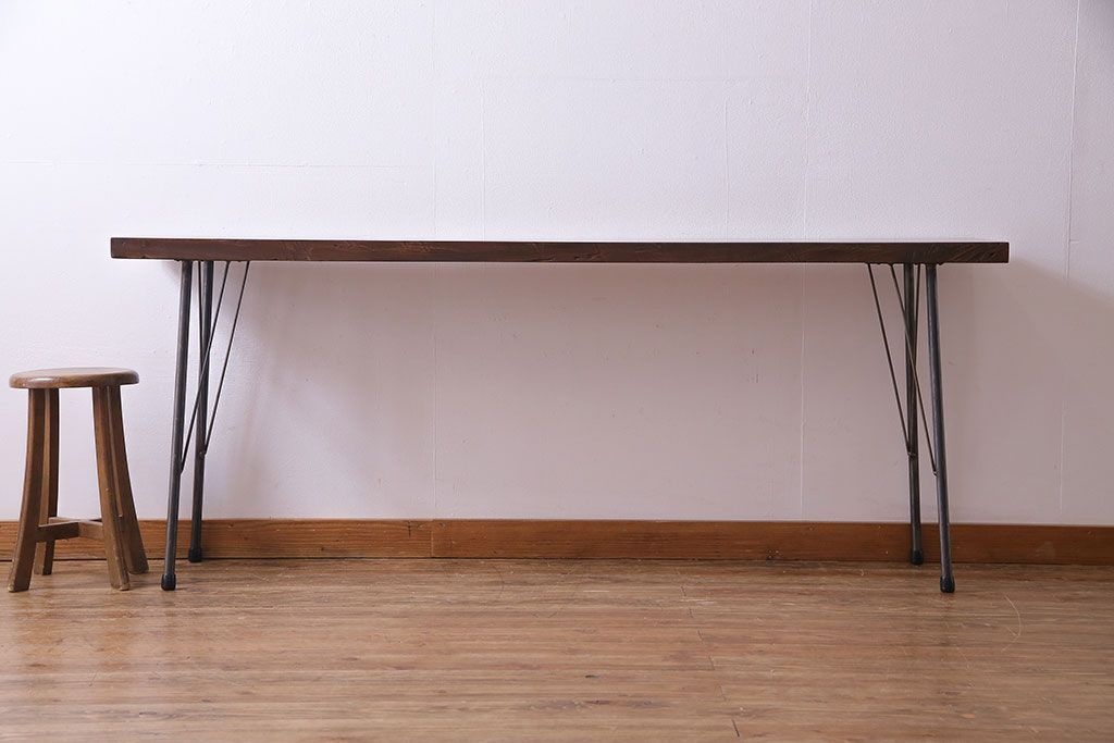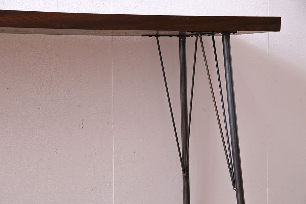 味わい深い古材の質感が魅力的な、リメイクの鉄脚テーブルです。美しい木目のケヤキ材を天板に使用し、当店で鉄脚を取り付けました。シンプルながらもスタイリッシュなデザインが、お部屋に洗練された印象を与えてくれますよ。作業台としてはもちろん、コンソールテーブルとしてのご使用もおすすめです。ご自宅だけではなく、店舗やカフェなどにもいかがでしょうか。