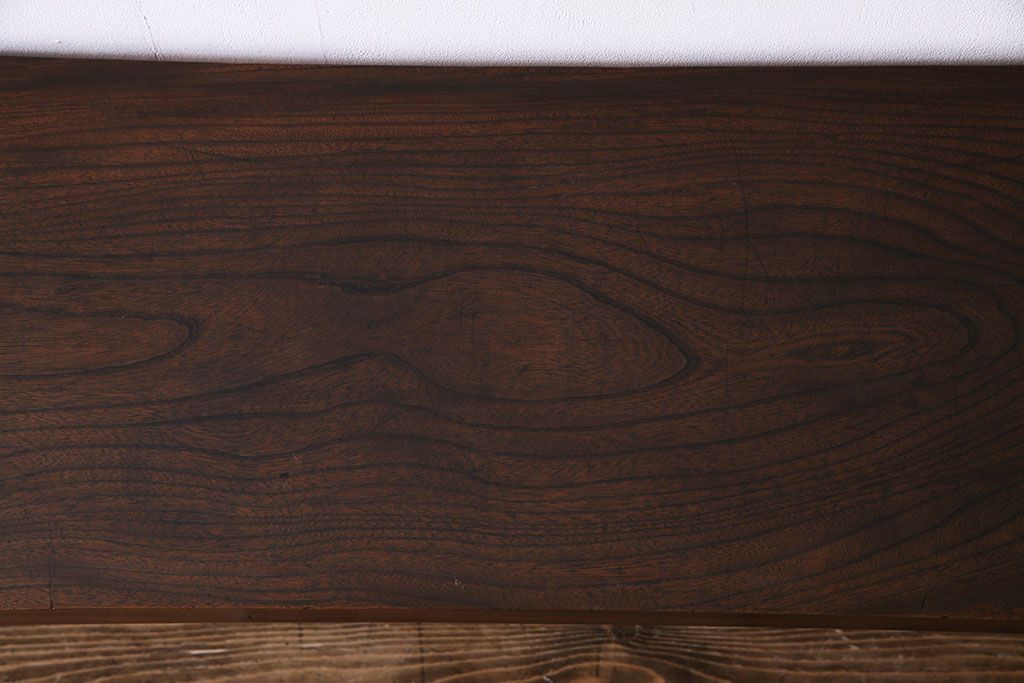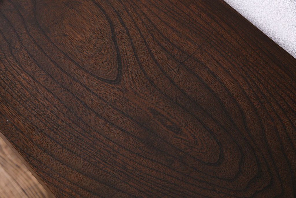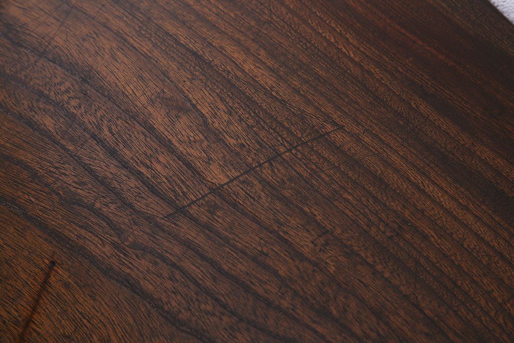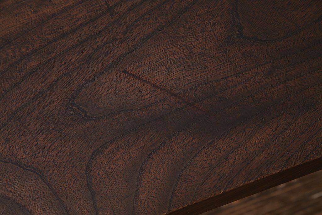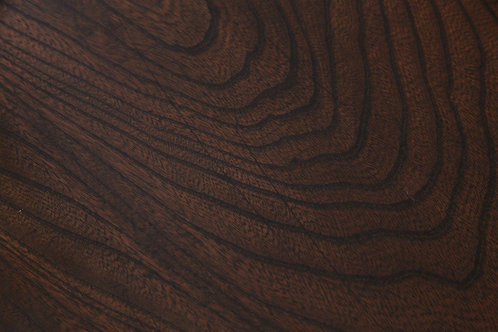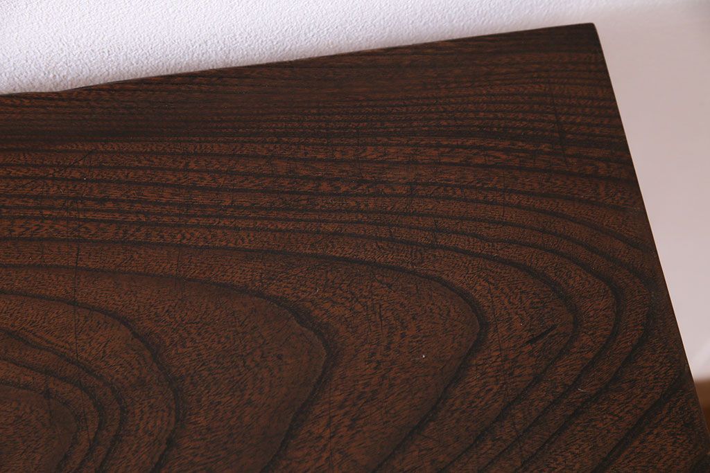 動きのある木目が美しいケヤキ材の天板です。天板には当店でクリア塗装を施しているため、汚れが染み込まず日頃のお手入れもさっと拭くだけで簡単です。