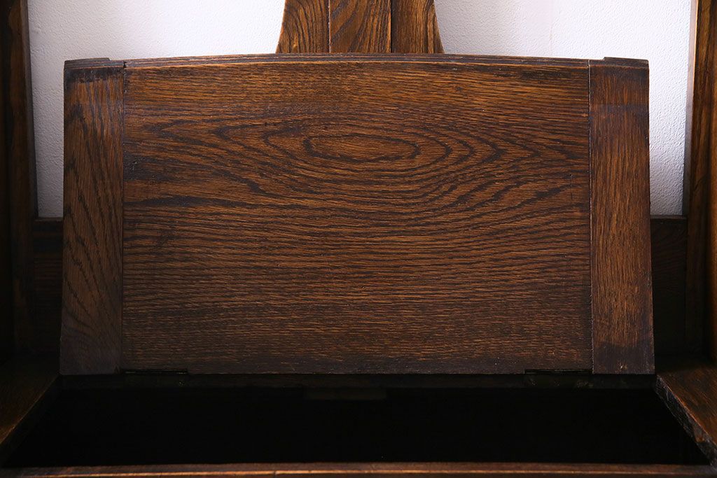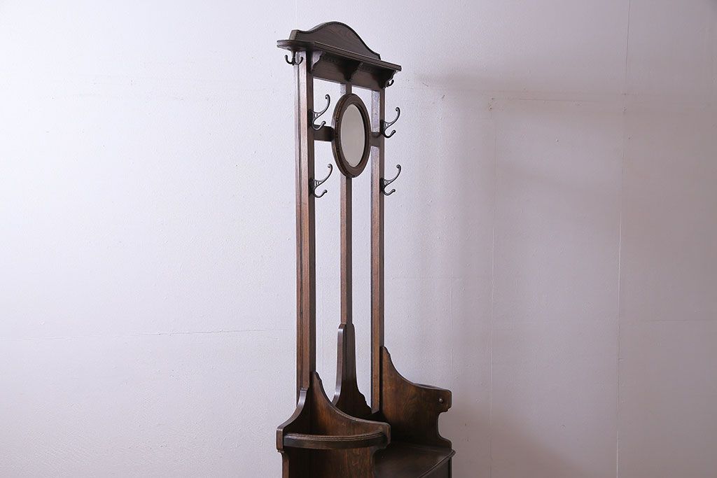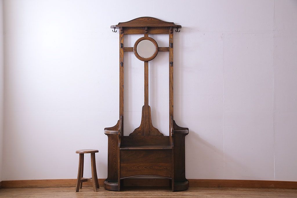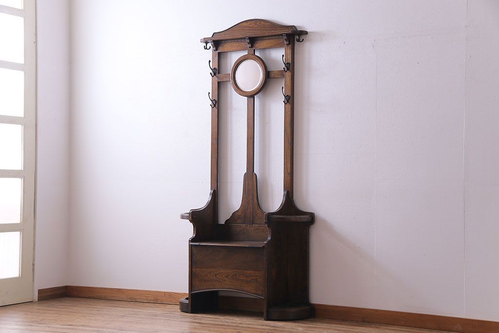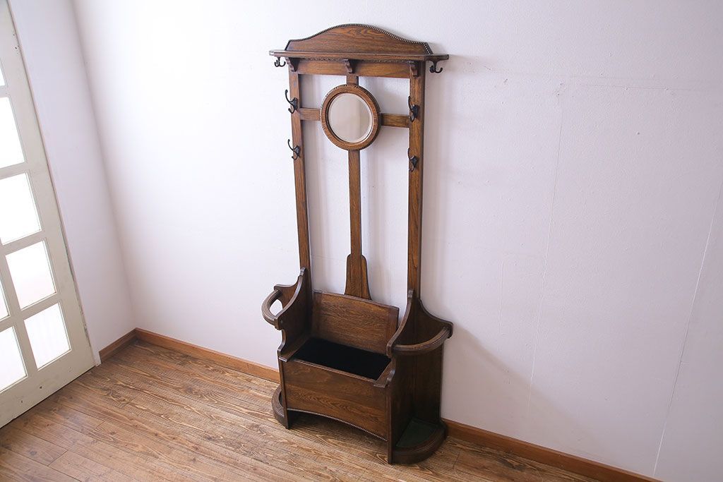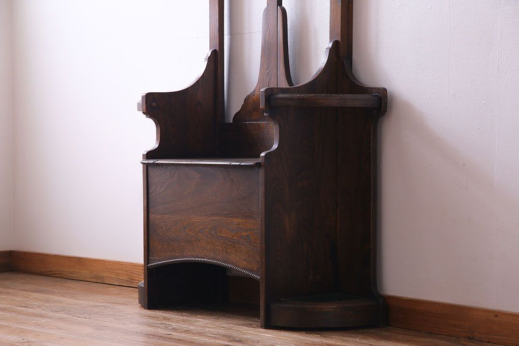 アンティーク雑貨 イギリスアンティーク オーク材 重厚感を放つ機能的なベンチ付きホールスタンド(傘立て、コート掛け)