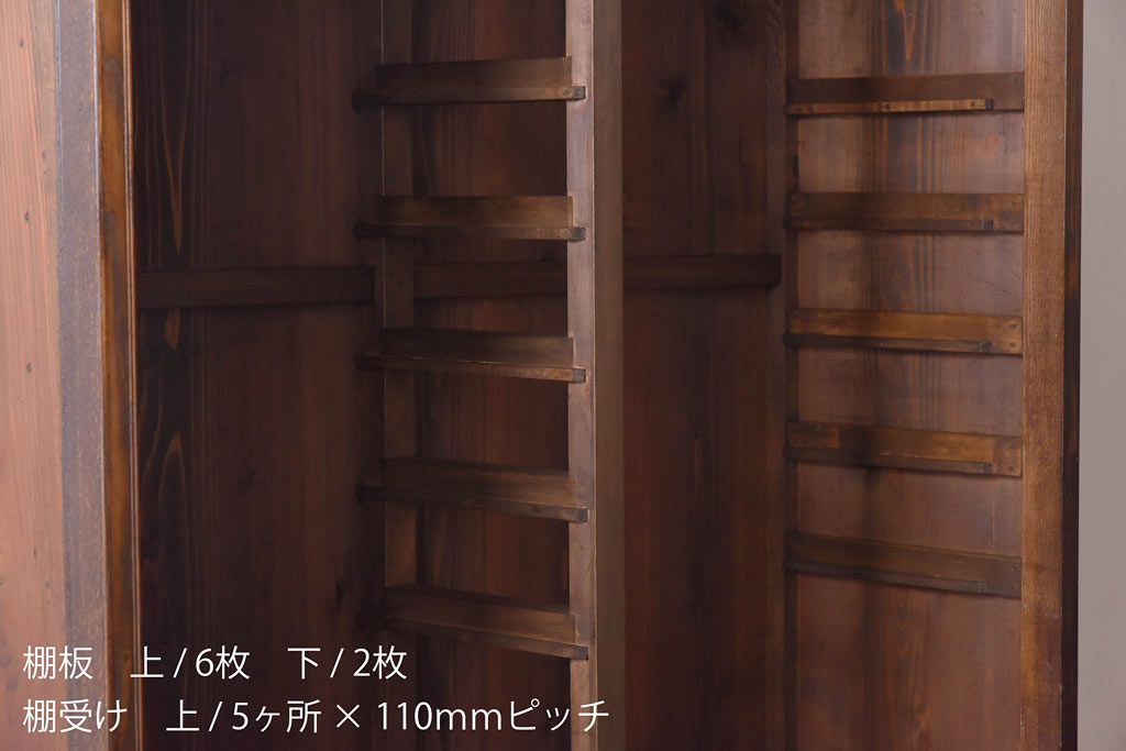 棚板は取り外しできます。上段は棚板6枚、棚受け穴5ヶ所、110mmピッチで調整できます。下段は棚板2枚、棚受け穴1ヶ所あります。棚板は左右でわかれています。