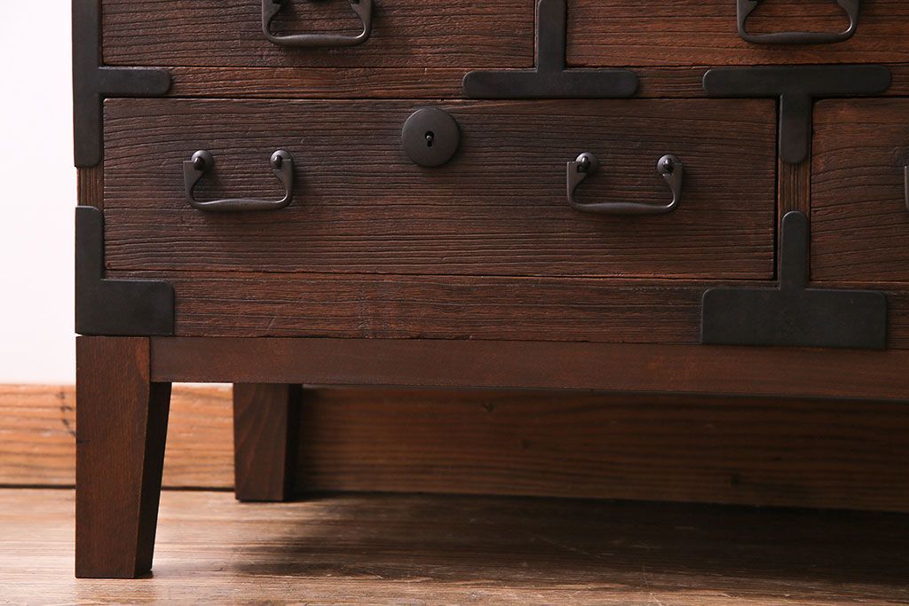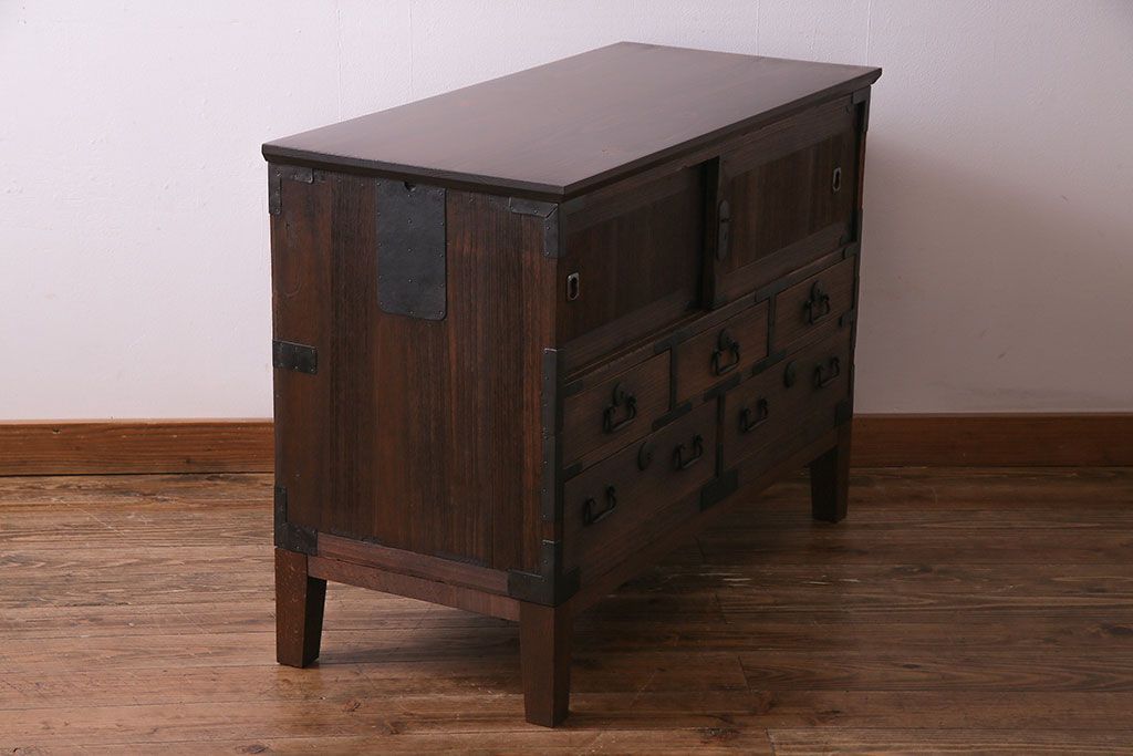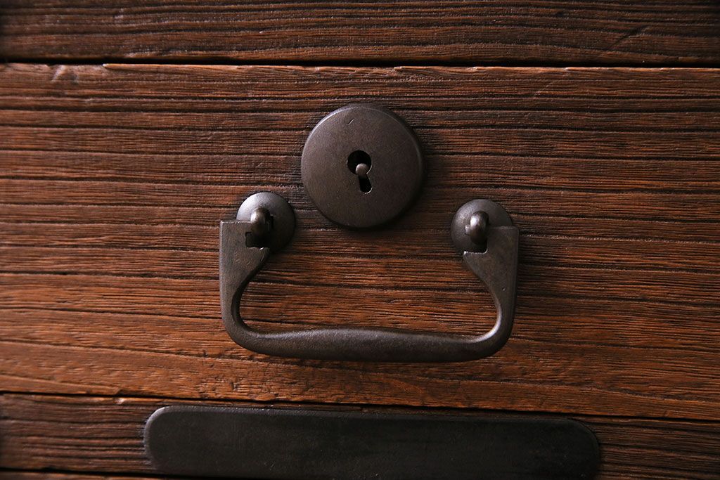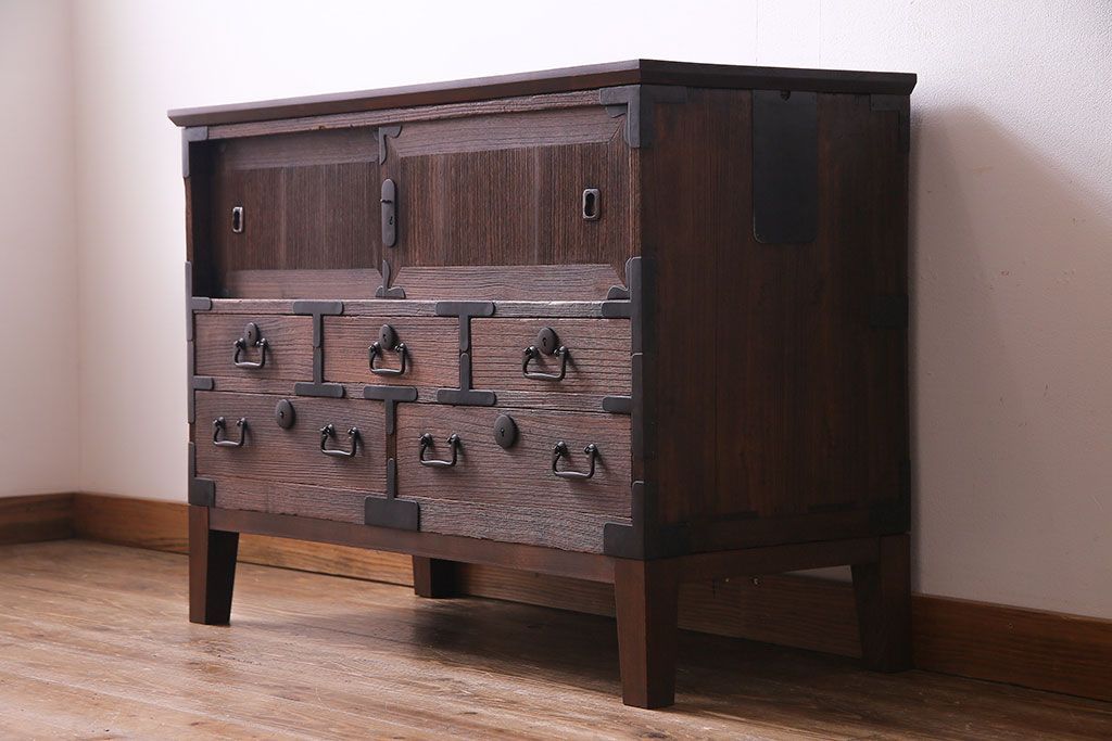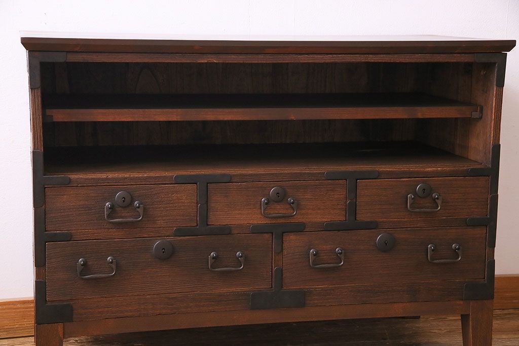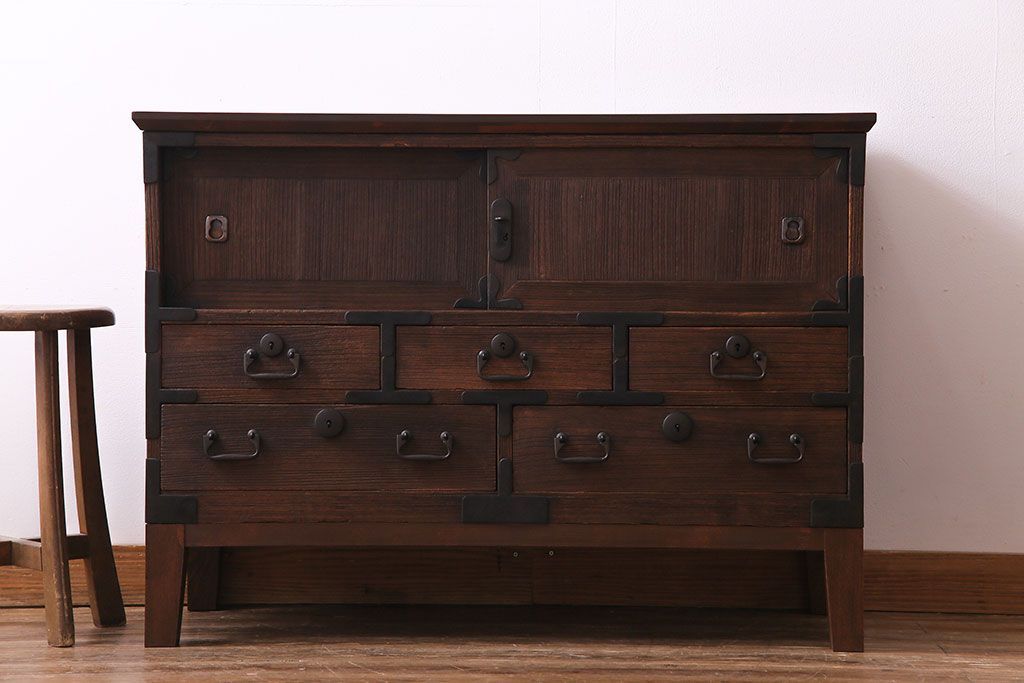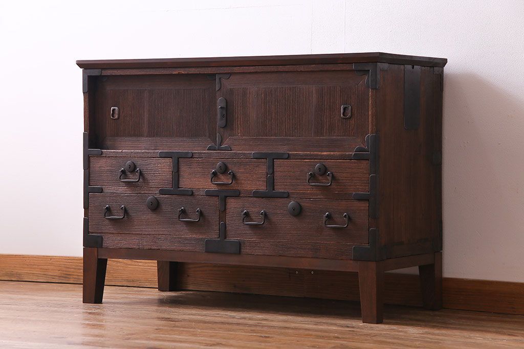 アンティーク家具 和製アンティーク 渋い木の質感と丸みのある金具が魅力的な脚付き箪笥ローボード(ローチェスト、リビングボード)