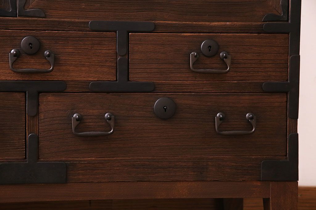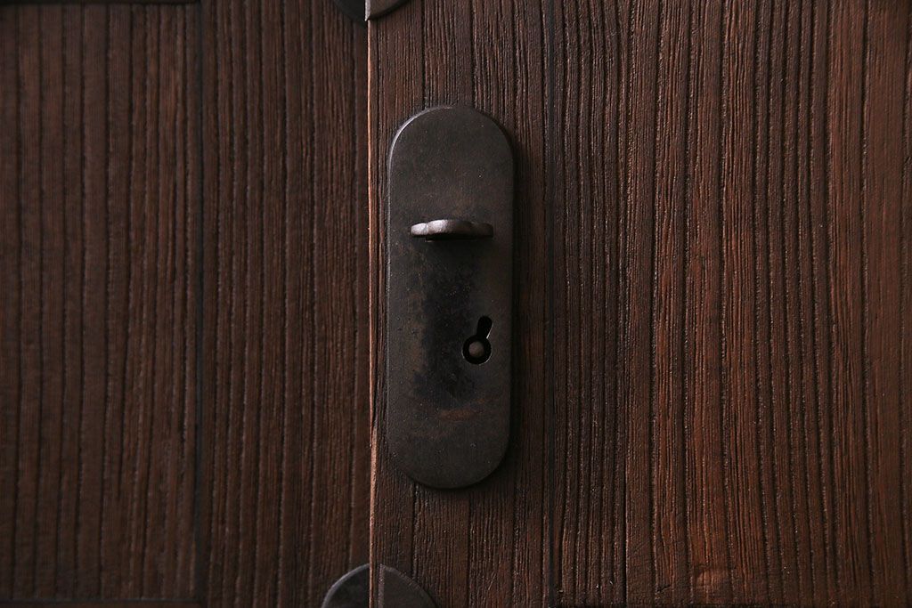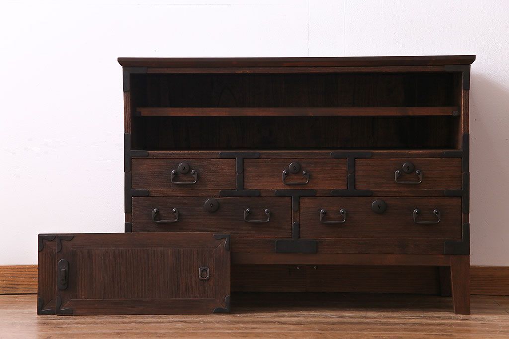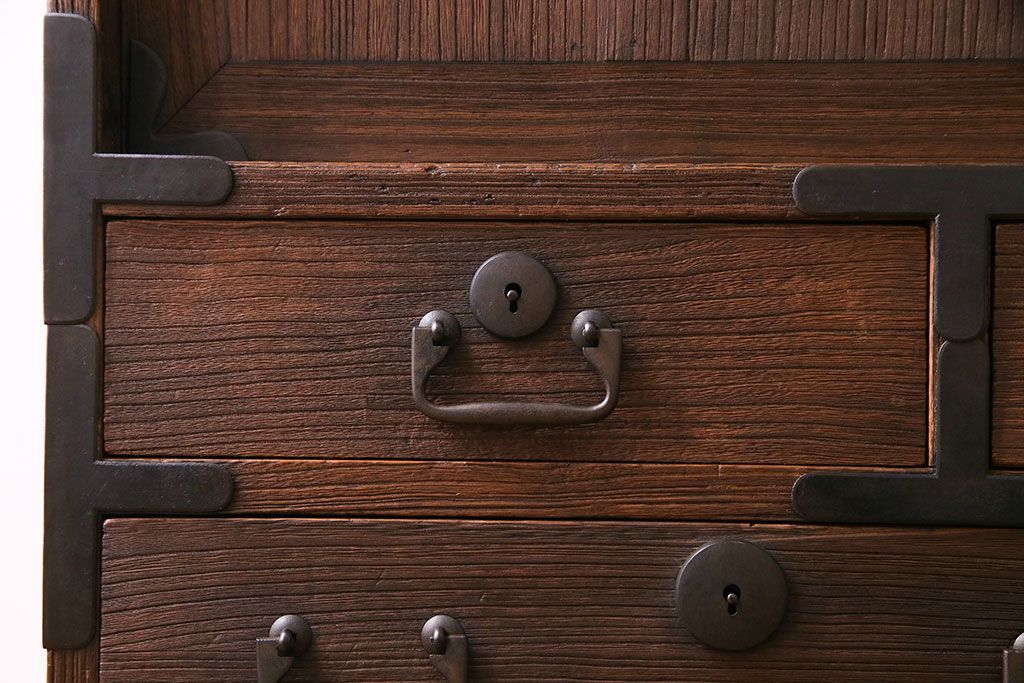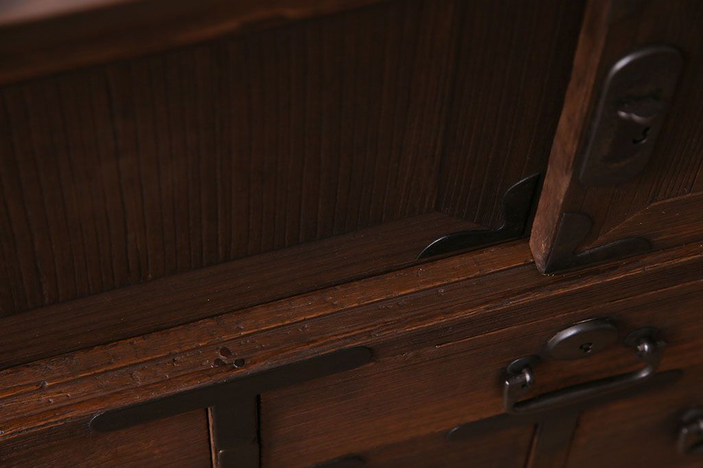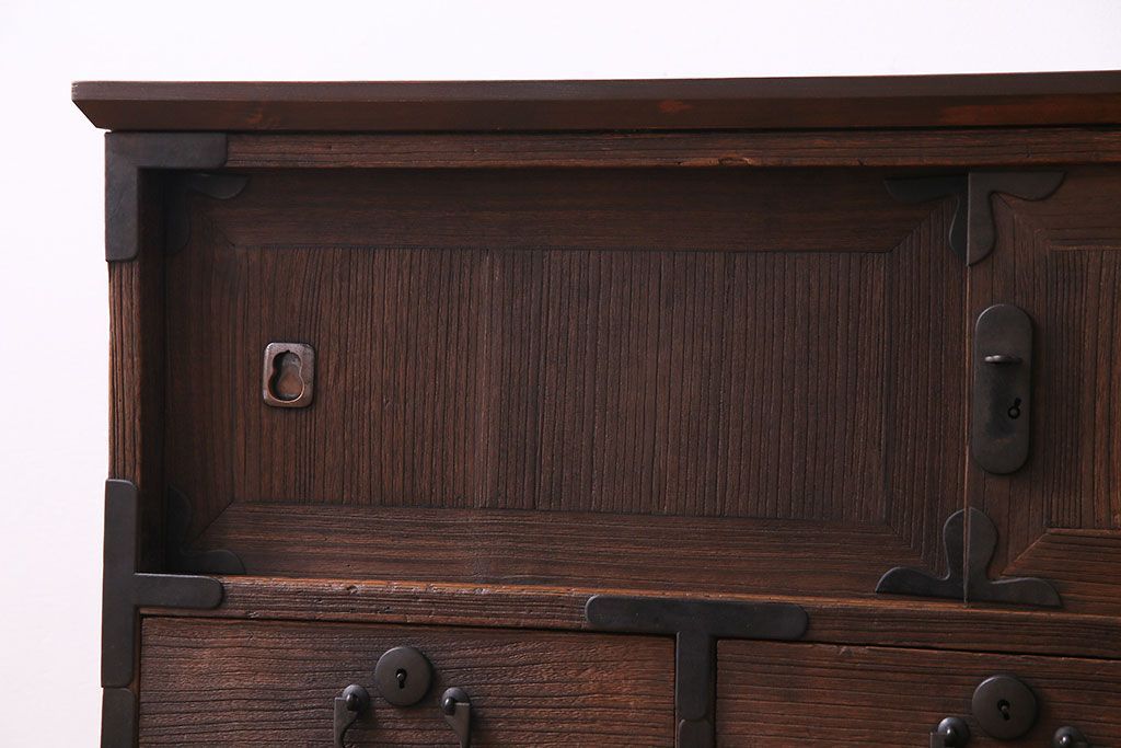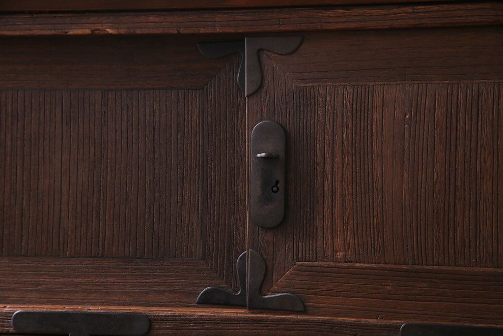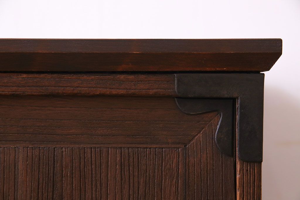 アンティーク家具 和製アンティーク 渋い木の質感と丸みのある金具が魅力的な脚付き箪笥ローボード(ローチェスト、リビングボード)
