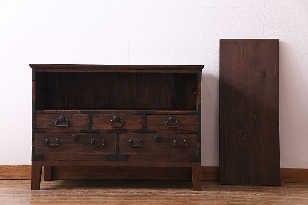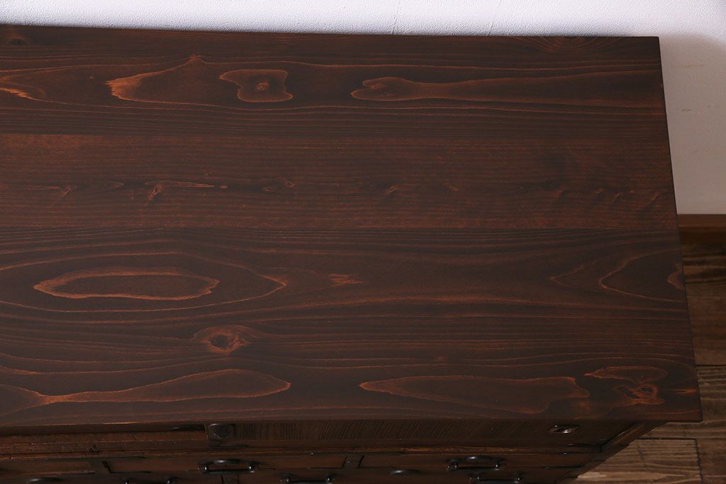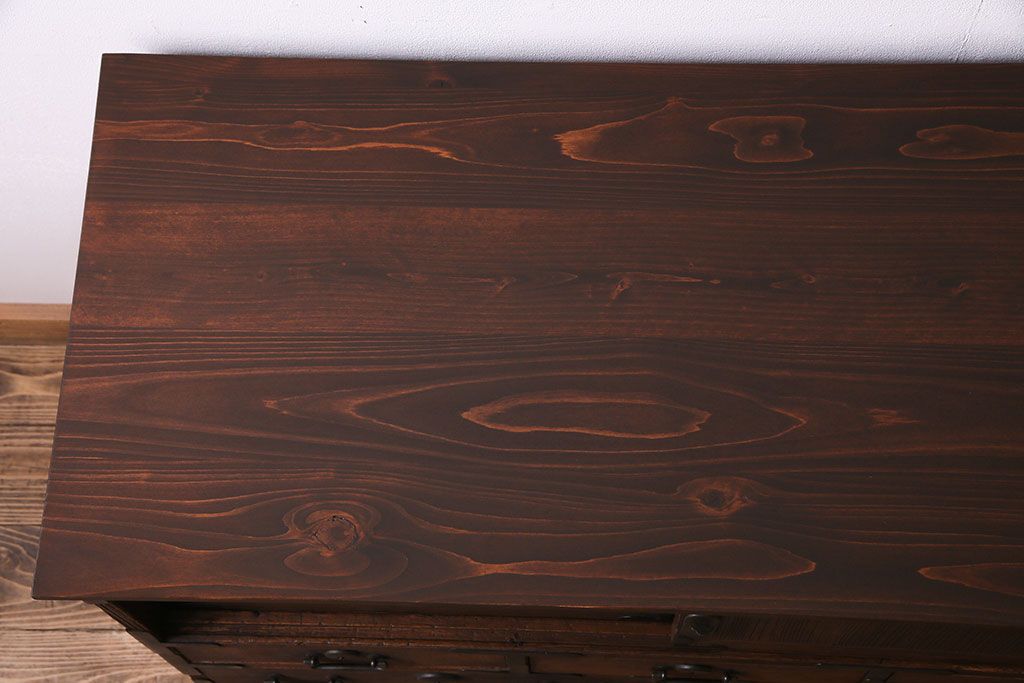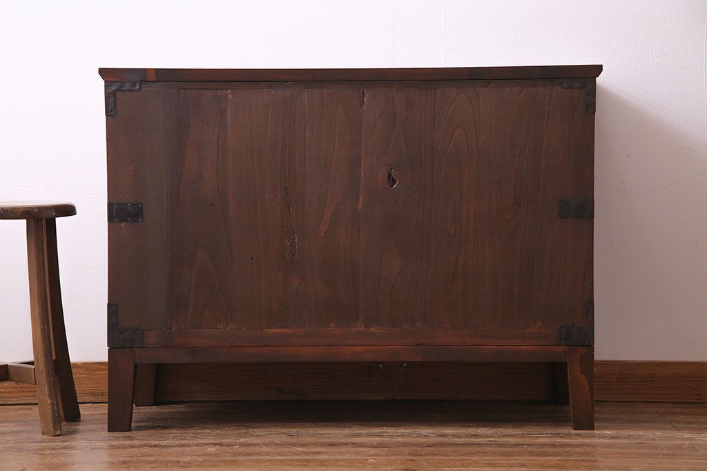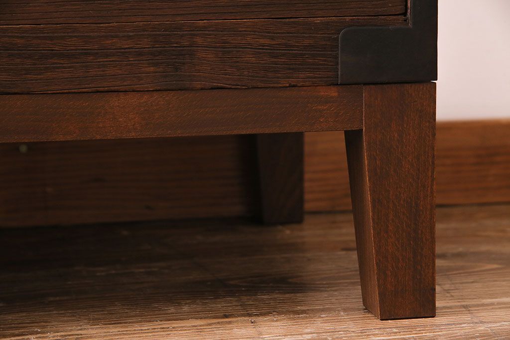 和製アンティーク 渋い木の質感と丸みのある金具が魅力的な脚付き箪笥ローボード(ローチェスト、リビングボード)です。