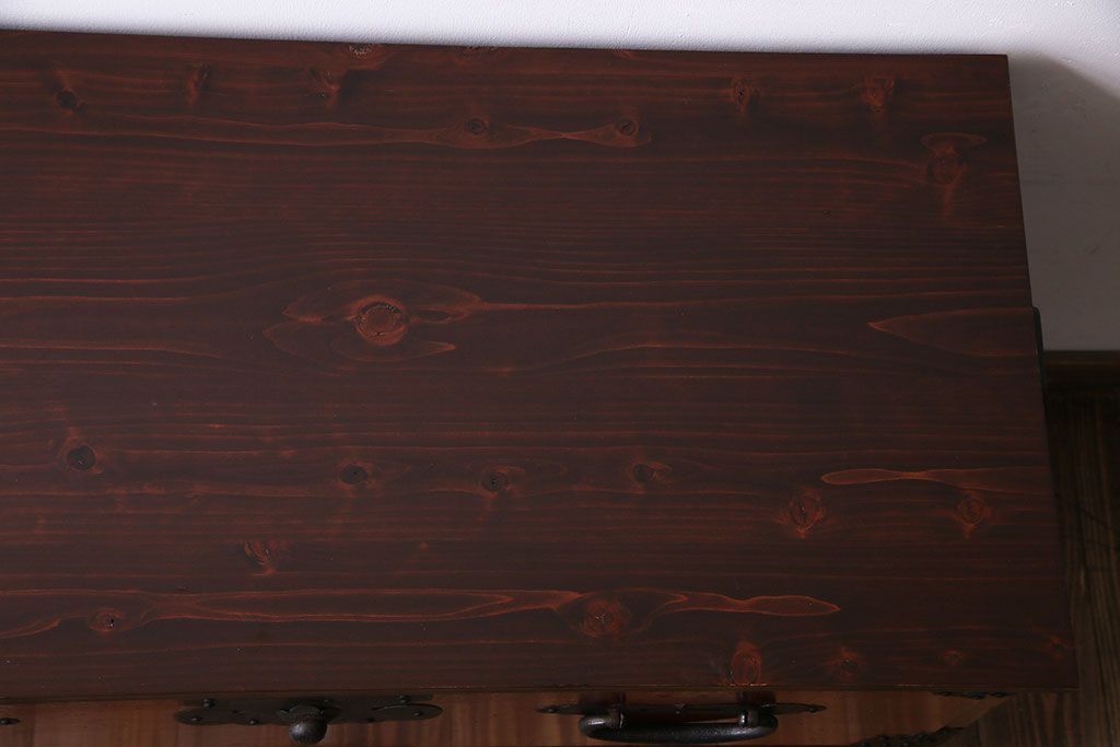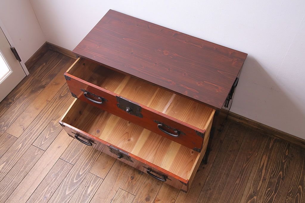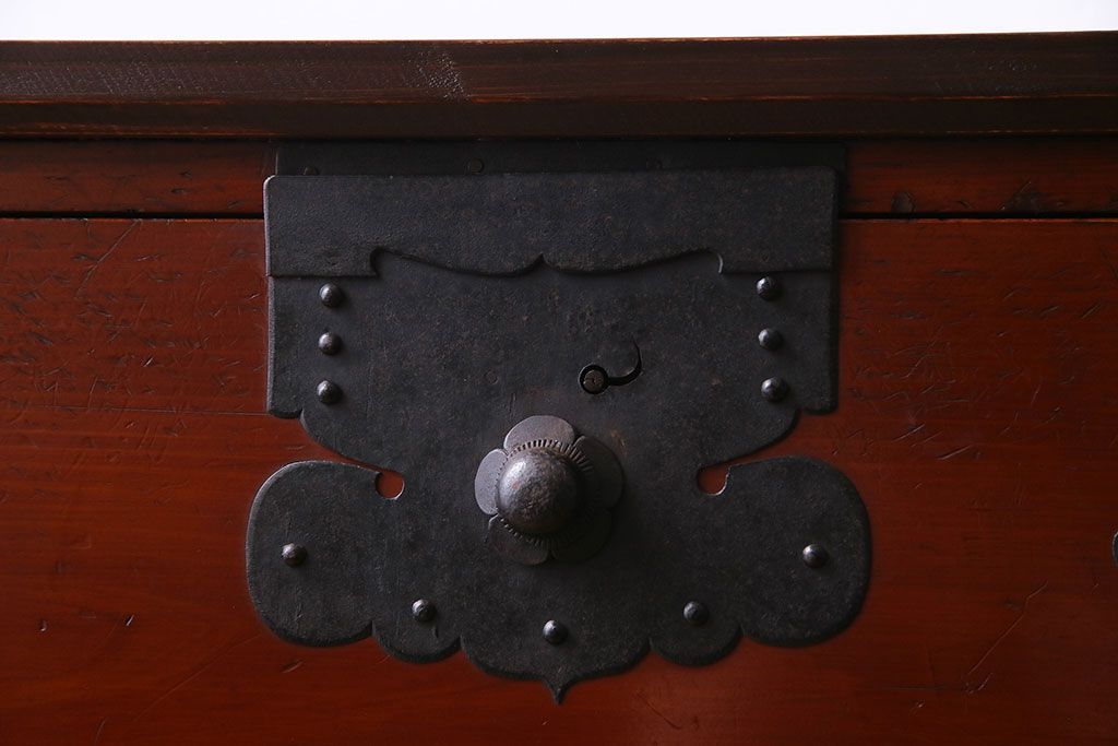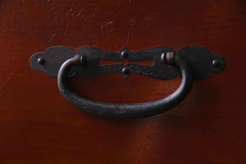 赤みがかった箪笥の色合いと金具や鉄との組み合わせが