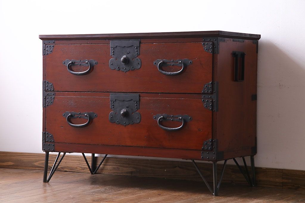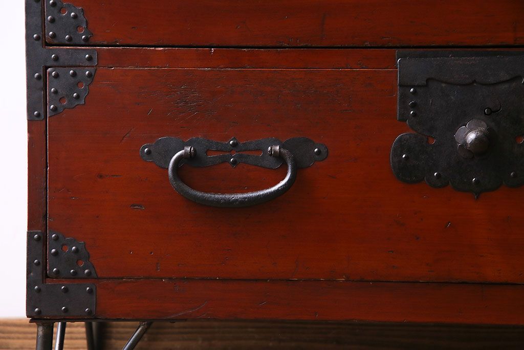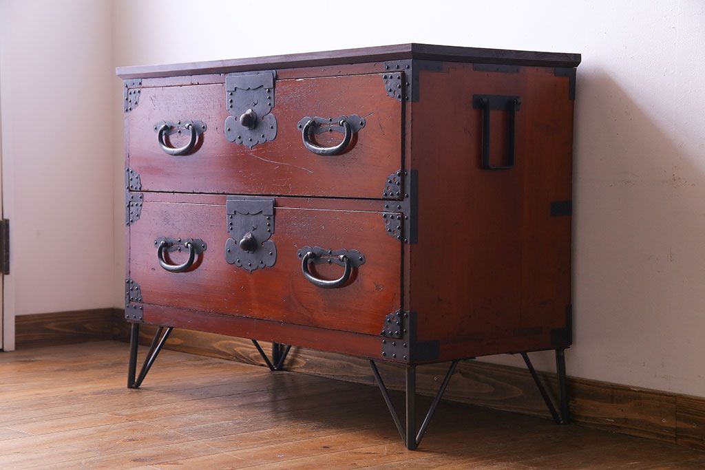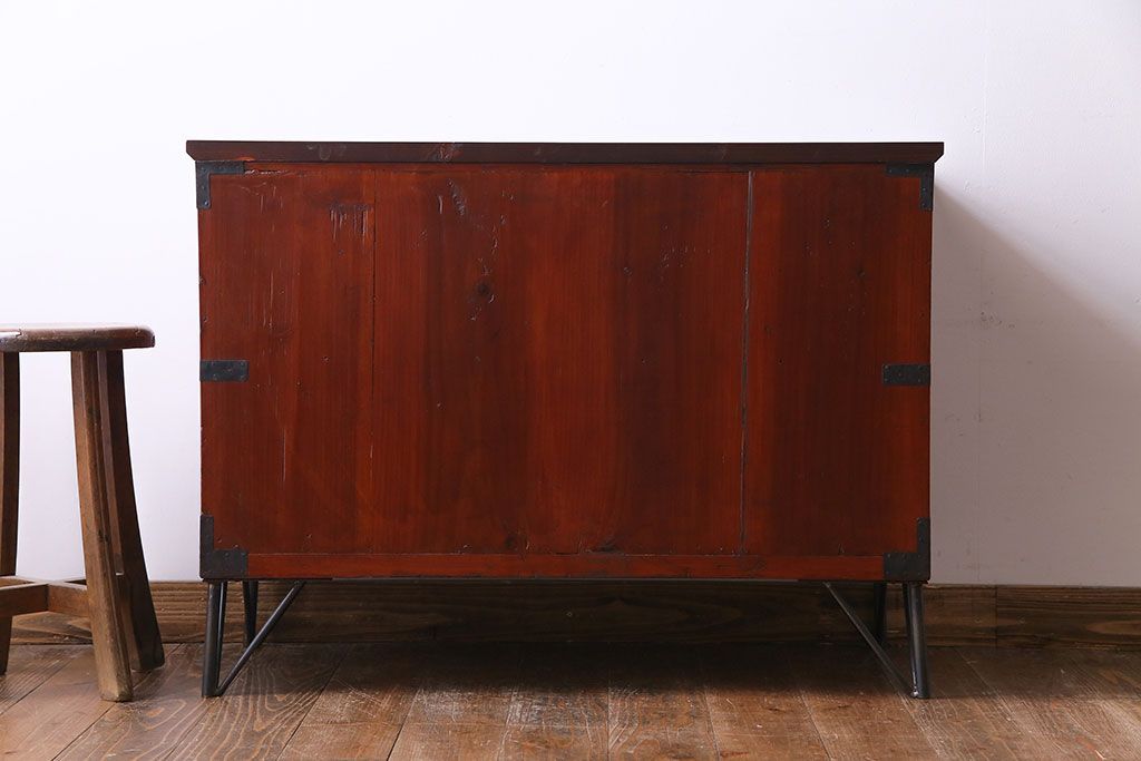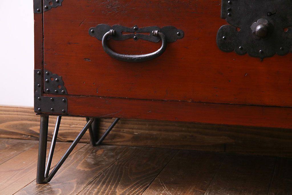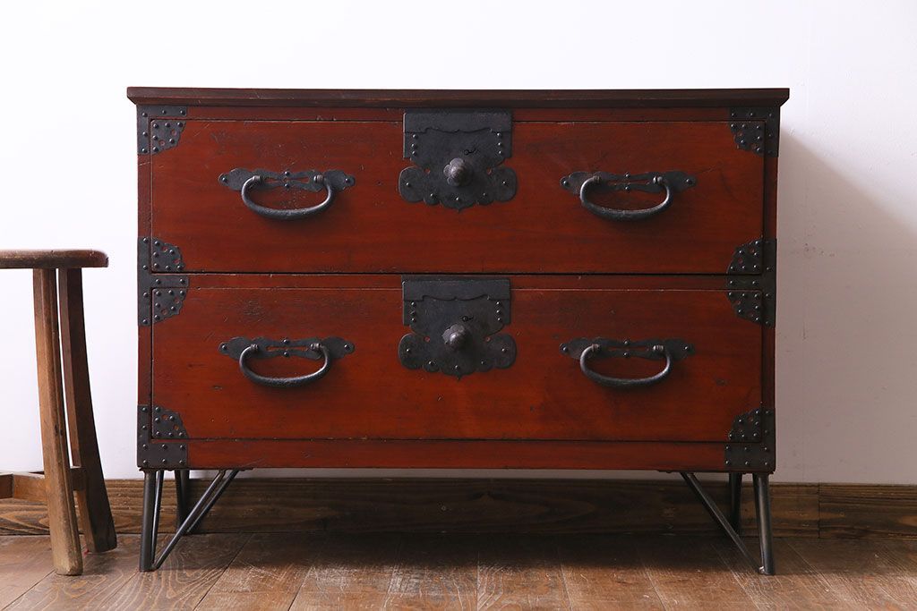 アンティーク家具 和製アンティーク リメイク 鉄脚付き 朱色の時代箪笥ローボード(テレビボード、ローチェスト)(1)