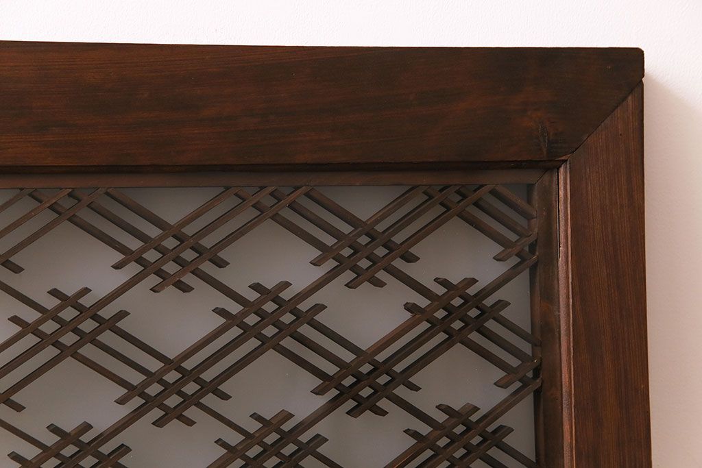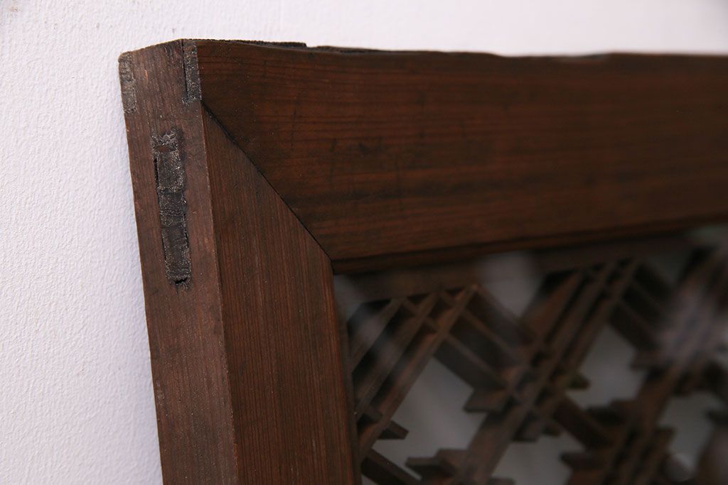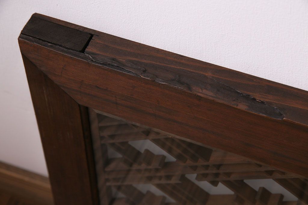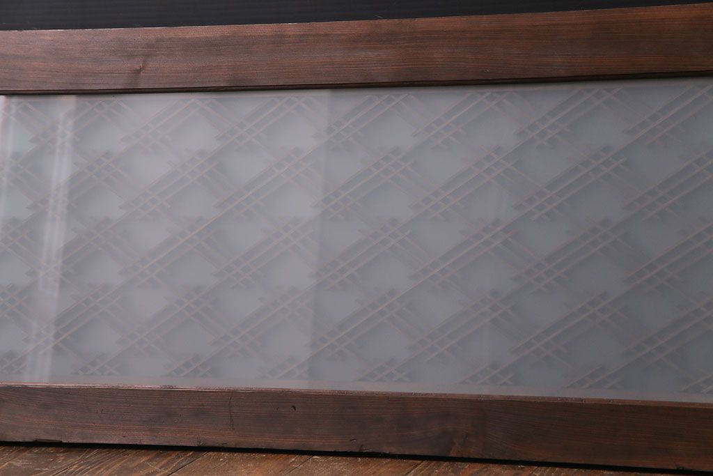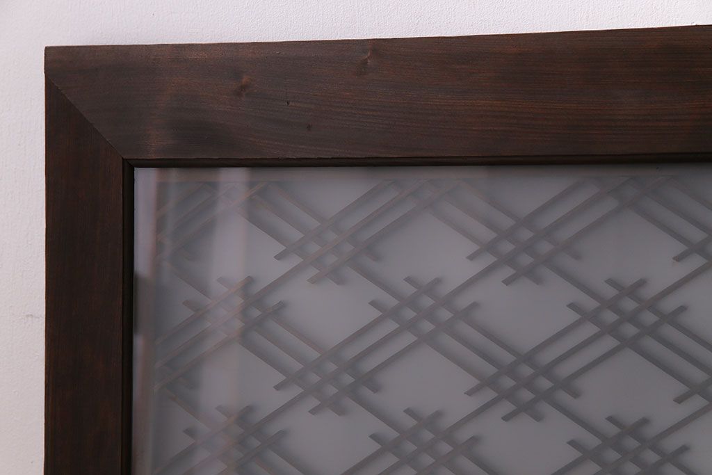 幾何学的なデザインが魅力の割菱組子欄間(ガラス欄間、はめ殺し戸)(2)です。 割菱の幾何学的なデザインが魅力の 昭和初期の組子欄間です。 繊細な雰囲気が漂う欄間を取り入れれば お部屋もひとつ上の演出ができますよ。 裏側に曇りガラスが入った両面ガラスなので、 お手入れもしやすいです。 和モダンなお部屋のアクセントにもおすすめです。 使用上問題のあるダメージはありません。 ■框サイズ 上65mm/左55mm/右55mm/下55mm ■重量 約9kg