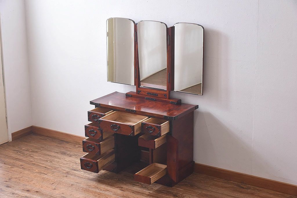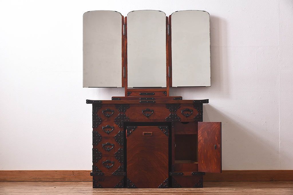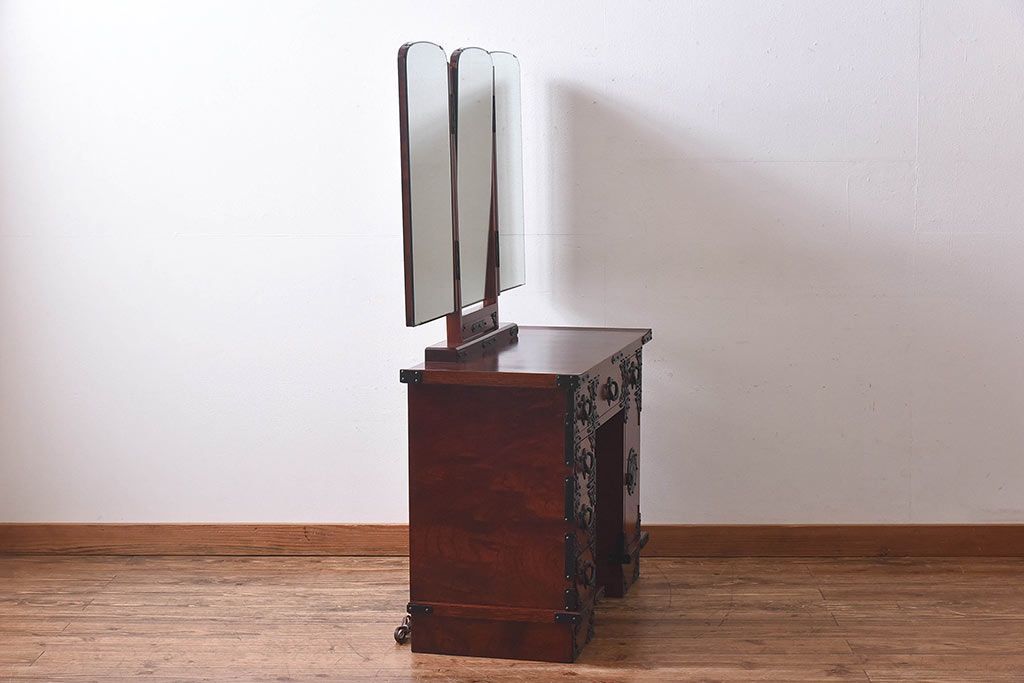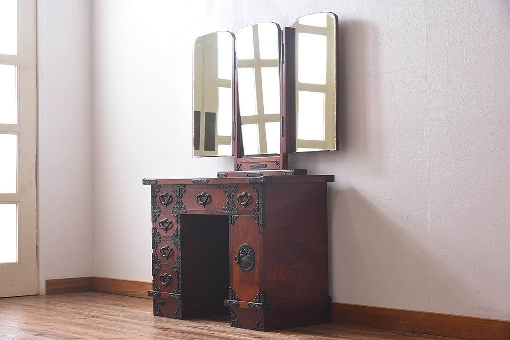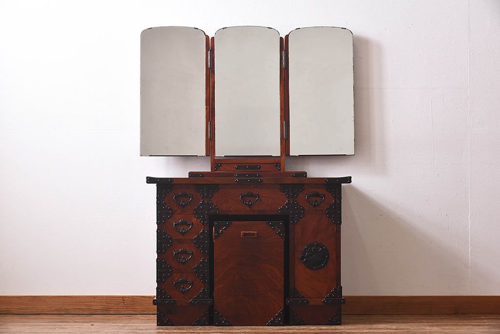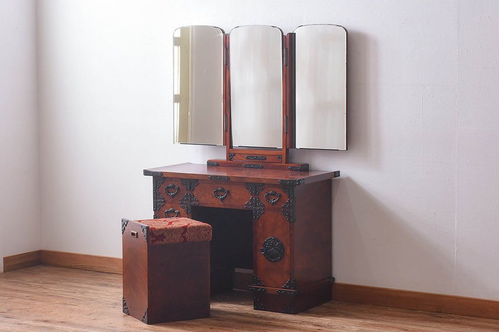 中古 岩谷堂箪笥 スツール付き 金具の装飾が見事な三面鏡(鏡台、ドレッサー)
