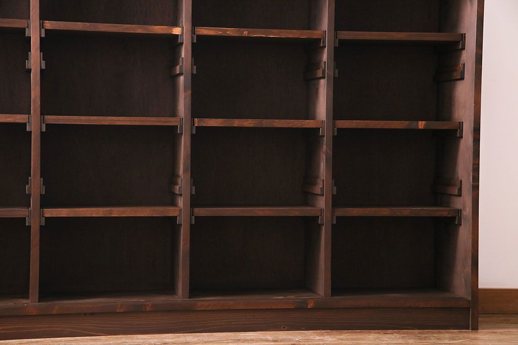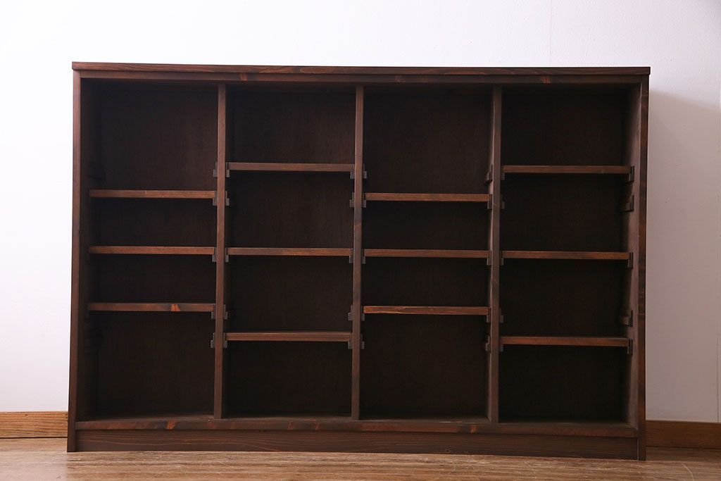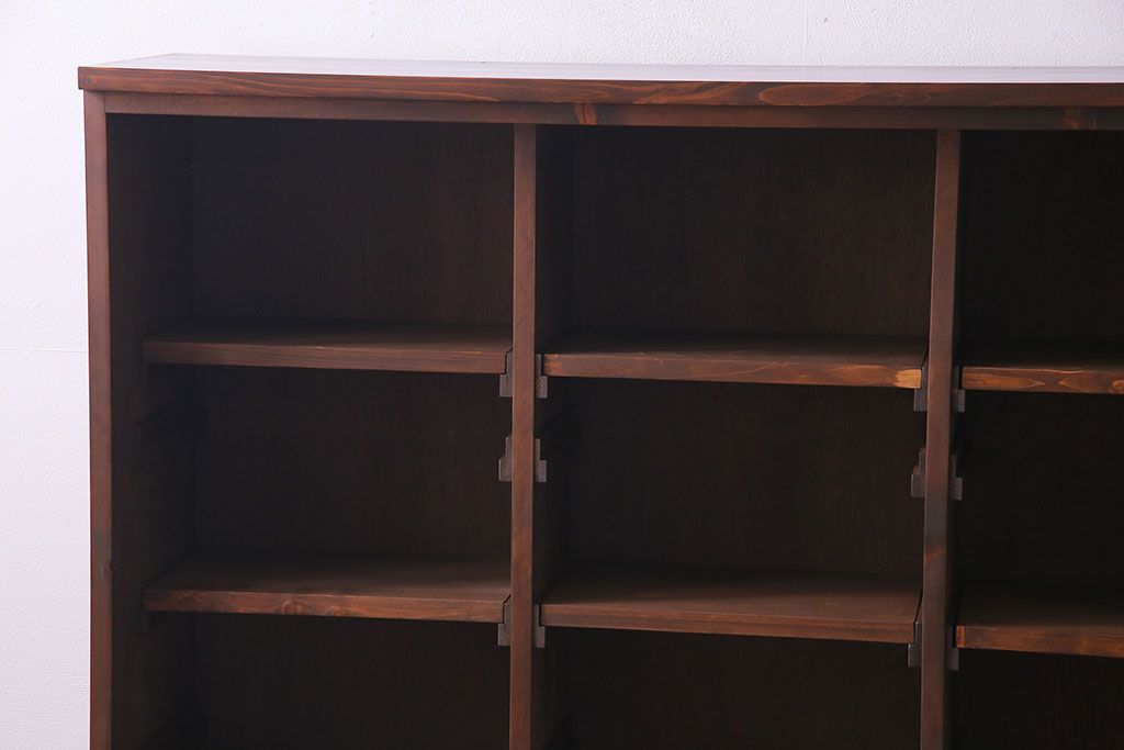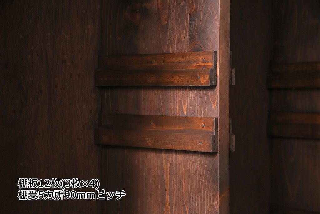 棚板は取り外しできます。棚板は各3枚・計12枚あります。棚受け穴は各5ヶ所、90mmピッチで調整できます。棚幅サイズのものが1枚の作りです。