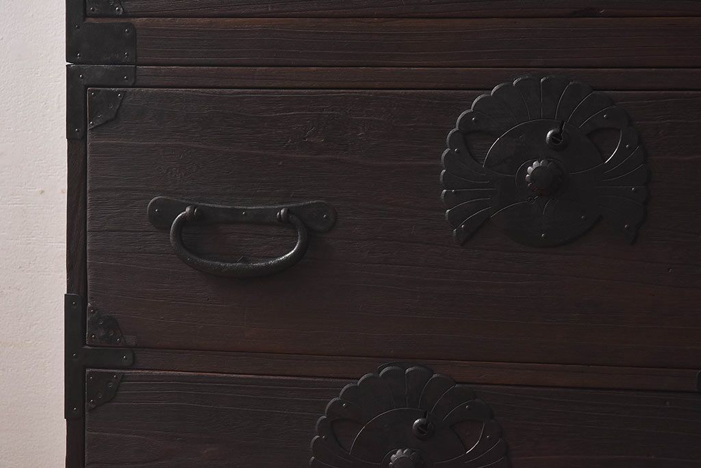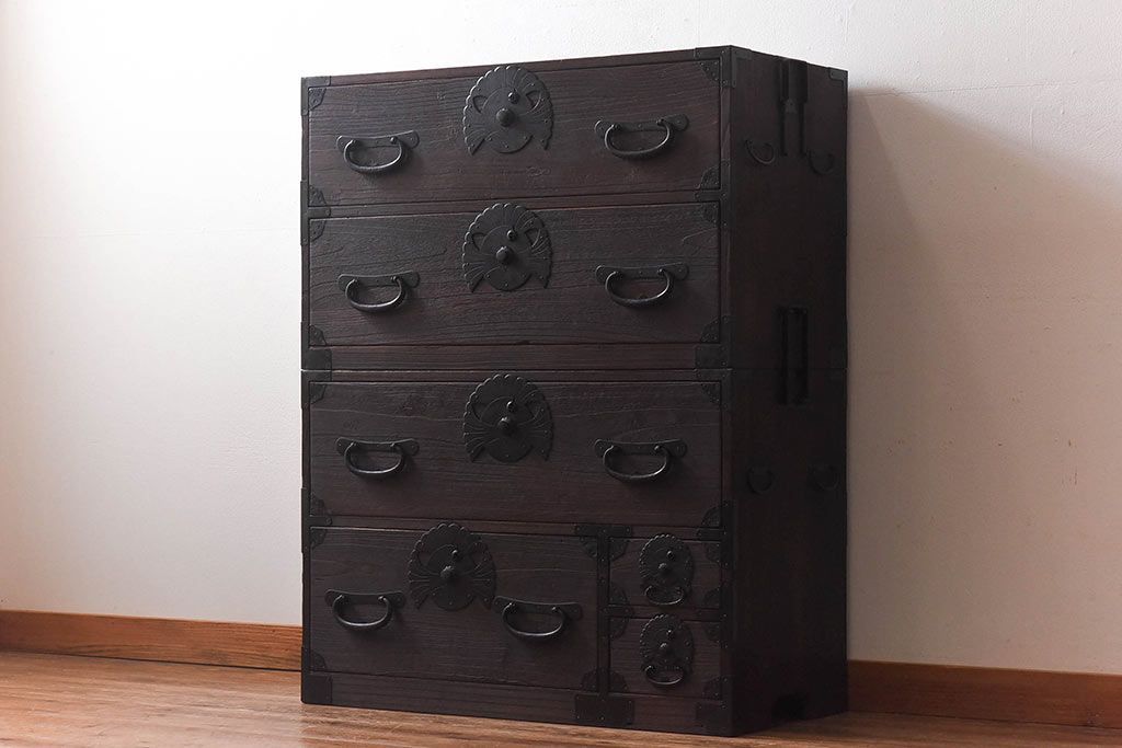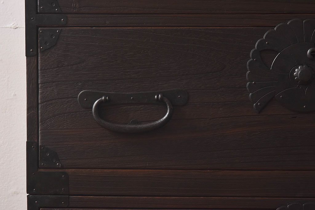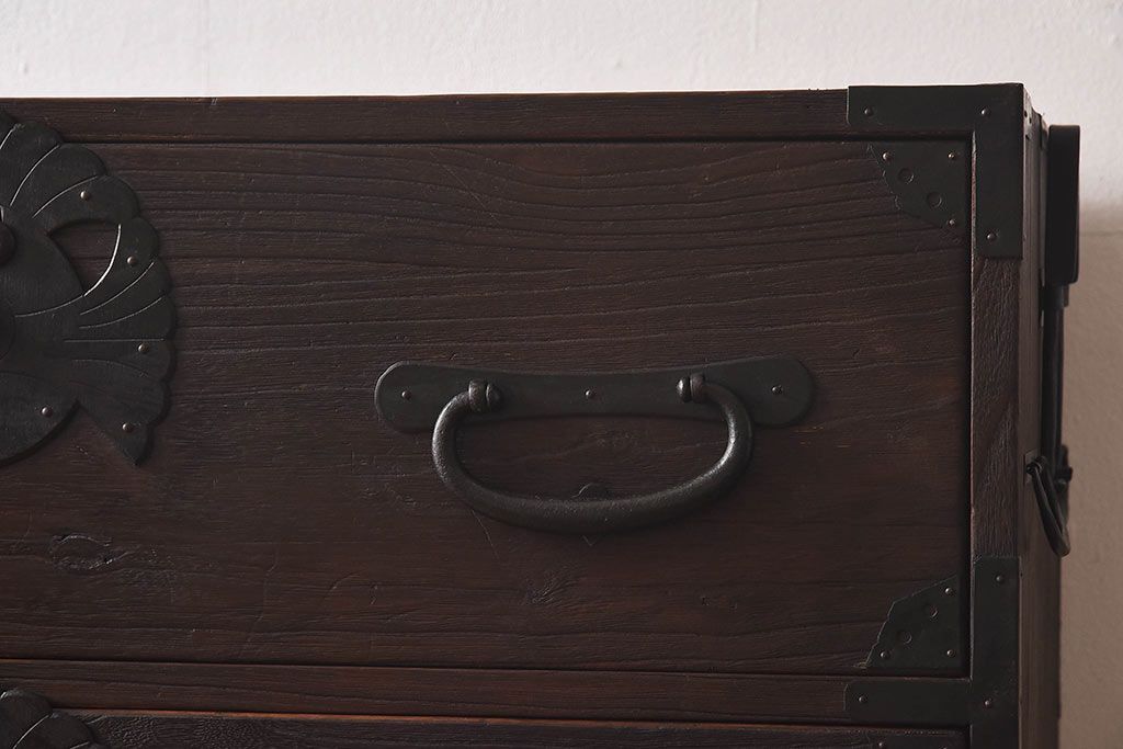和箪笥> 衣装箪笥 > アンティーク家具 和製アンティーク 総桐材 縁起のよい「ふくら雀」金具のついたチェスト(重ね箪笥、引き出し、桐箪笥、桐たんす)