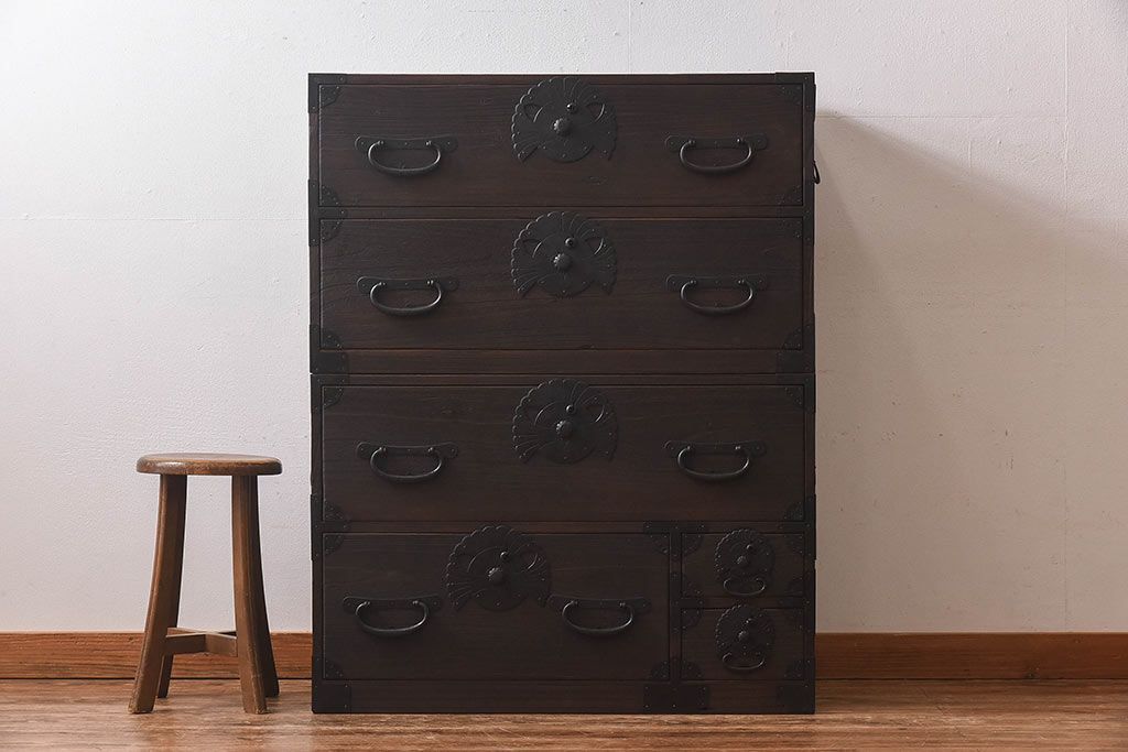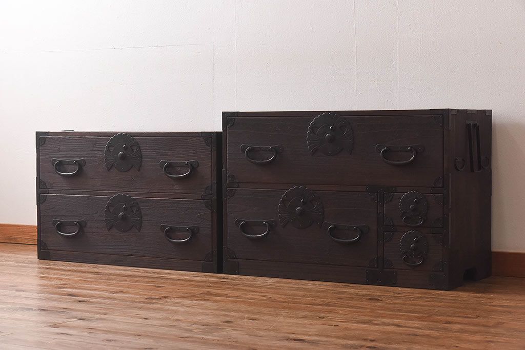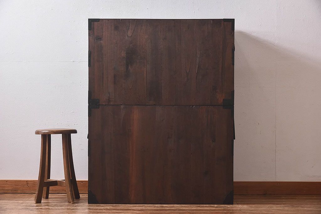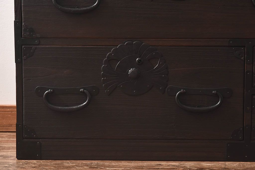 和箪笥 > アンティーク家具 和製アンティーク 総桐材 縁起のよい「ふくら雀」金具のついたチェスト(重ね箪笥、引き出し、桐箪笥、桐たんす)