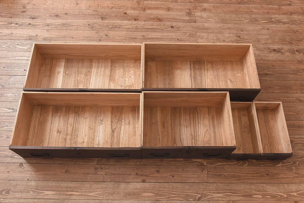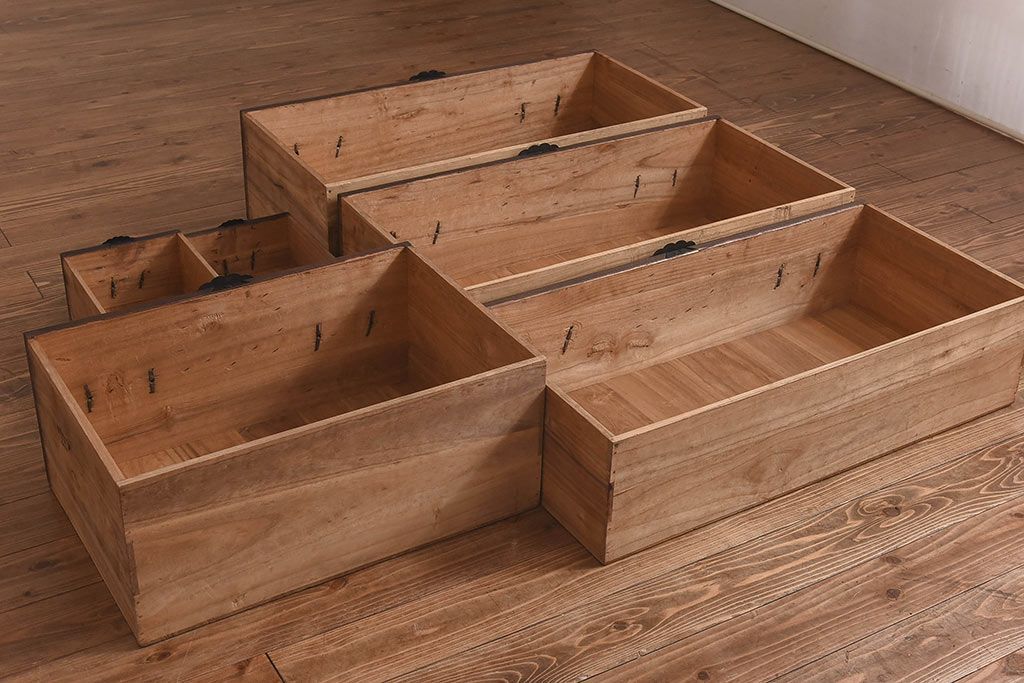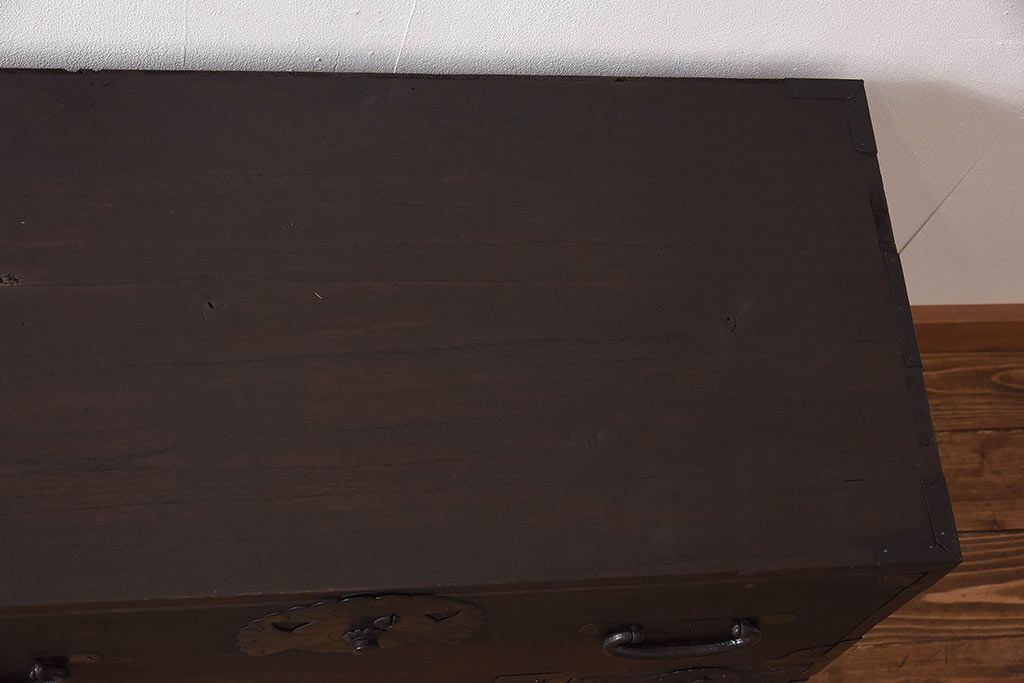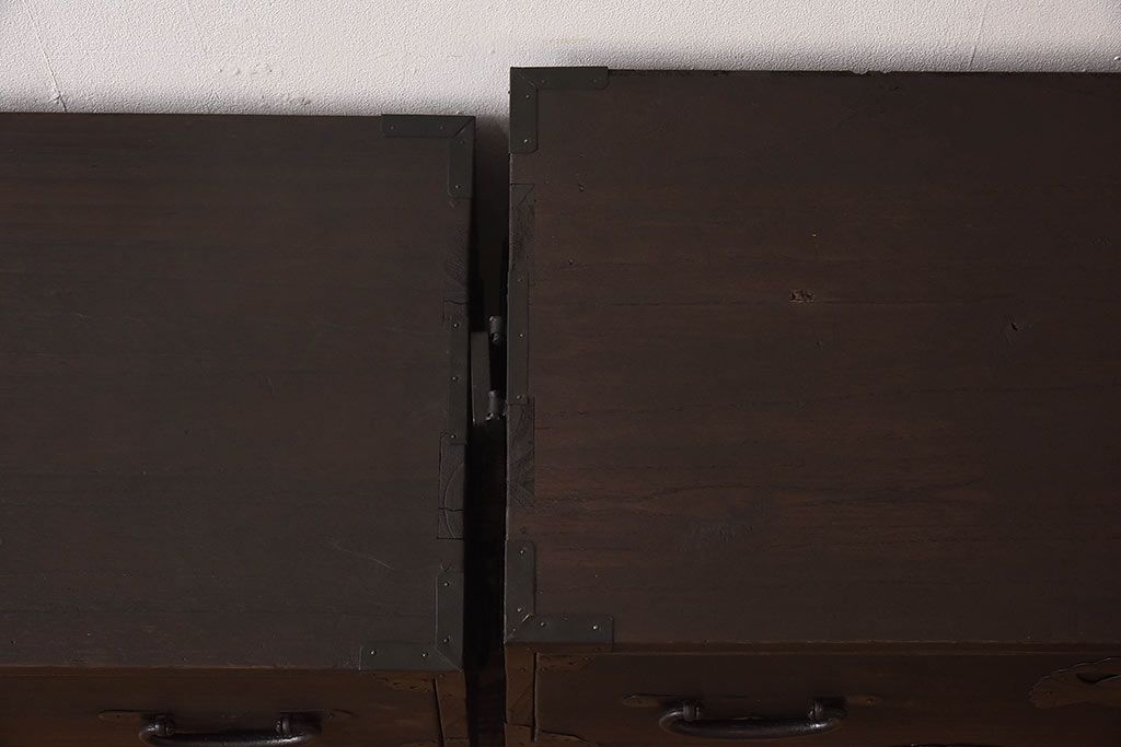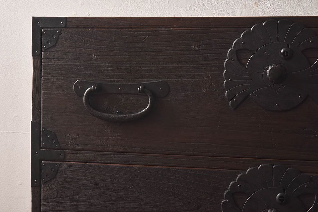 和箪笥 > アンティーク家具 和製アンティーク 総桐材 縁起のよい「ふくら雀」金具のついたチェスト(重ね箪笥、引き出し、桐箪笥、桐たんす)