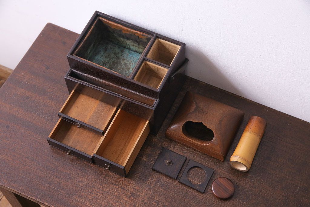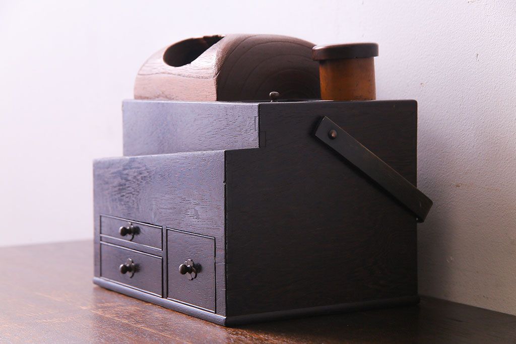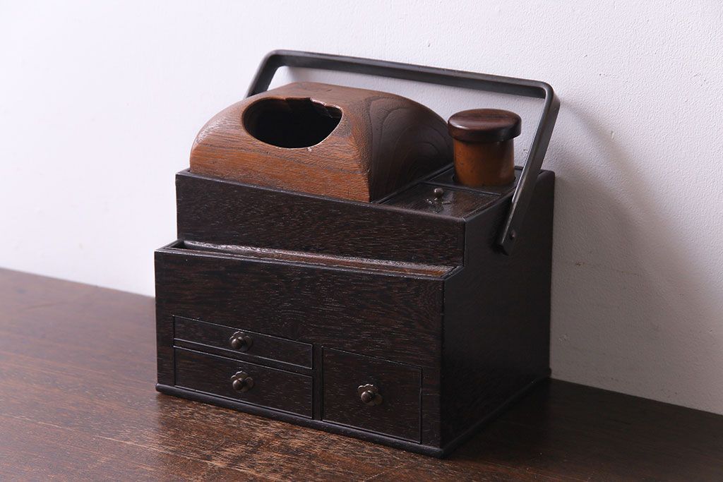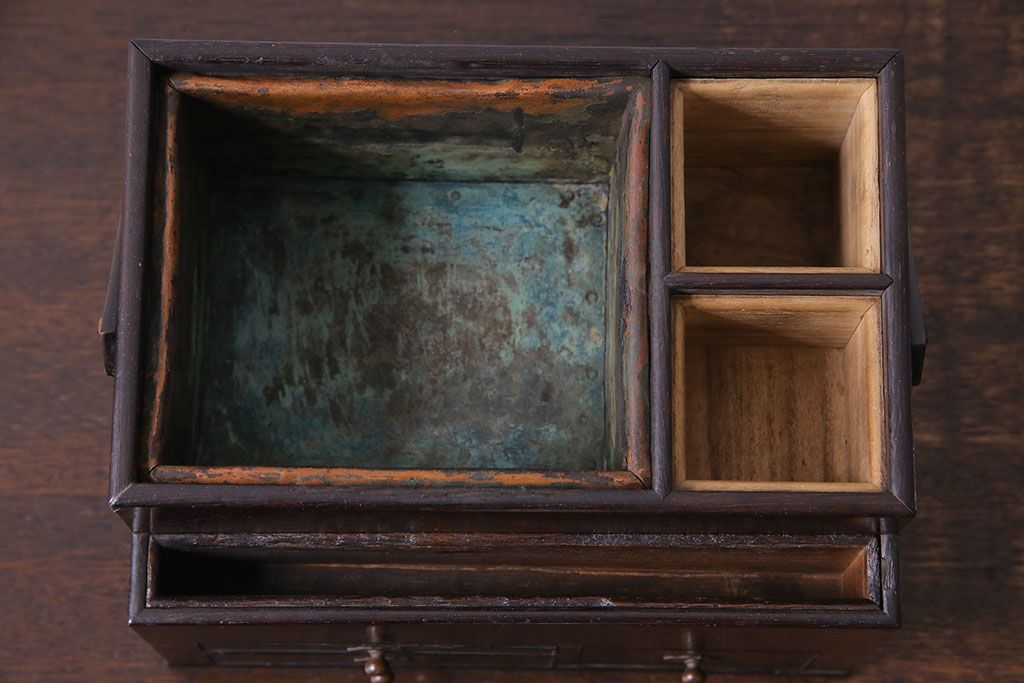 ラフジュ工房> 小物収納・トランク> 小引き出し > アンティーク雑貨 和製アンティーク 明治期 引き出し付き 鉄刀木製提手付煙草盆(莨盆)(R-030303)