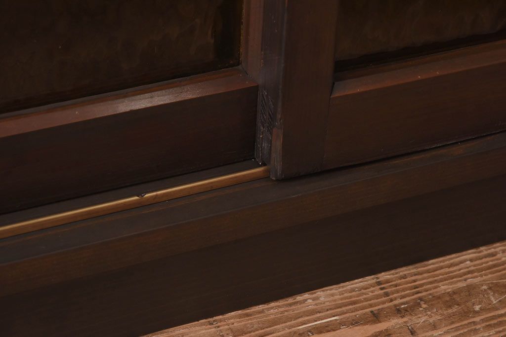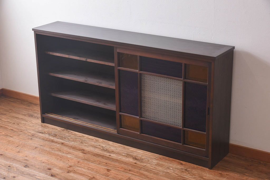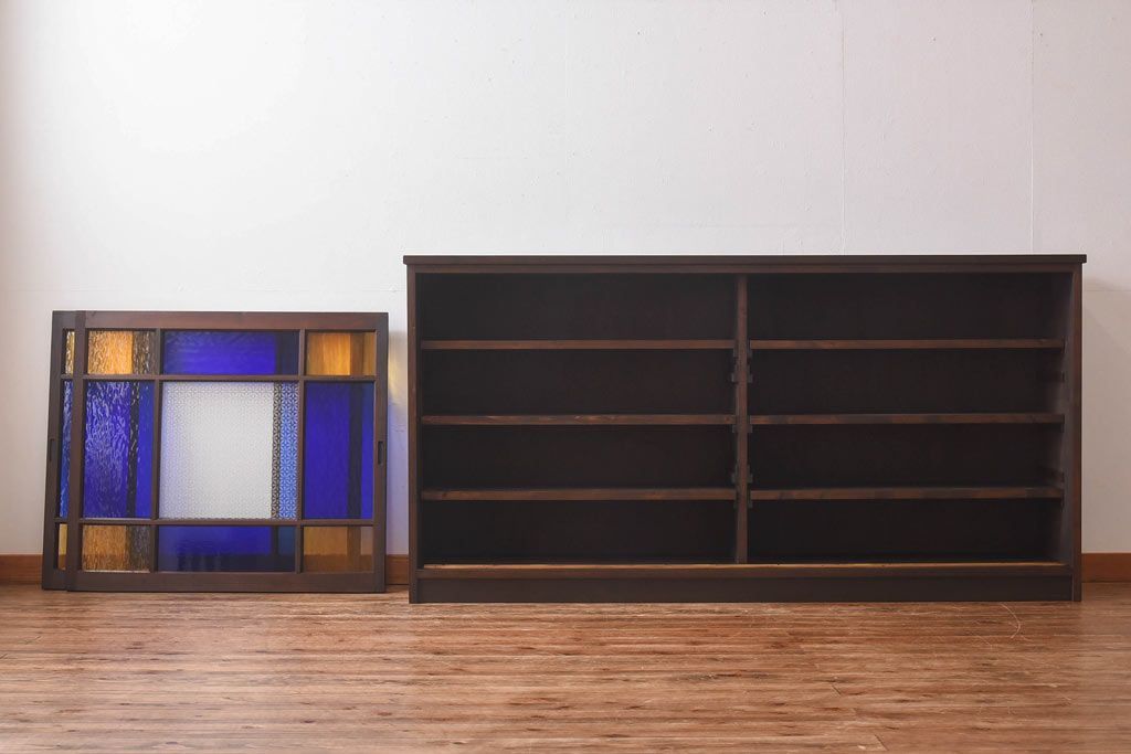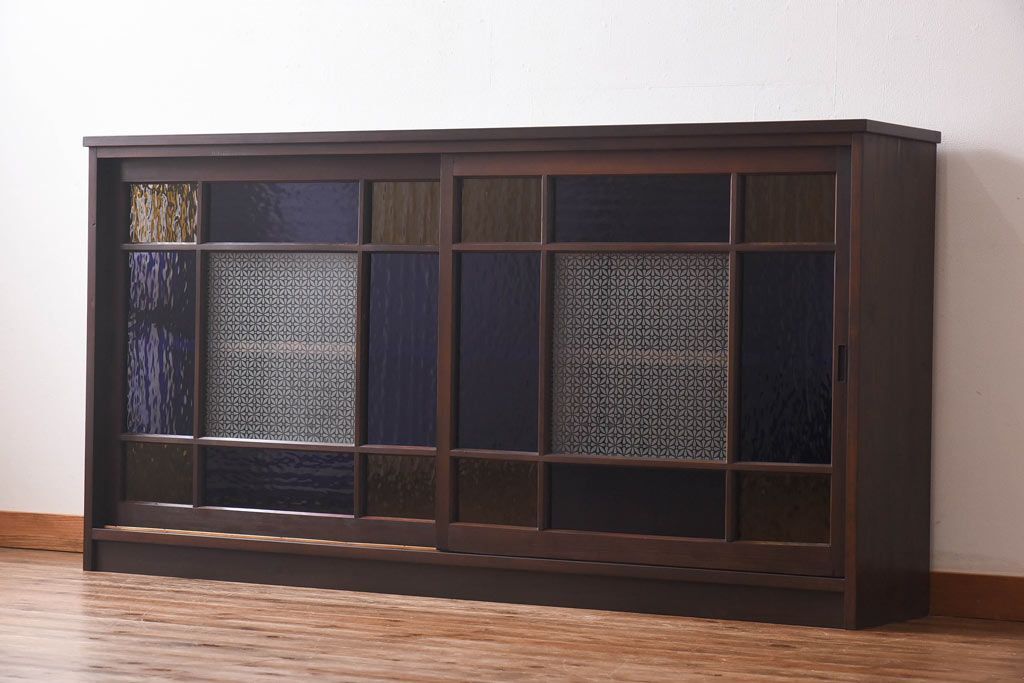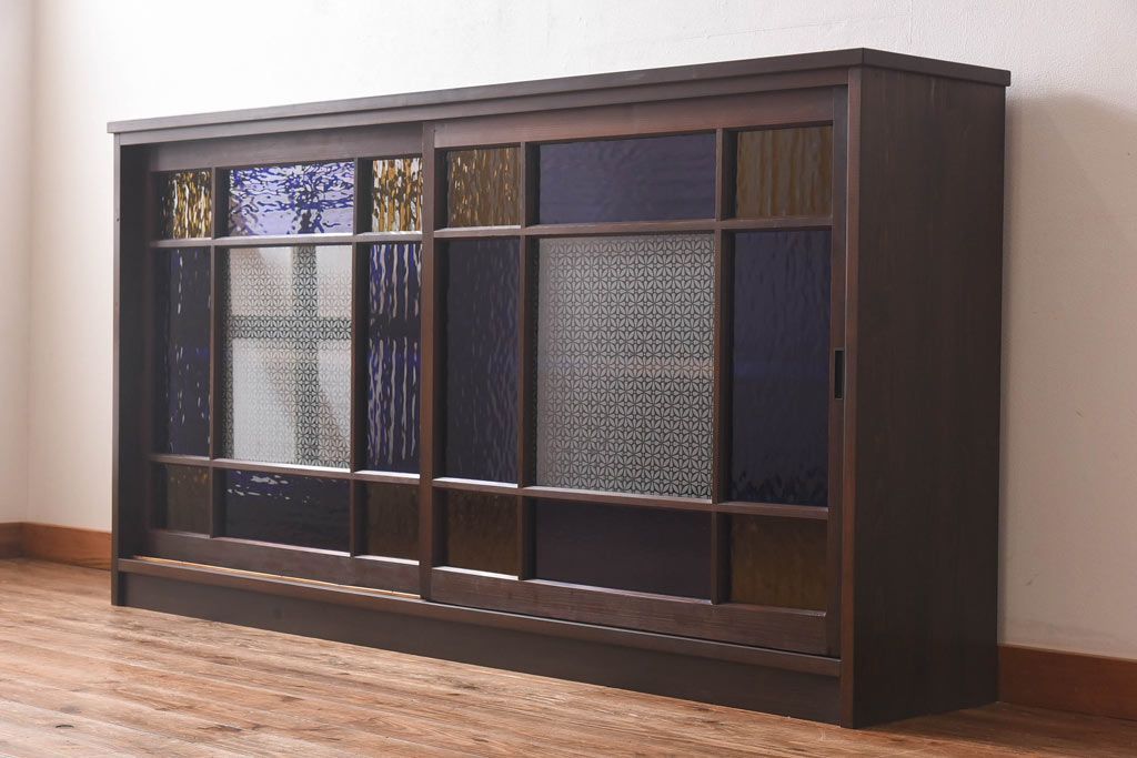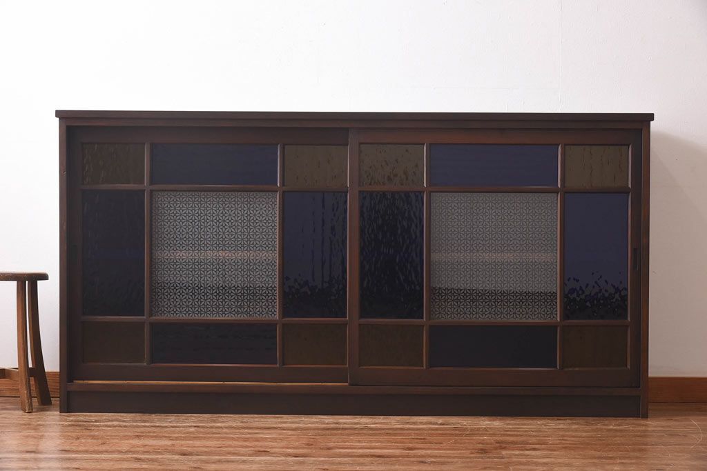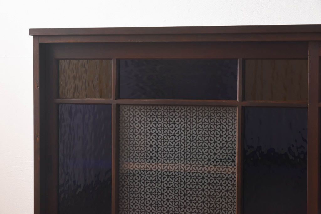 ラフジュ工房オリジナル 色ガラス・花菱模様のガラス入り 大正ロマンな大型戸棚(食器棚、収納棚、サイドボード、店舗什器)