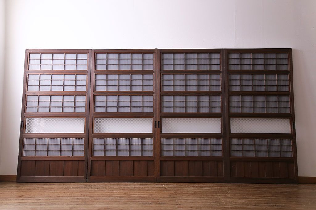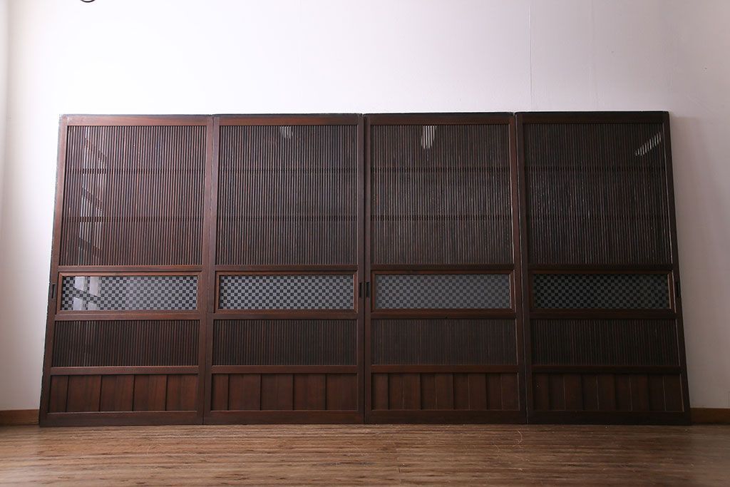 ドア・建具> 4枚〜セット > 昭和初期 板ガラス裏障子留め オリジナルガラス 市松模様のガラスがモダンな印象のガラス帯戸4枚セット(ガラス戸、引き戸、帯戸)(R-030389)