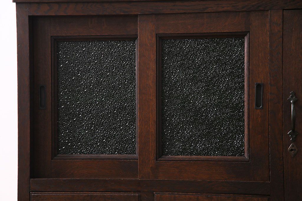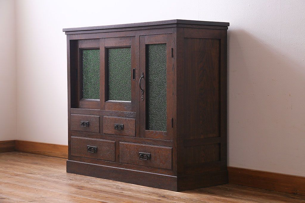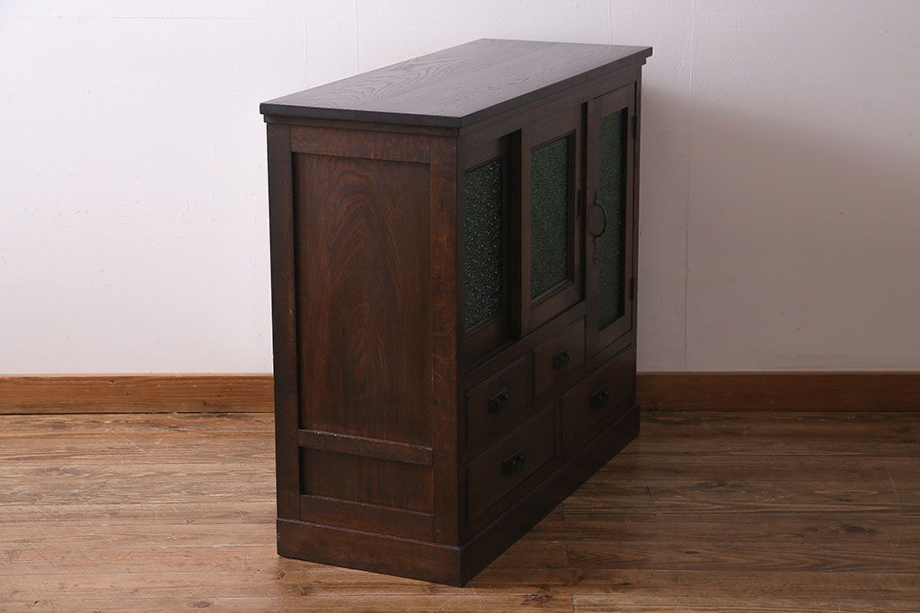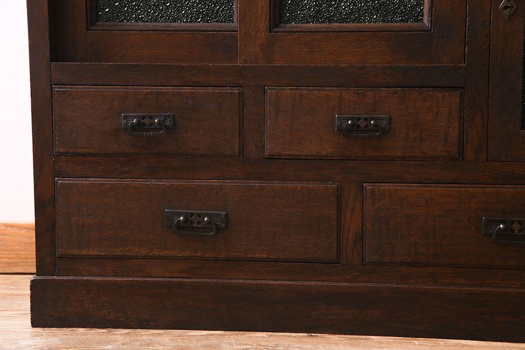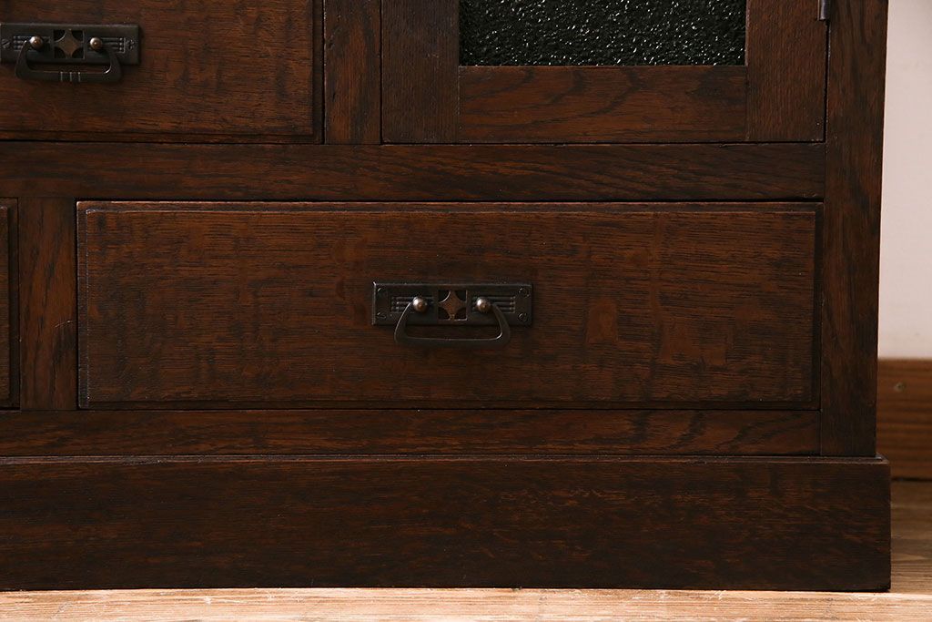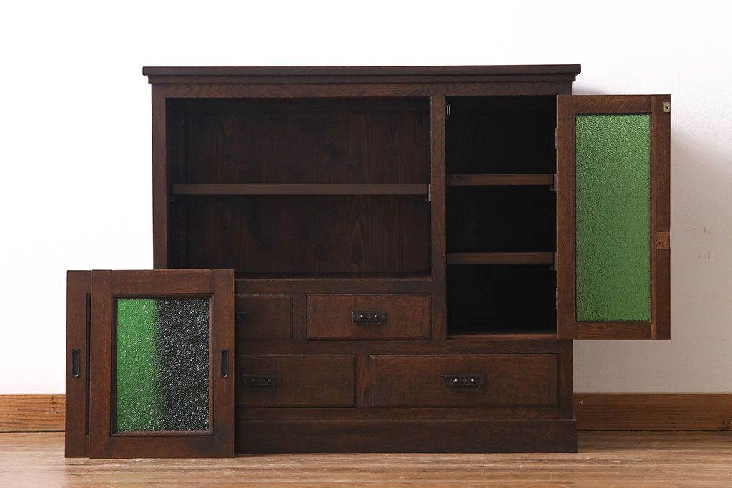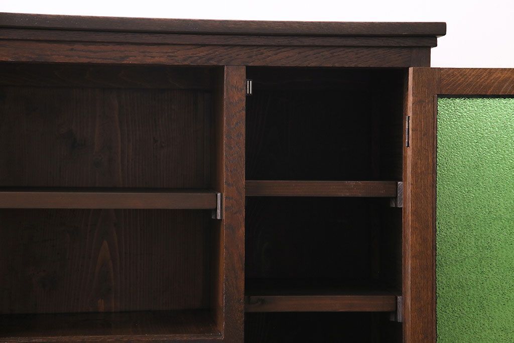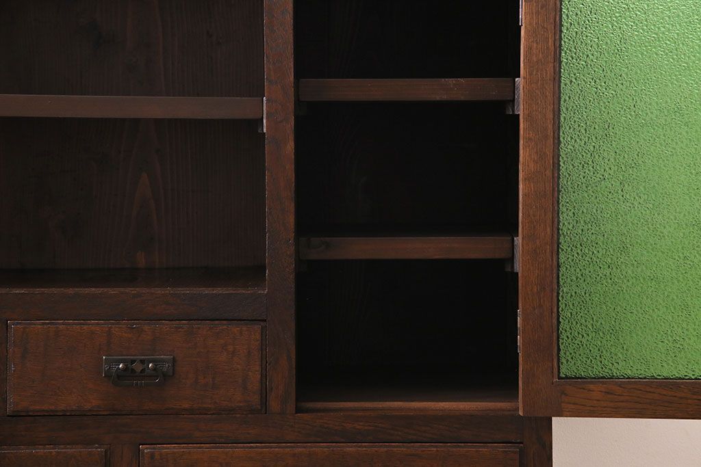 アンティーク家具 大正ロマン 色ガラス 古いナラ材の質感が味わい深い収納棚(ローボード、食器棚、ブックケース)(R-030412)