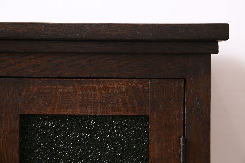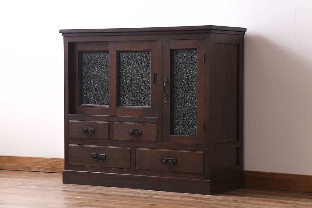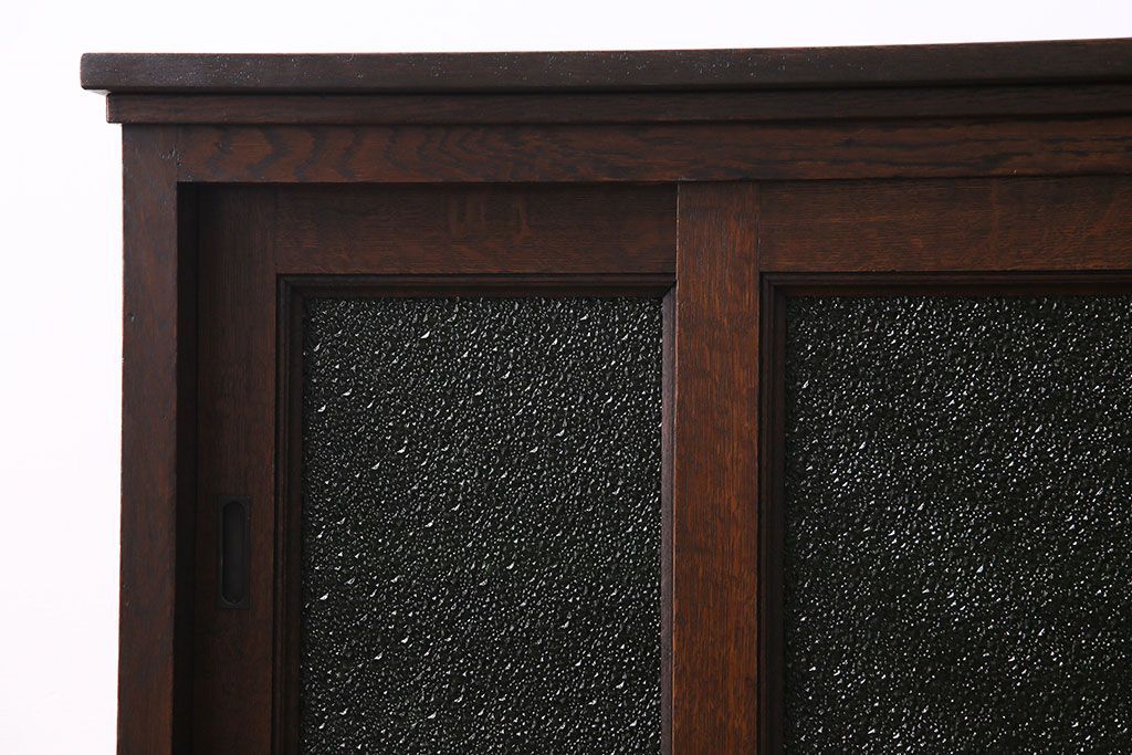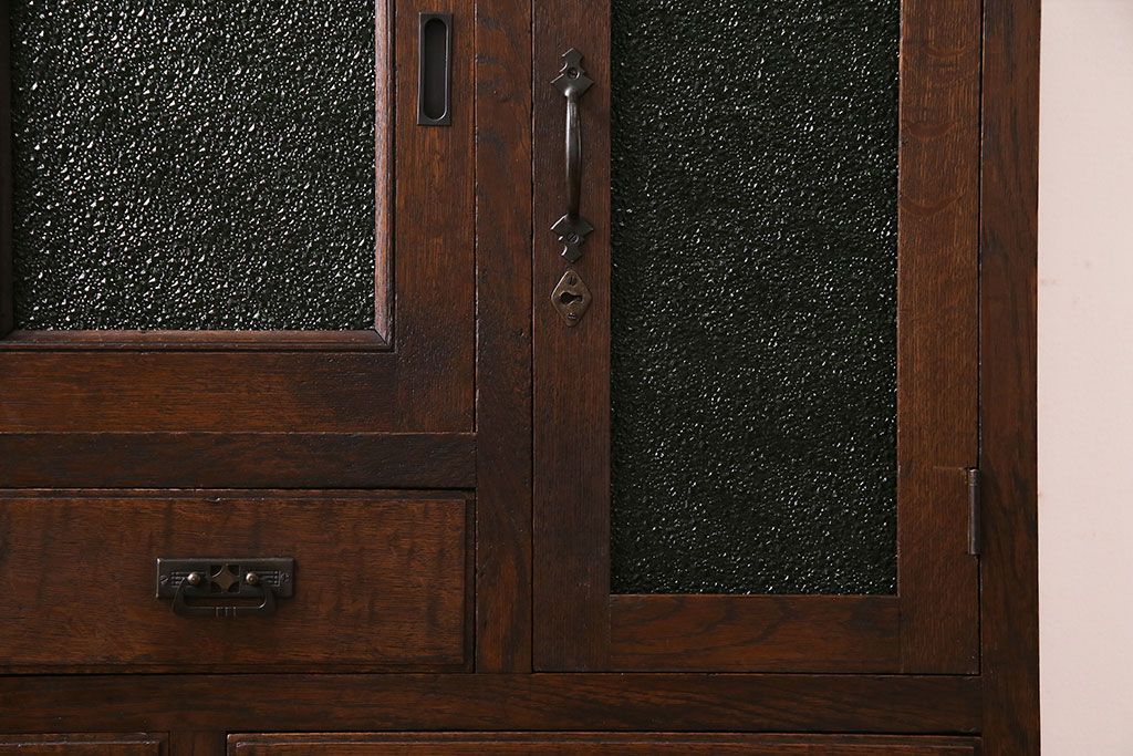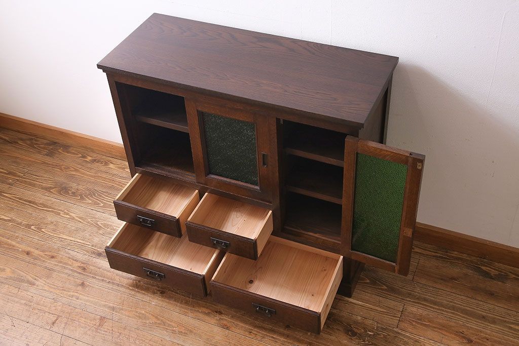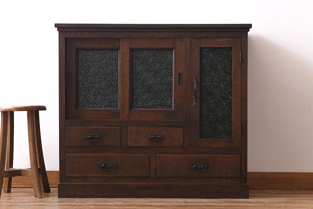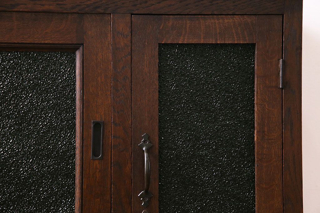 アンティーク家具 大正ロマン 色ガラス 古いナラ材の質感が味わい深い収納棚(ローボード、食器棚、ブックケース)(R-030412)