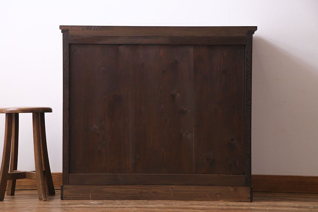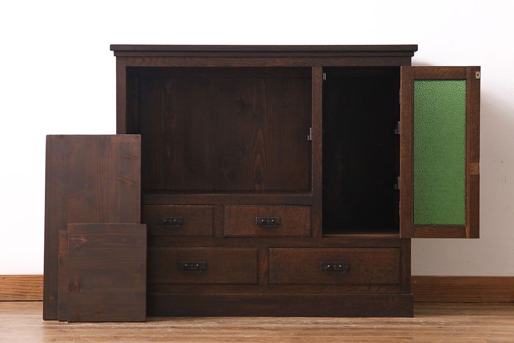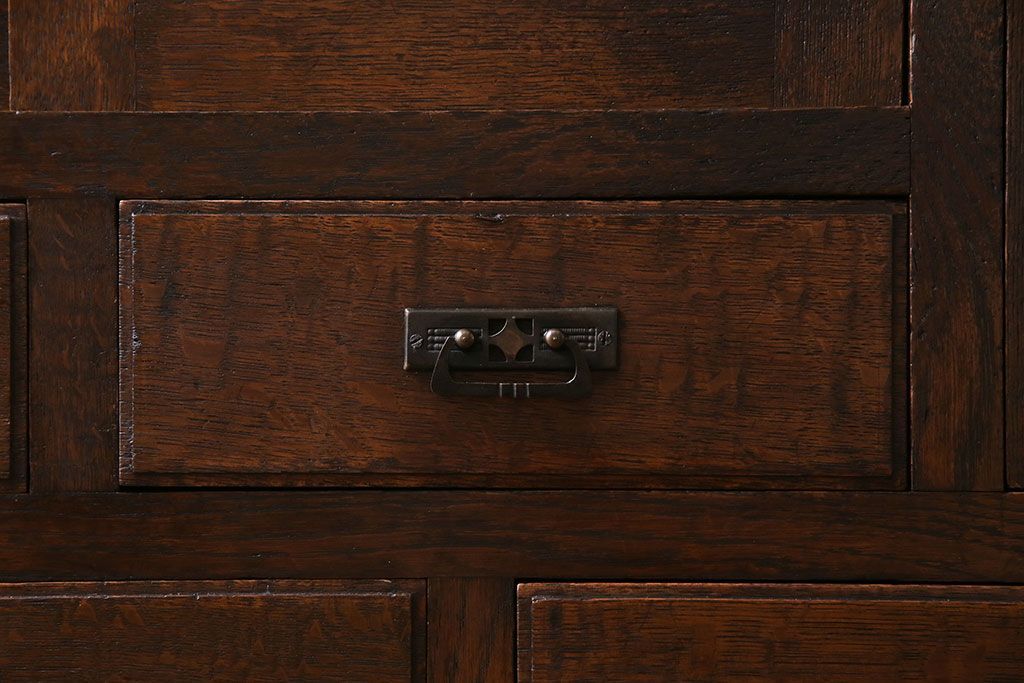 ラフジュ工房> キャビネット・戸棚> テレビ台・ローボード > アンティーク家具 大正ロマン 色ガラス 古いナラ材の質感が味わい深い収納棚(ローボード、食器棚、ブックケース)(R-030412)