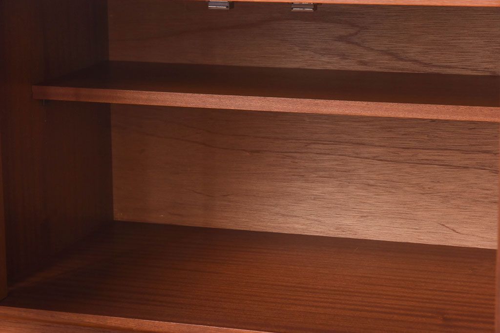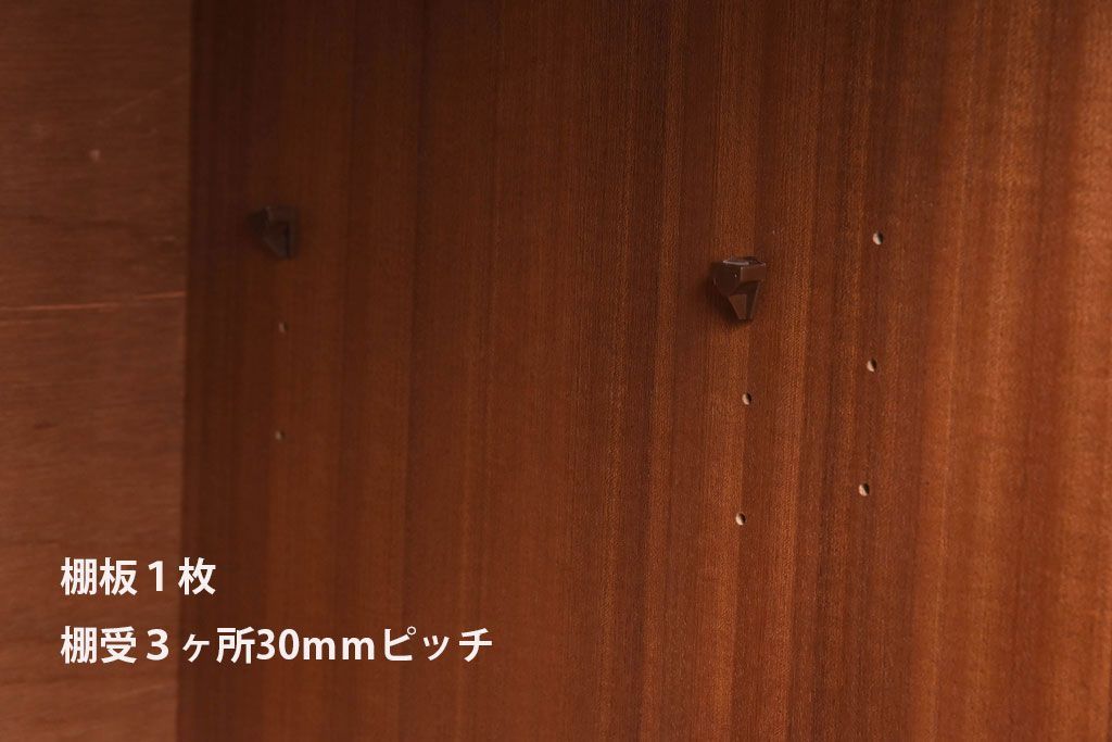 棚板は取り外しできます。棚板は1枚あります。棚受けは3ヶ所、30mmピッチで調整できます。棚幅サイズのものが1枚の作りです。