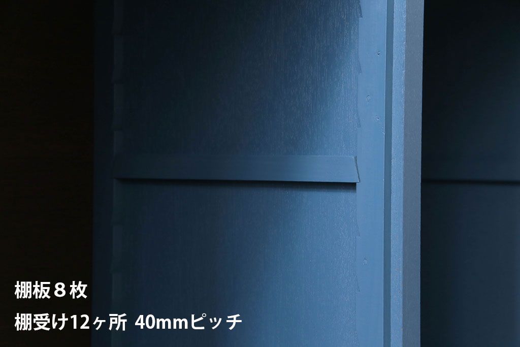 棚板は取り外しできます。棚板は8枚あります。棚受けは12ヶ所、40mmピッチで調整できます。棚幅サイズのものが1枚の作りです。