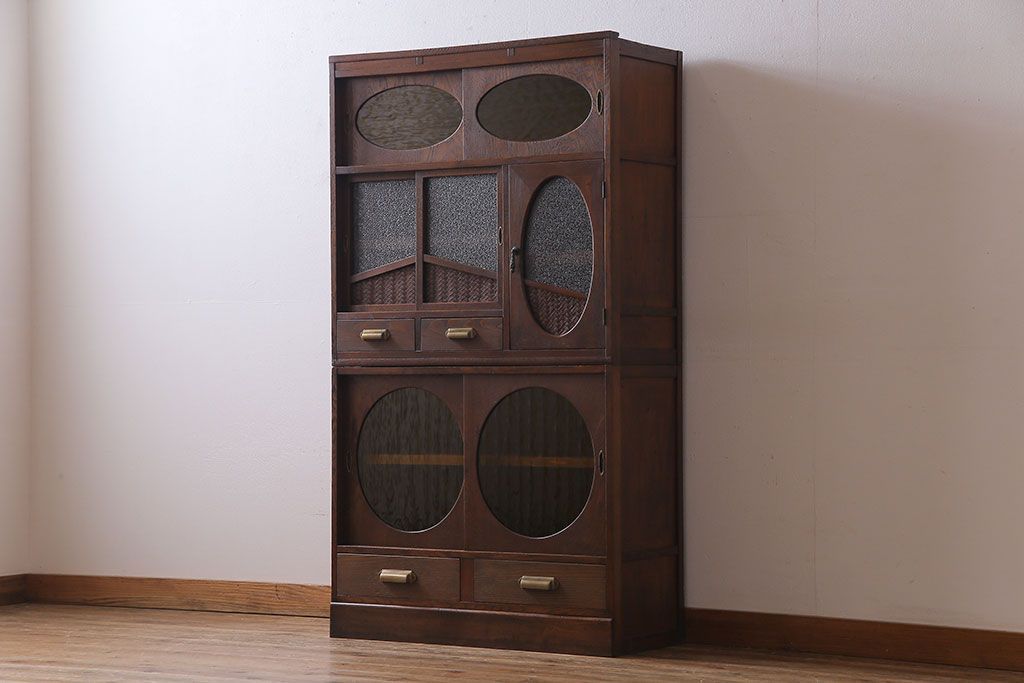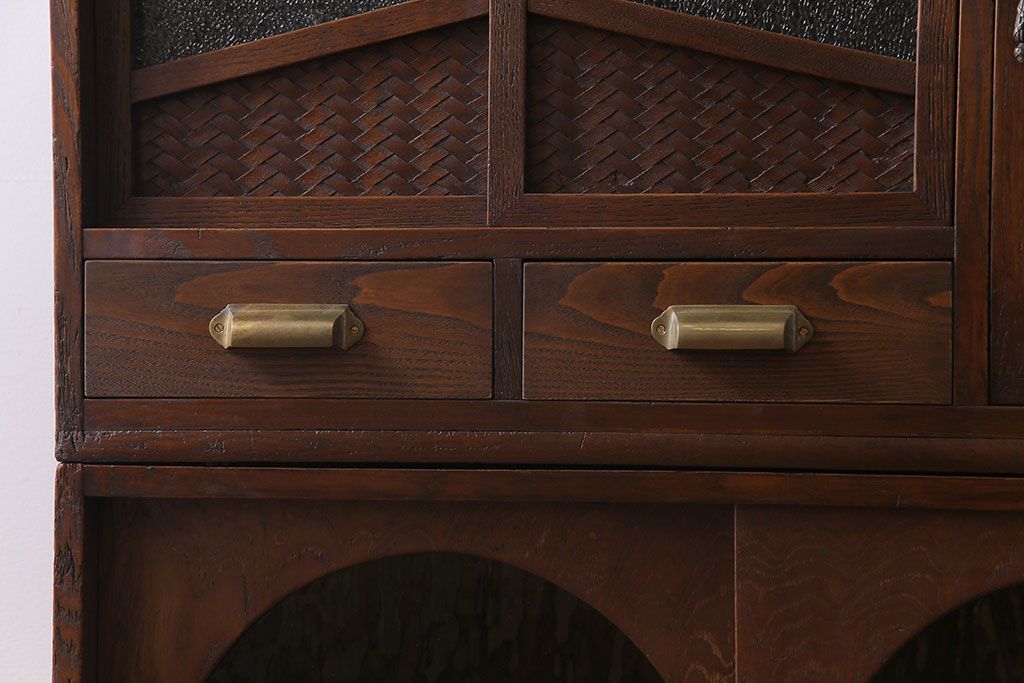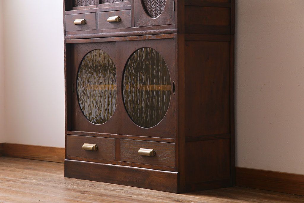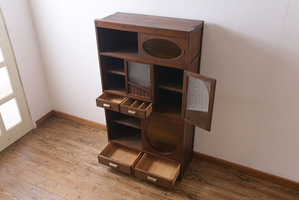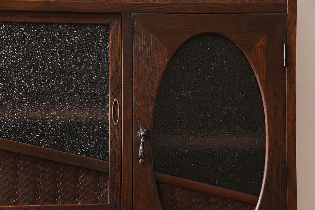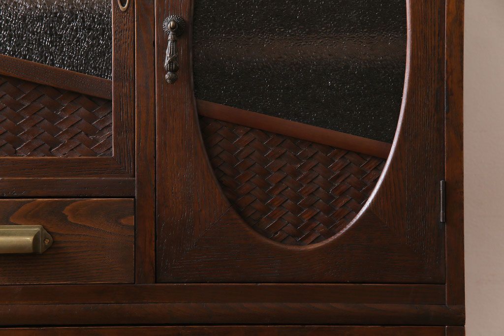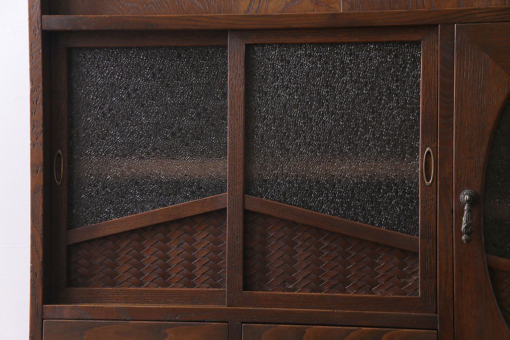 落ち着いた色味と、網代編みや丸窓のガラス戸がレトロな雰囲気を醸し出す戸棚(収納棚、食器棚)です。当店にて、中央部のダイヤガラスと丸窓の色ガラスを組み合わせました。収納が沢山ついているので、リビングの収納棚やダイニングの食器棚としておすすめです。大正ロマンの雰囲気あふれる空間が演出できますよ。