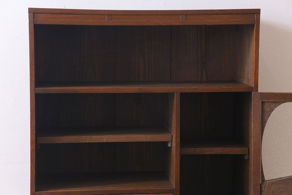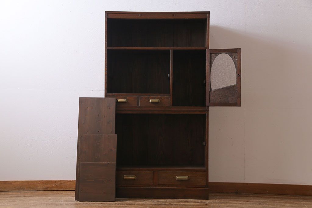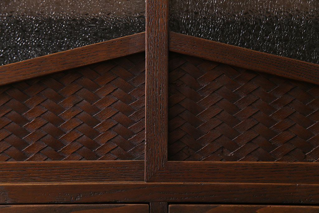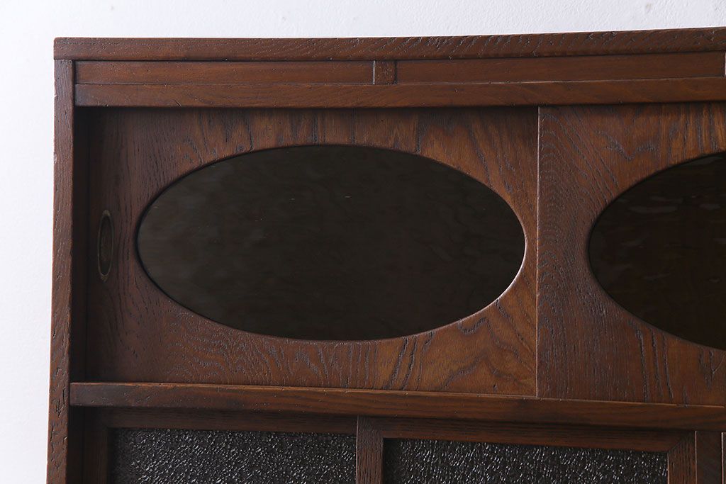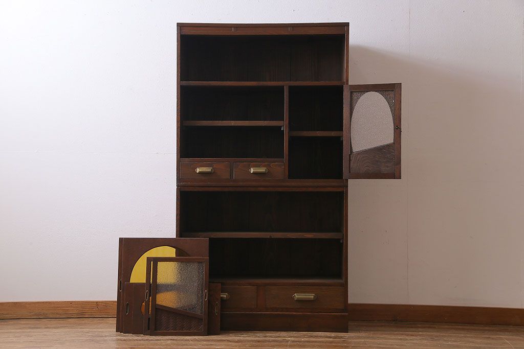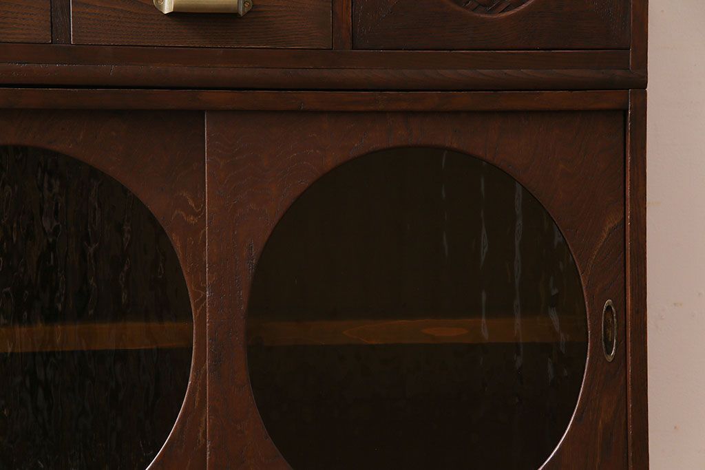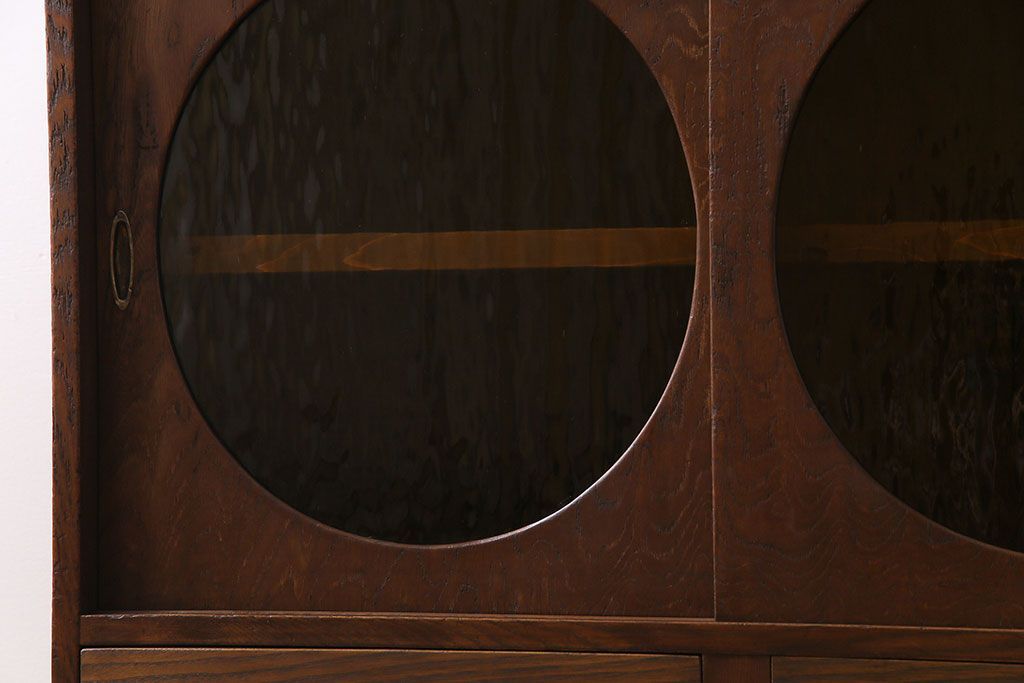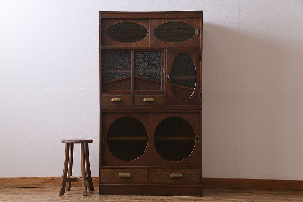 落ち着いた色味と、網代編みや丸窓のガラス戸がレトロな雰囲気を醸し出す戸棚(収納棚、食器棚)です。当店にて、中央部のダイヤガラスと丸窓の色ガラスを組み合わせました。収納が沢山ついているので、リビングの収納棚やダイニングの食器棚としておすすめです。大正ロマンの雰囲気あふれる空間が演出できますよ。