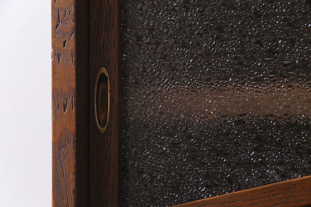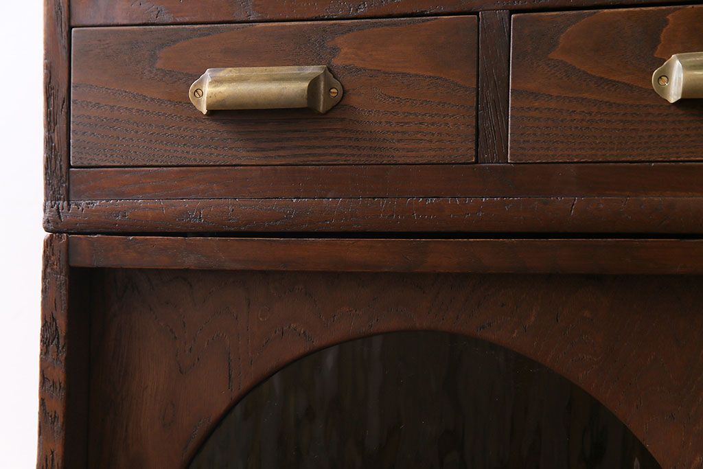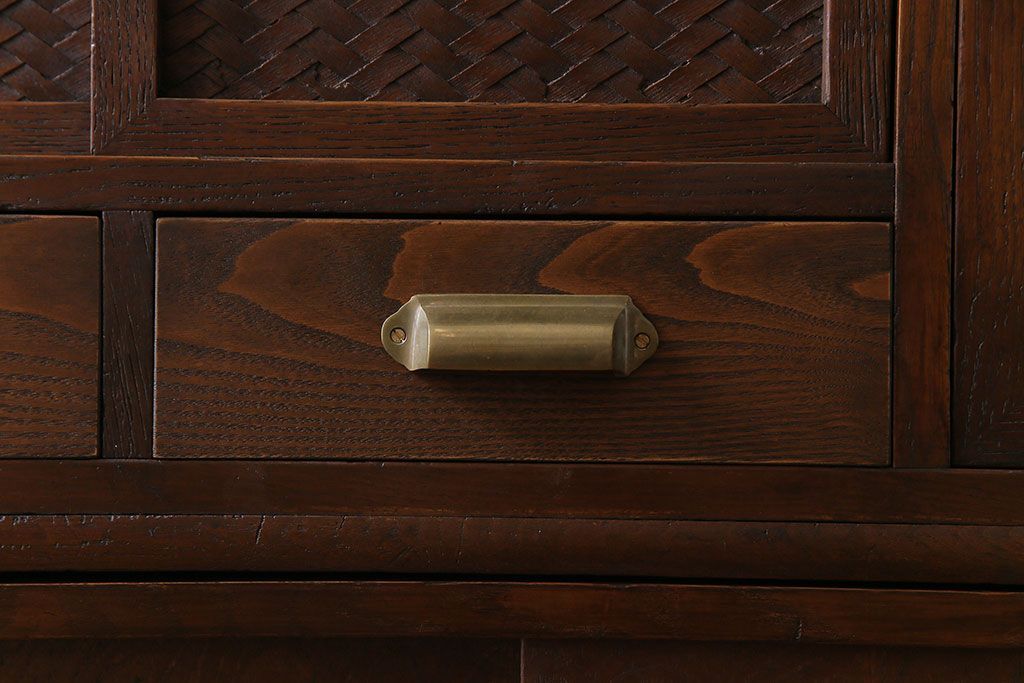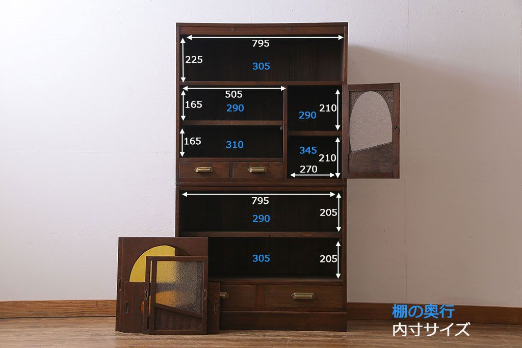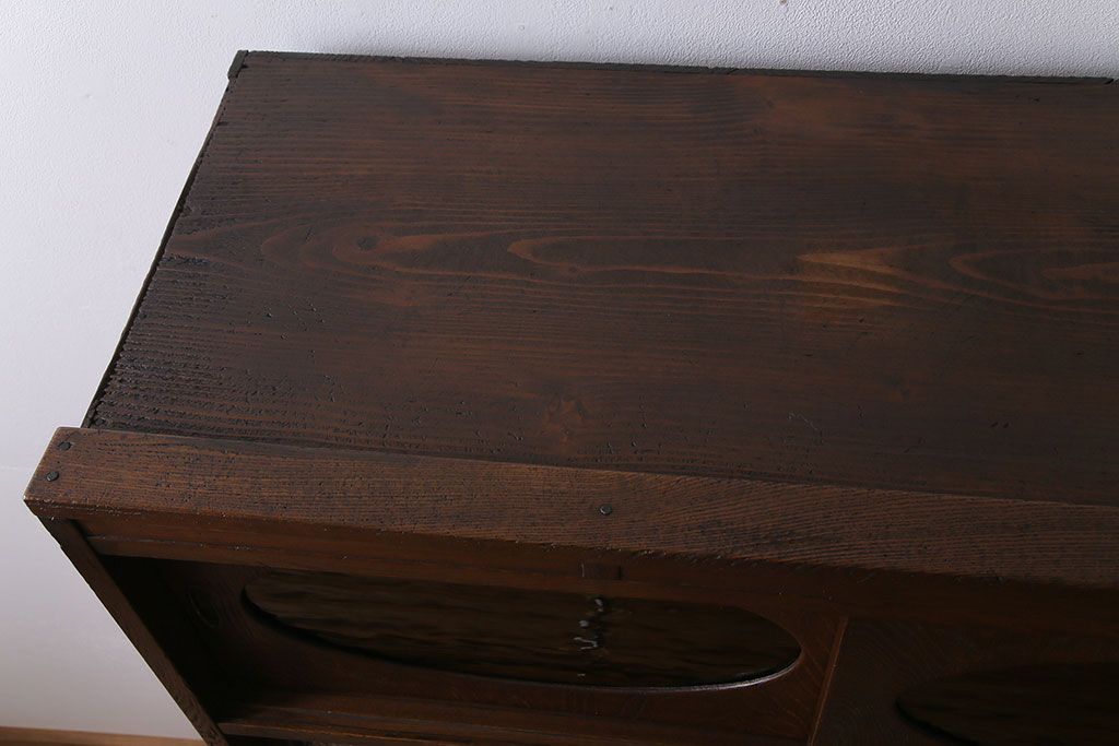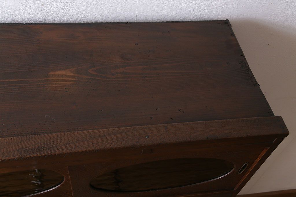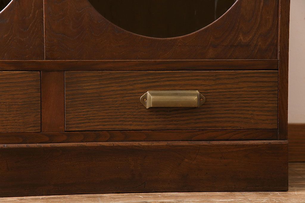 落ち着いた色味と、網代編みや丸窓のガラス戸がレトロな雰囲気を醸し出す戸棚(収納棚、食器棚)です。当店にて、中央部のダイヤガラスと丸窓の色ガラスを組み合わせました。収納が沢山ついているので、リビングの収納棚やダイニングの食器棚としておすすめです。大正ロマンの雰囲気あふれる空間が演出できますよ。