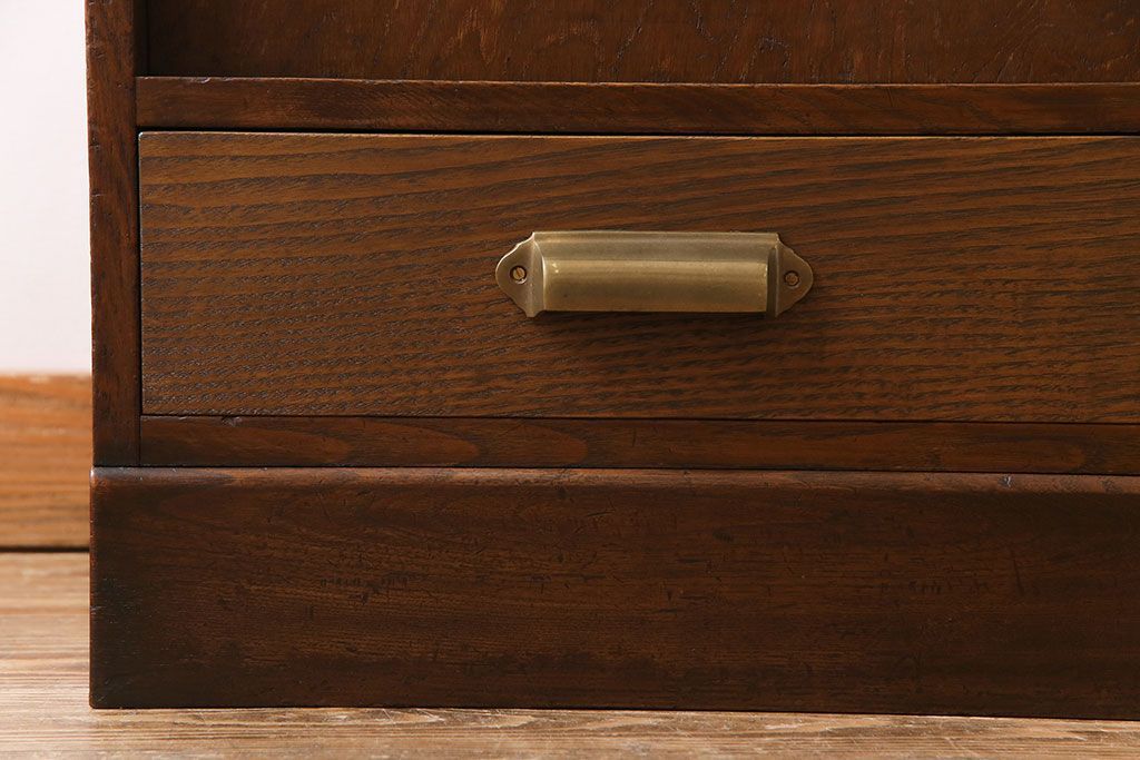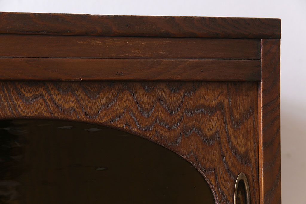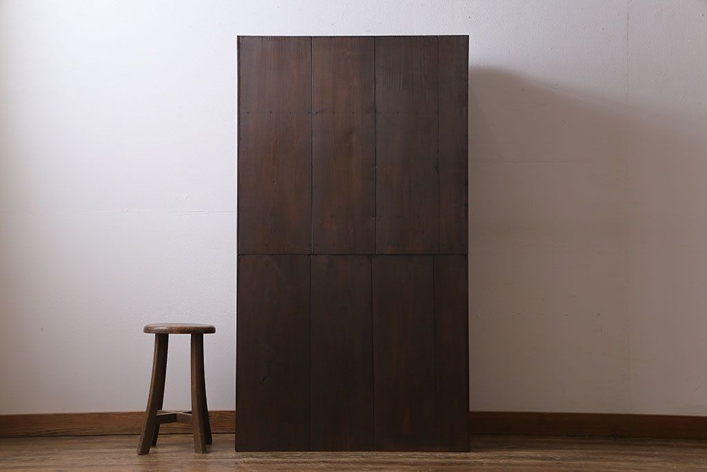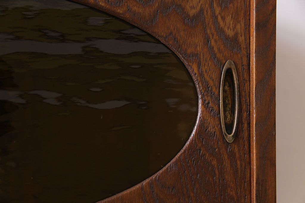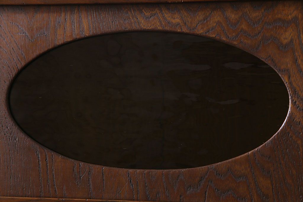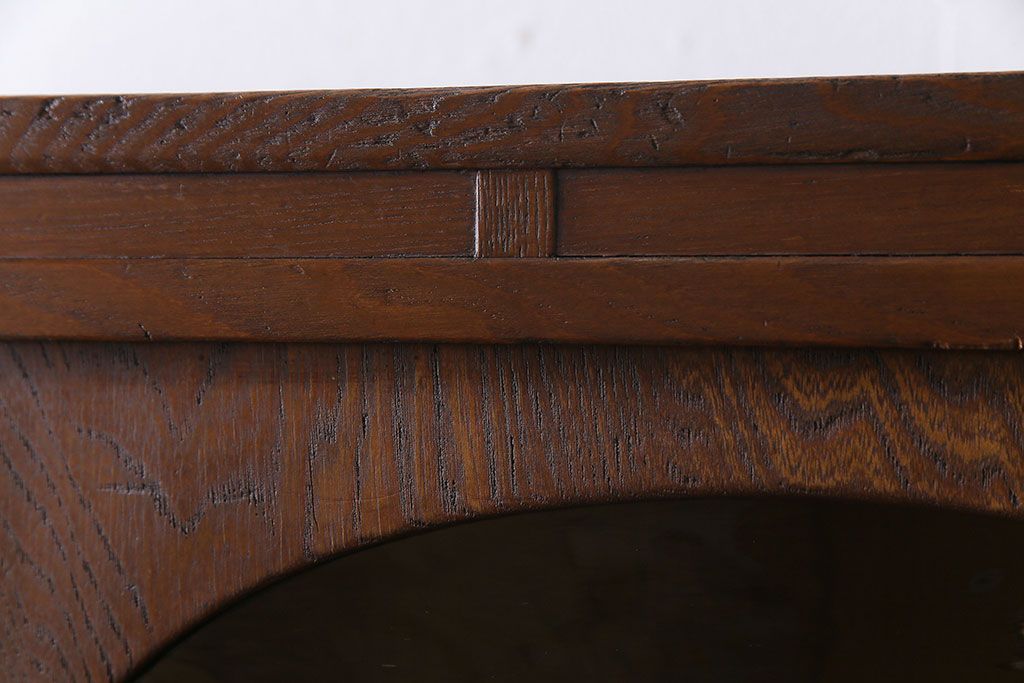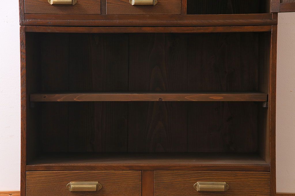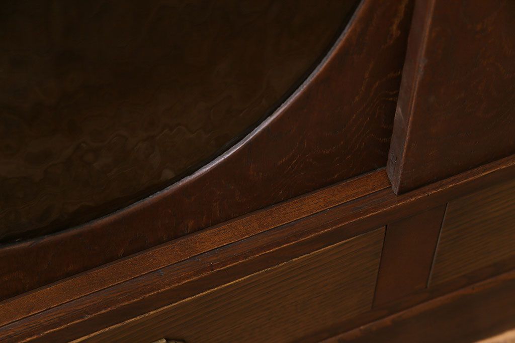 落ち着いた色味と、網代編みや丸窓のガラス戸がレトロな雰囲気を醸し出す戸棚(収納棚、食器棚)です。当店にて、中央部のダイヤガラスと丸窓の色ガラスを組み合わせました。収納が沢山ついているので、リビングの収納棚やダイニングの食器棚としておすすめです。大正ロマンの雰囲気あふれる空間が演出できますよ。
