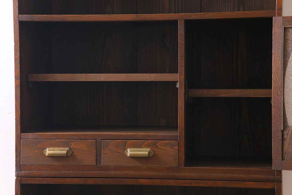 - それぞれサイズが異なる引き出しや棚が付いていて、機能的です。棚板も取り外せるので、収納したい物の大きさに合わせて調整できます。棚が四種類と、引き出しが四杯付いています。食器棚として使うと、収納力もたっぷりある上に、和レトロなキッチンやダイニングを演出できますよ。