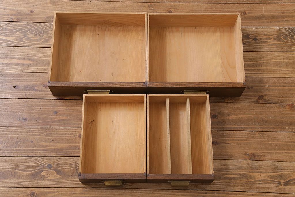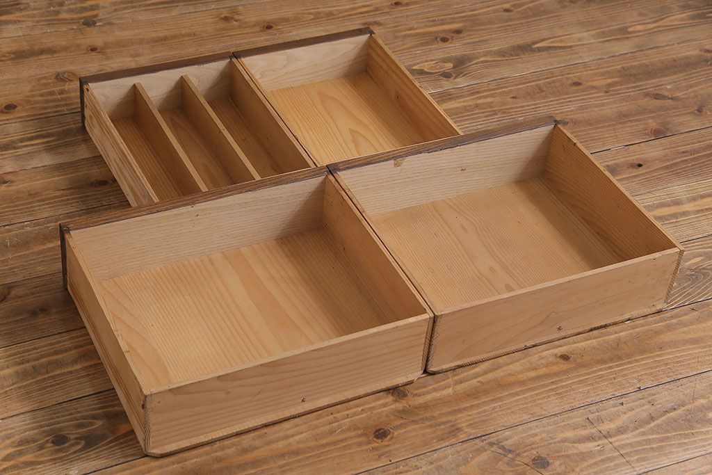 大小サイズの異なる引き出しです。仕切り付きの引き出しにはカトラリーを入れるなど、小物を整理して収納できます。