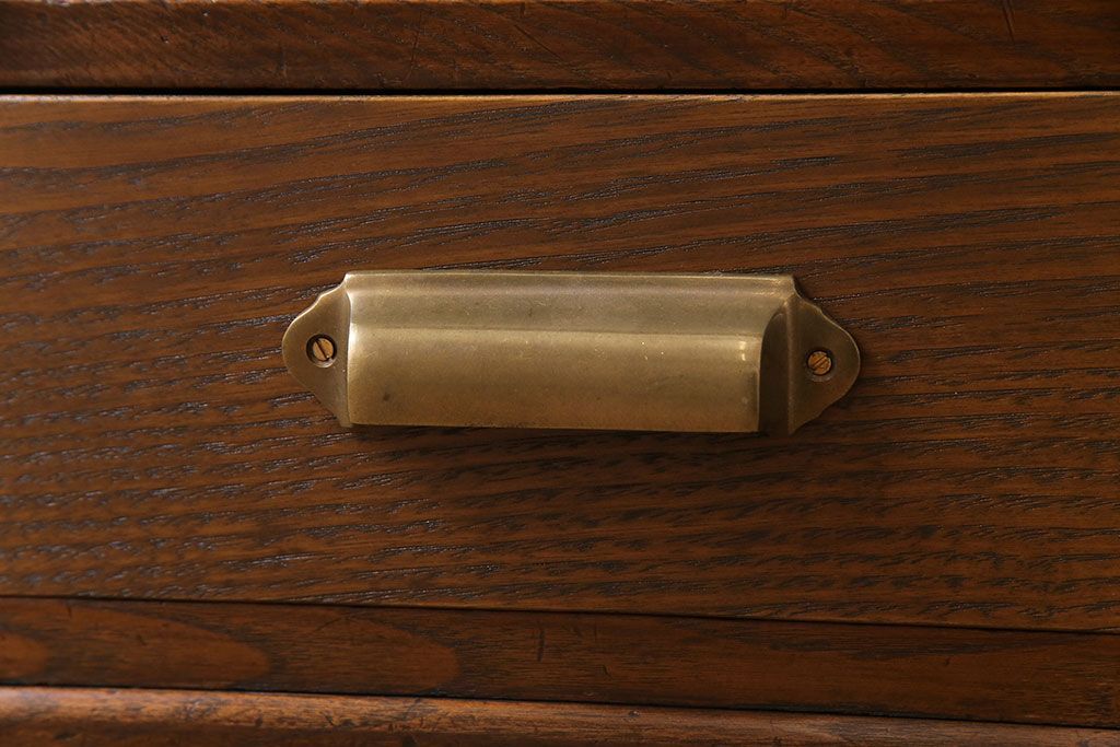 - このお品に大正ロマンを感じさせるもう一つの要素として、アールデコ調のデザインが挙げられます。アールデコは、大正時代に日本に影響した代表的な西洋デザイン様式で、「四角(直線的な形)」と「丸(曲線的な形)」を組み合わせた幾何学文様が特徴です。こちらも、直線的なフォルムに丸窓や楕円形の取っ手が合わされたデザインで、当時の文化を想起させますね。