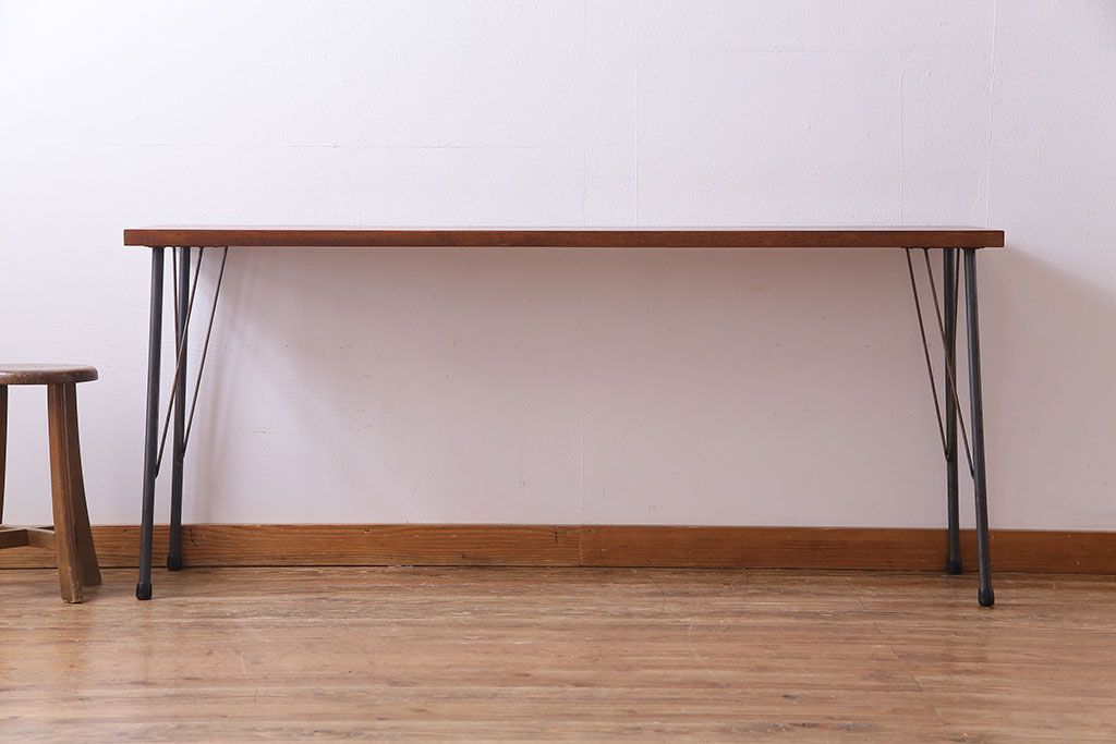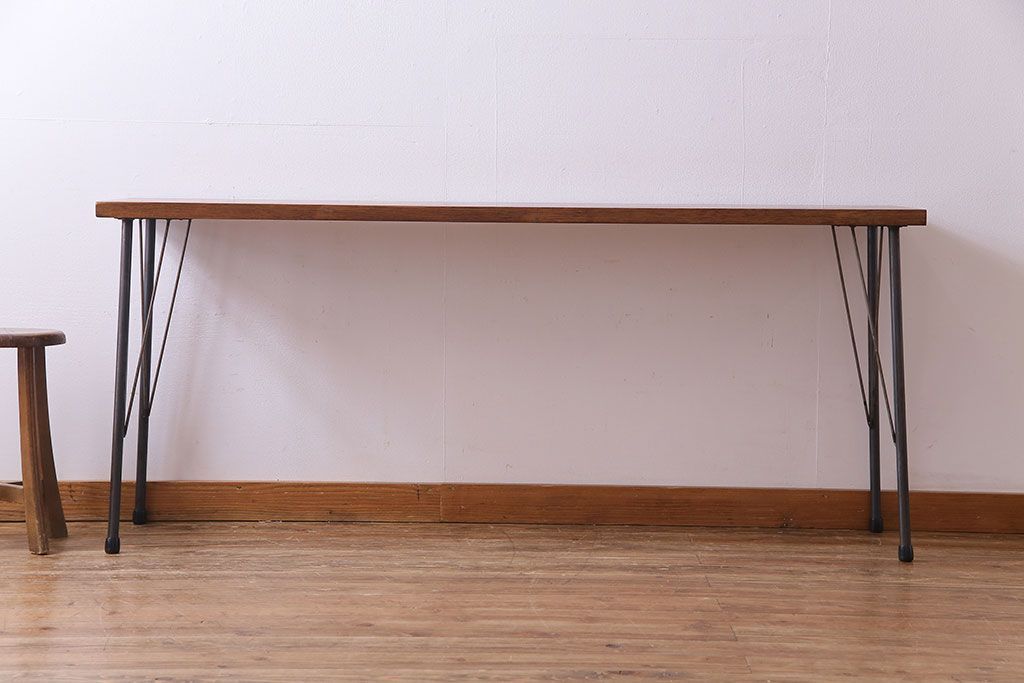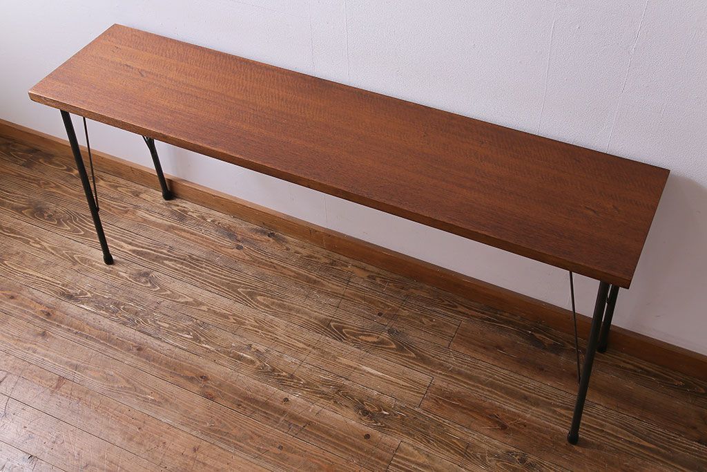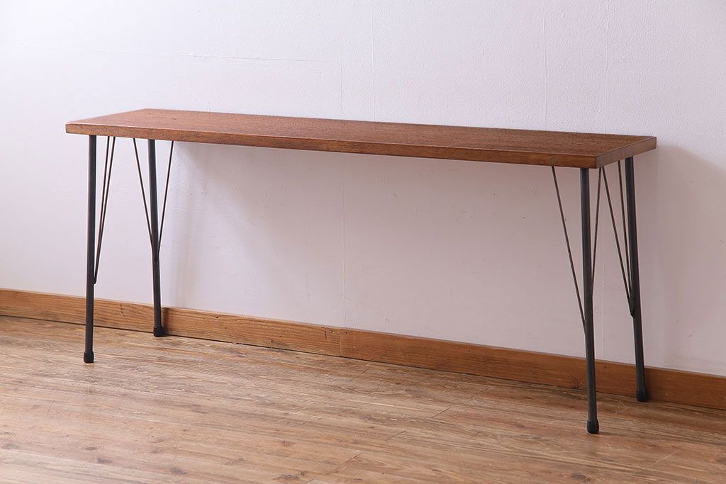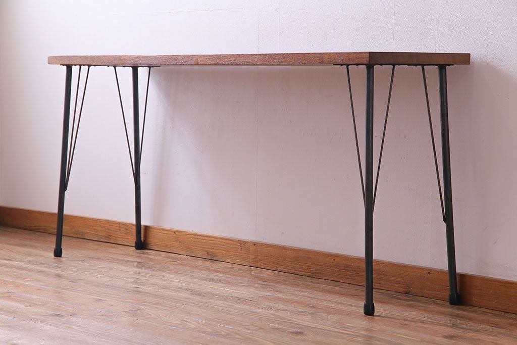 レトロ家具 昭和レトロ ラワン材一枚板 古い木の質感が味わい深い鉄脚テーブル(コンソールテーブル、作業台)