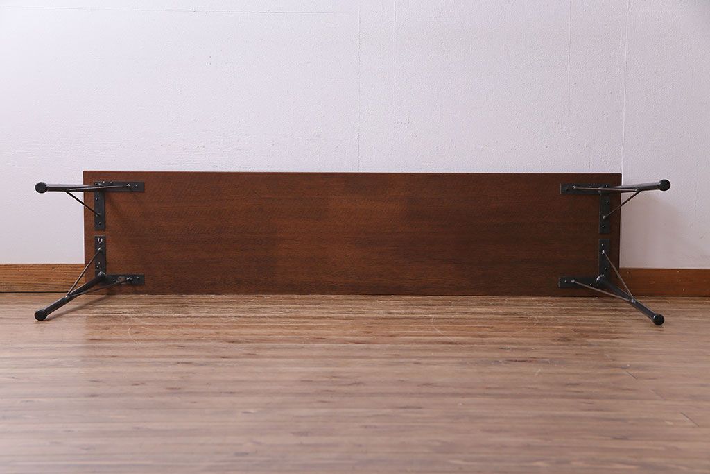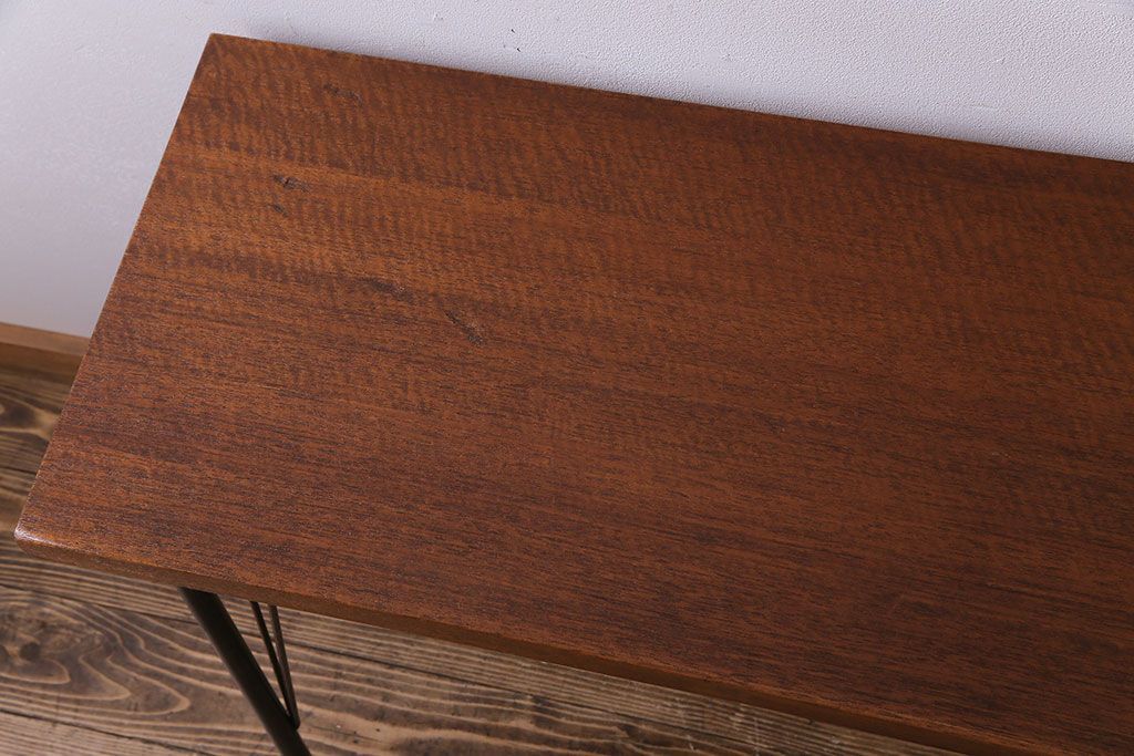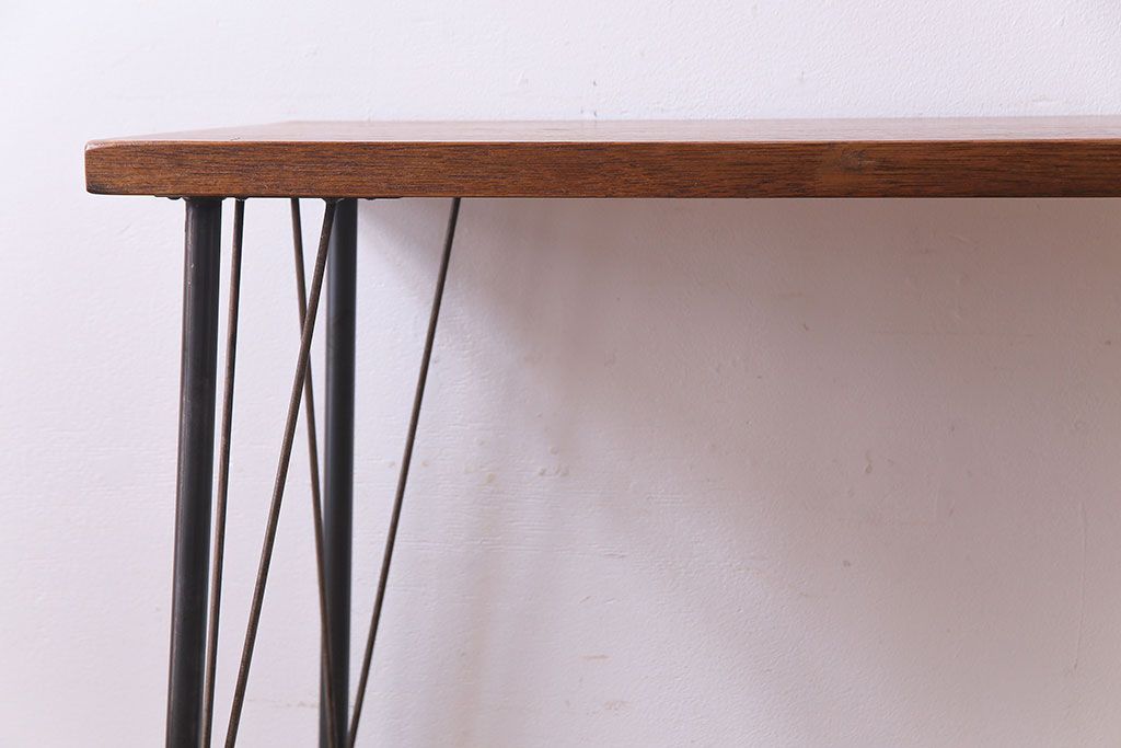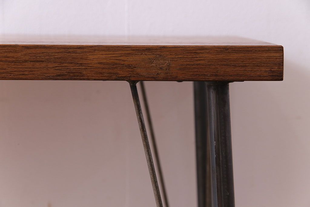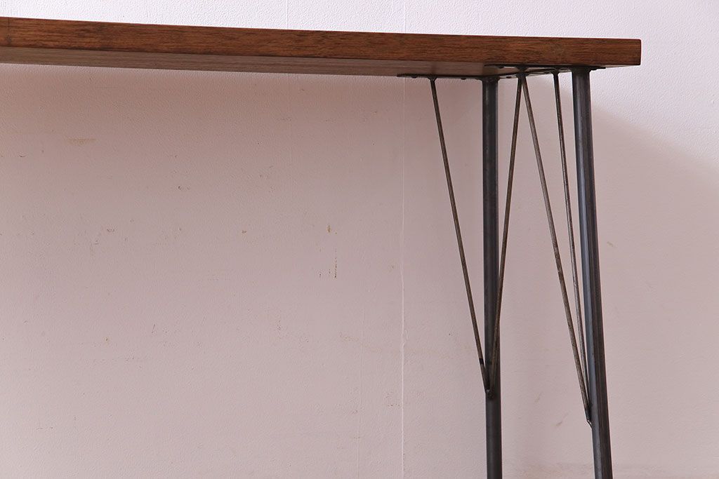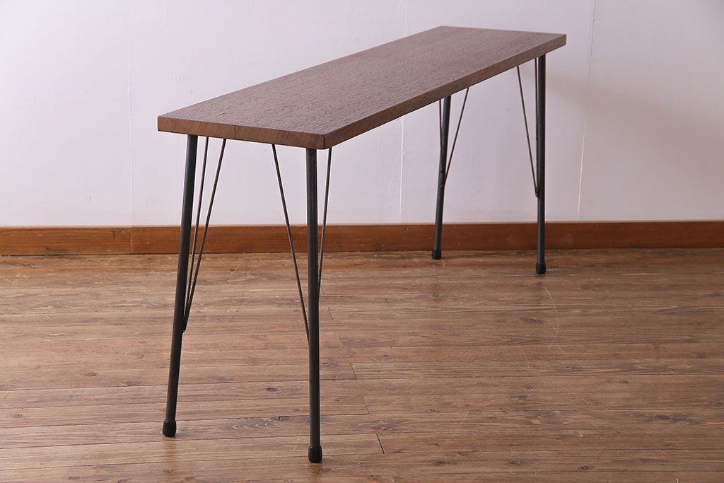 レトロ家具 昭和レトロ ラワン材一枚板 古い木の質感が味わい深い鉄脚テーブル(コンソールテーブル、作業台)