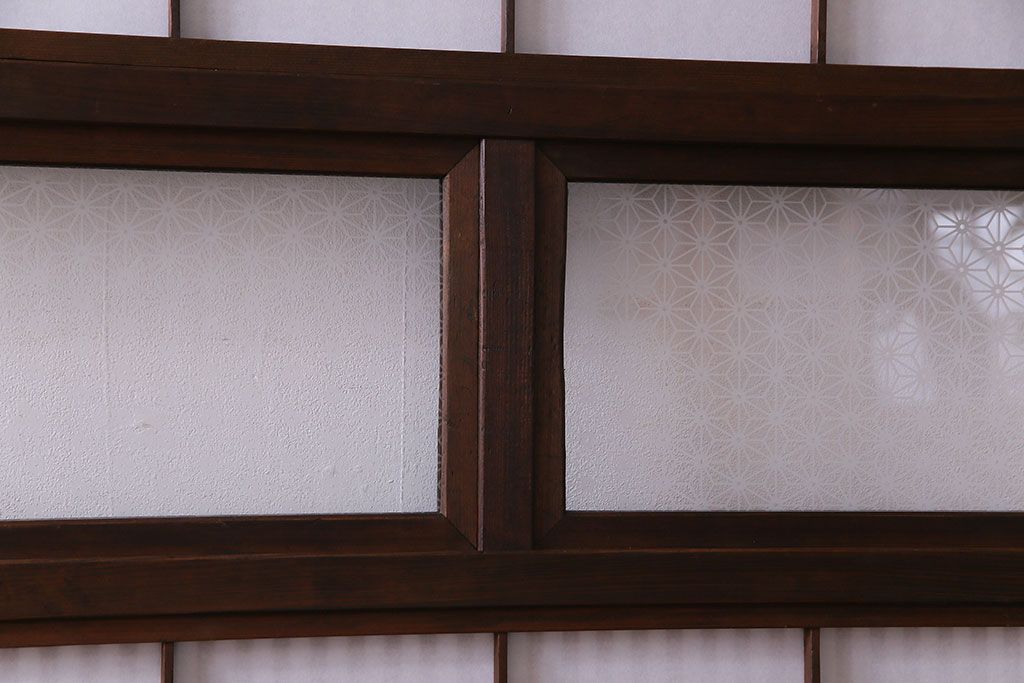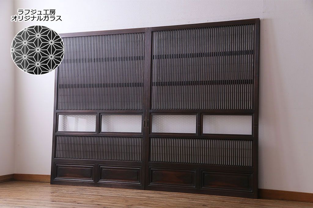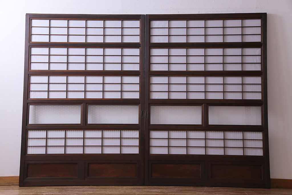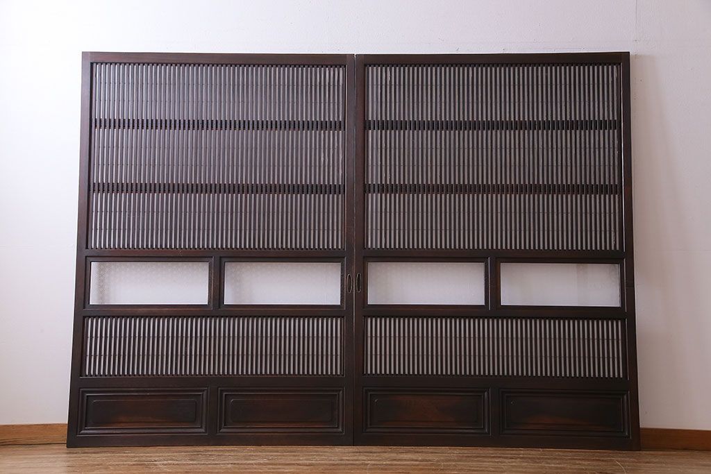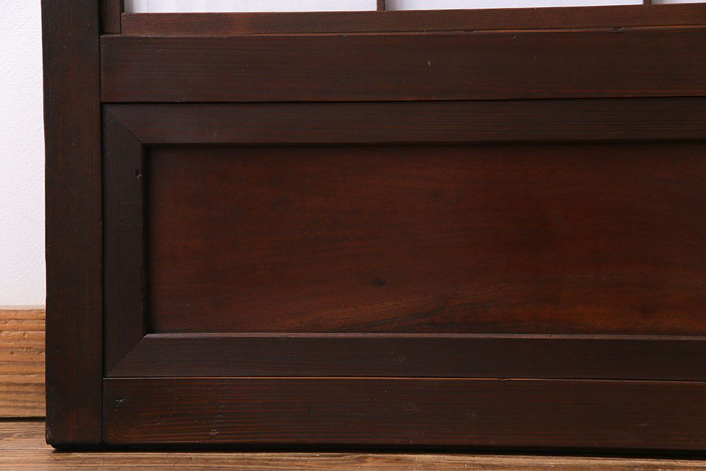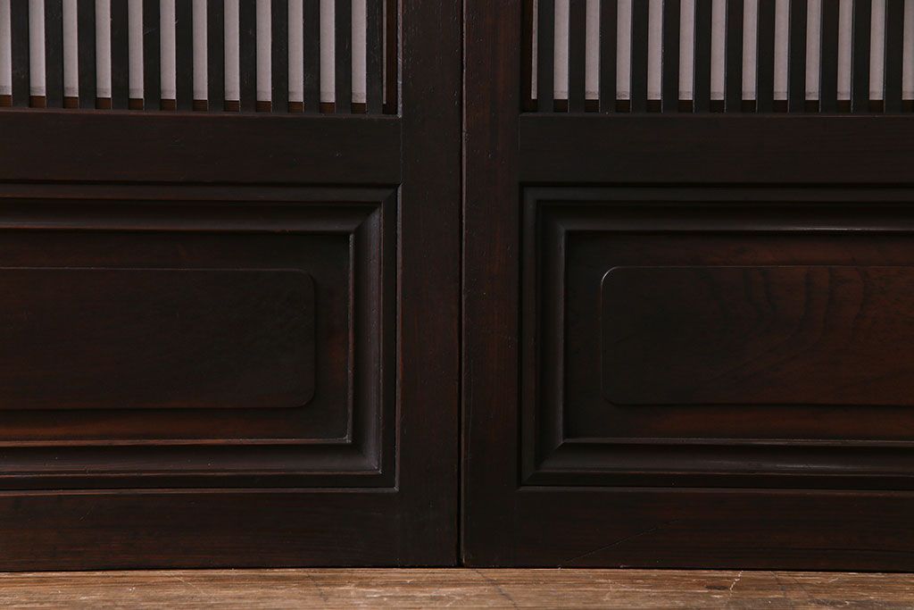 和製アンティーク 腰板ケヤキ材 花ガラスが上品な裏障子付きの格子戸(障子戸、引き戸、建具)2枚セットです。