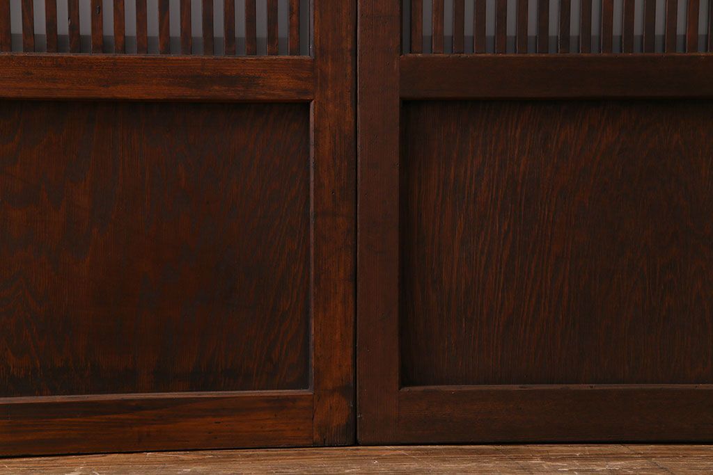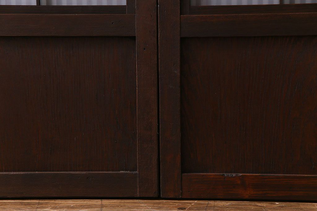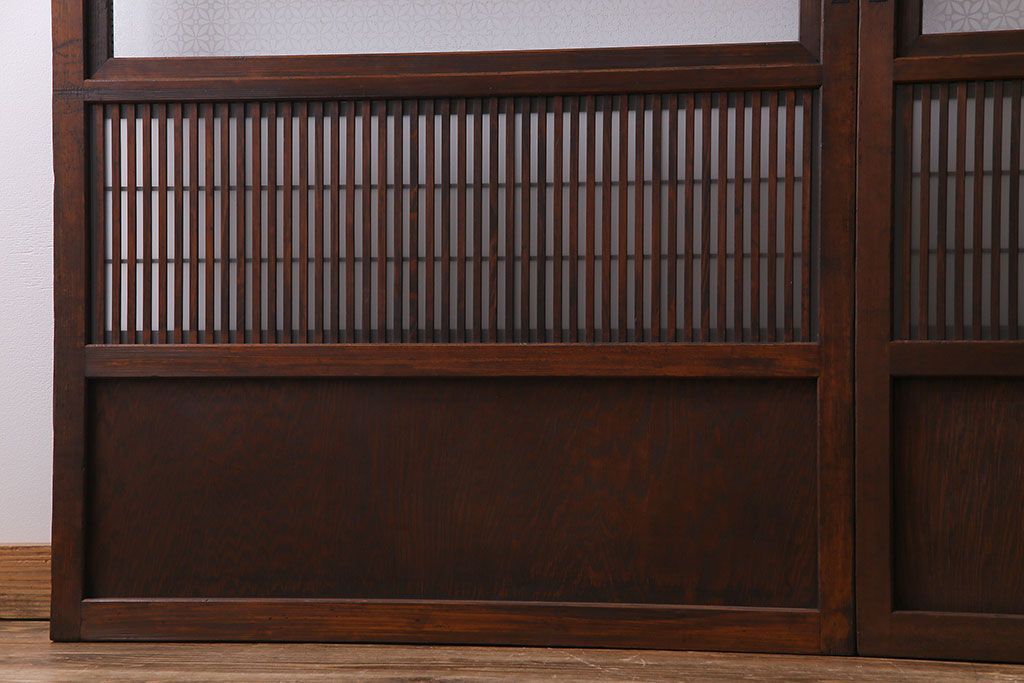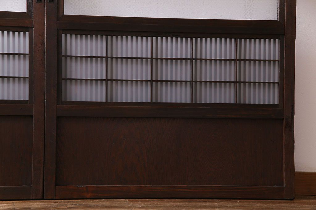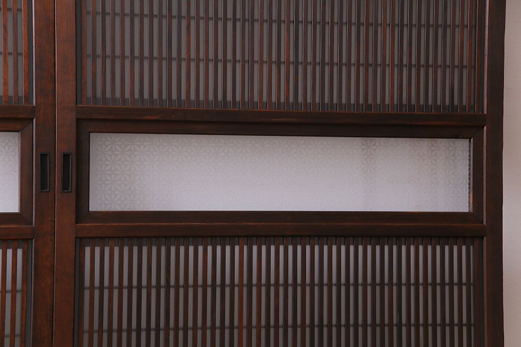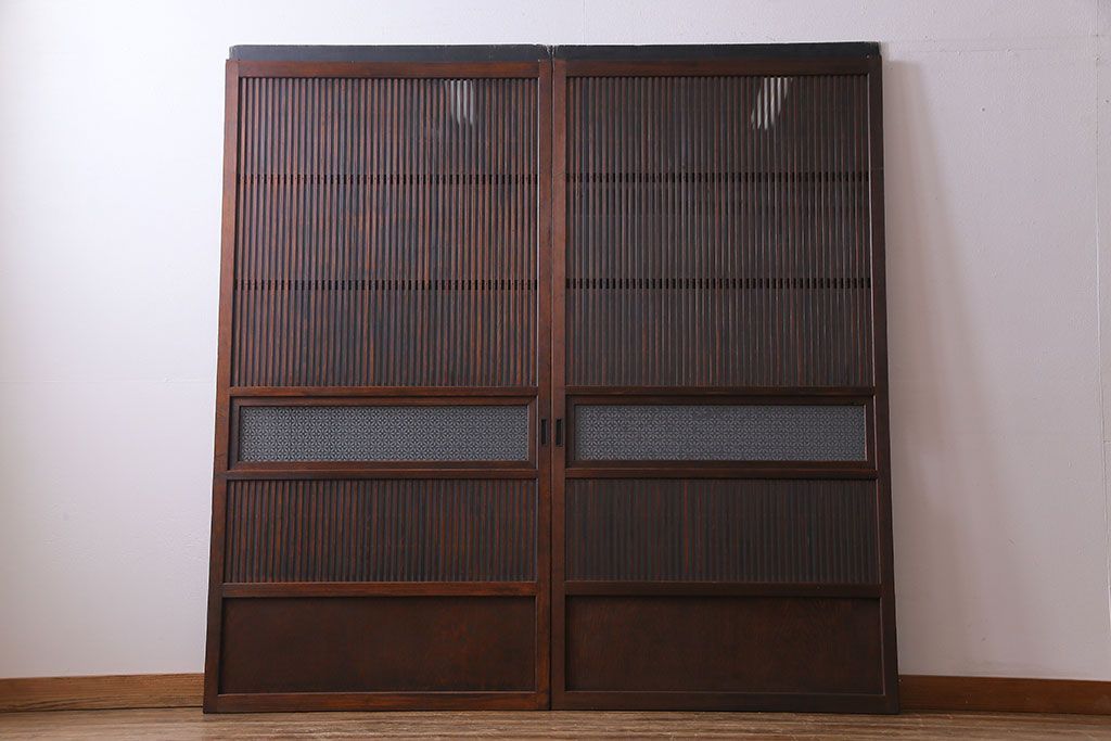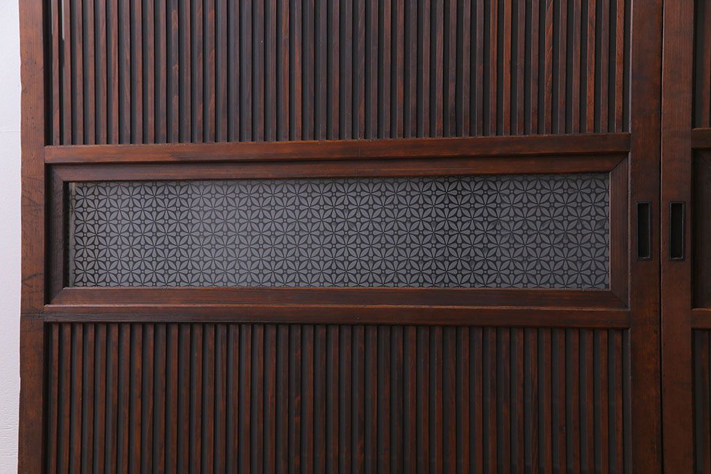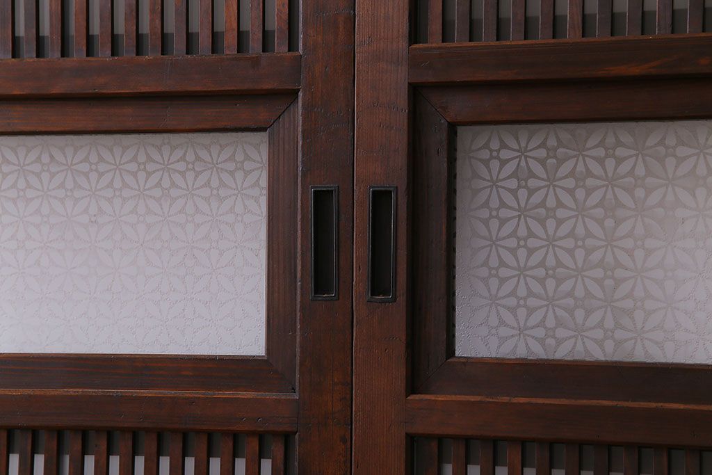 ドア・建具> 格子戸 > 大正昭和初期 板ガラス裏障子留め オリジナル花ガラスの入ったレトロな帯戸(ガラス帯戸、ガラス戸、引き戸、建具)2枚組