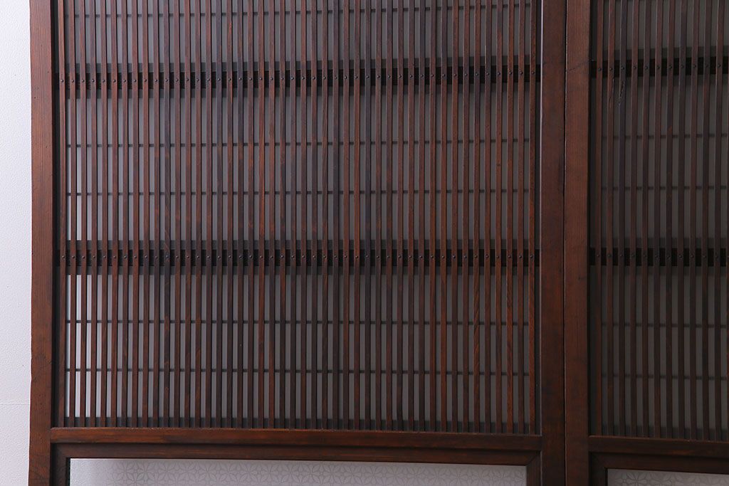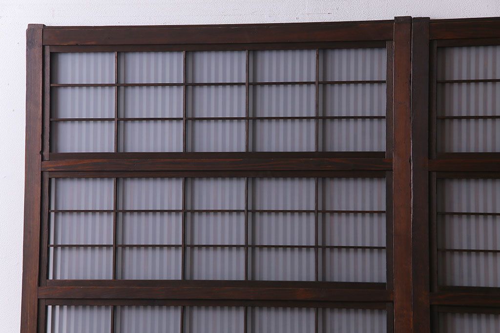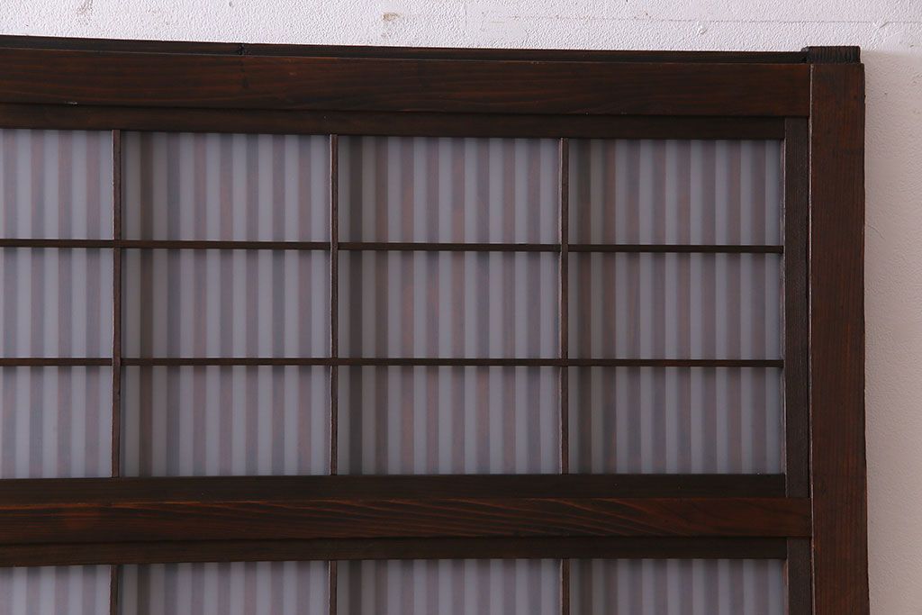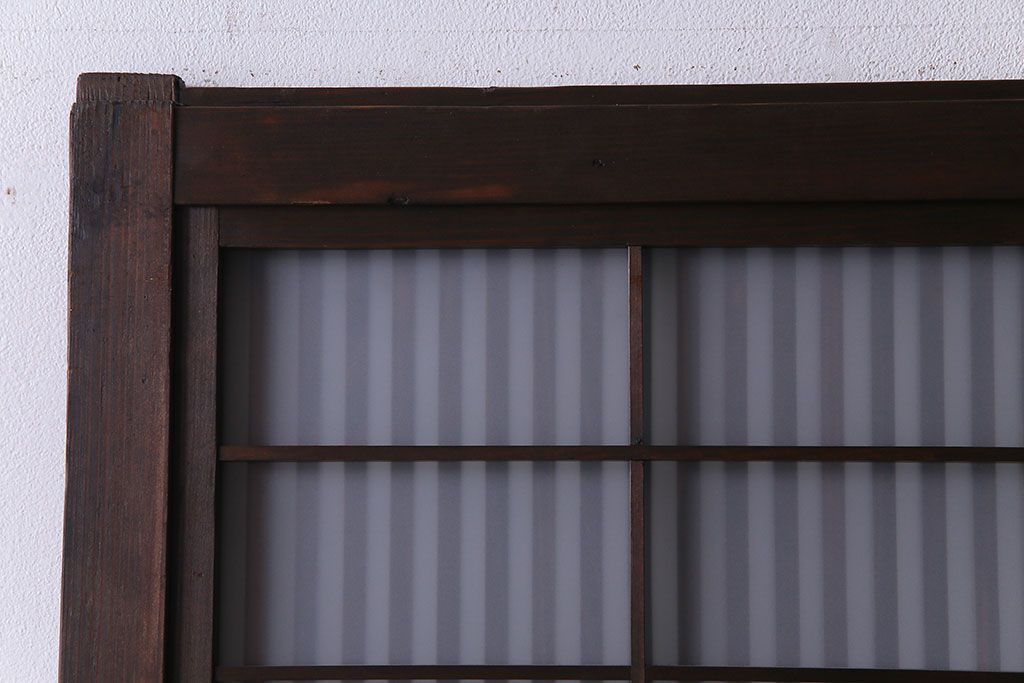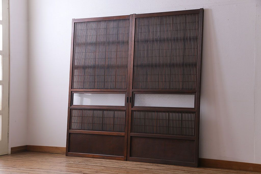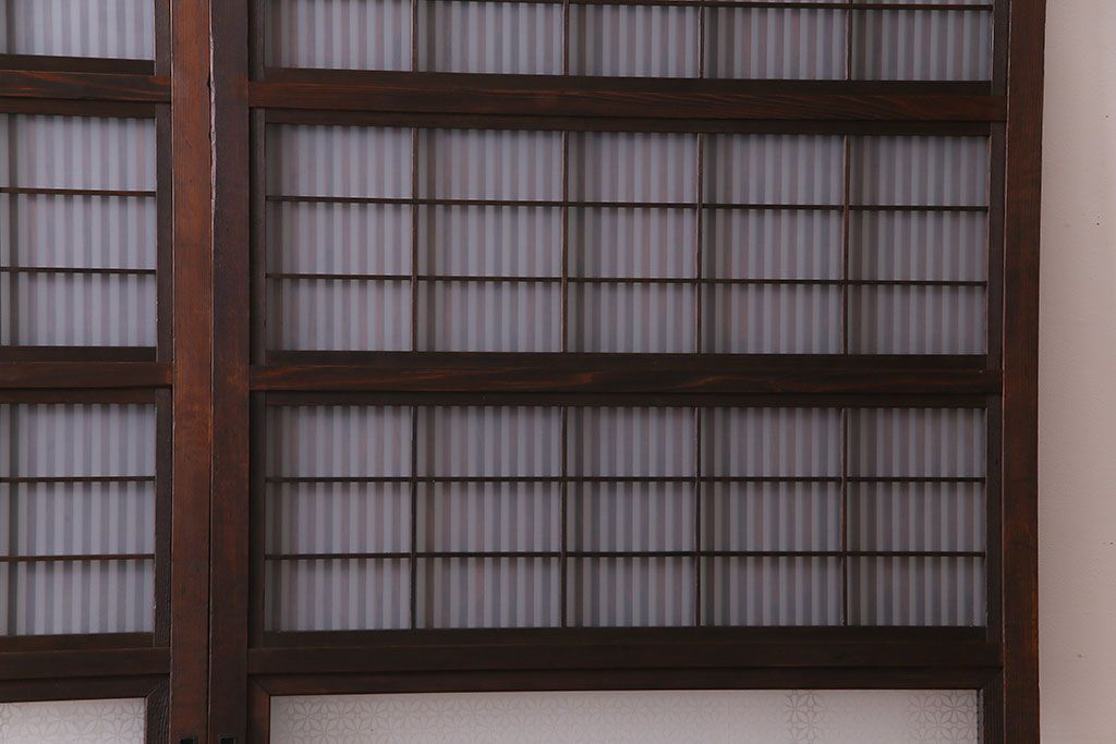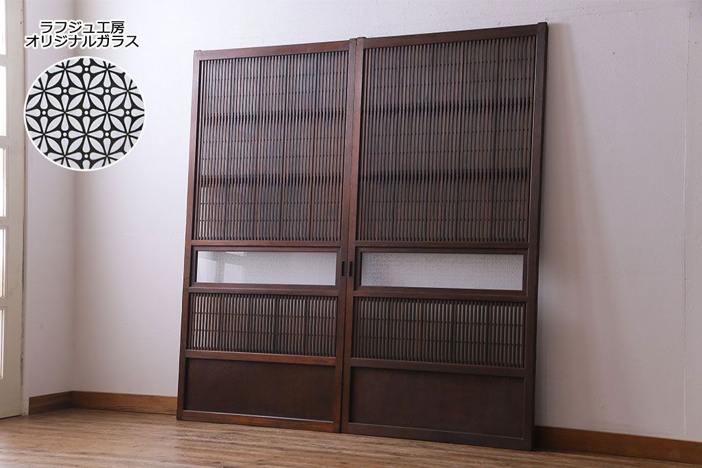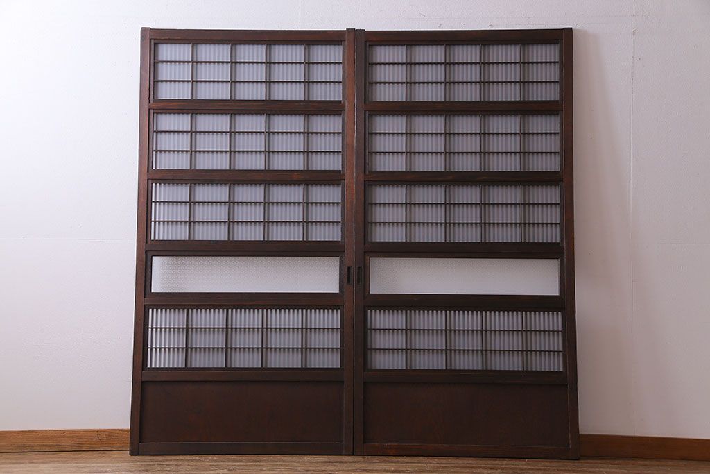 ドア・建具> 格子戸 > 大正昭和初期 板ガラス裏障子留め オリジナル花ガラスの入ったレトロな帯戸(ガラス帯戸、ガラス戸、引き戸、建具)2枚組