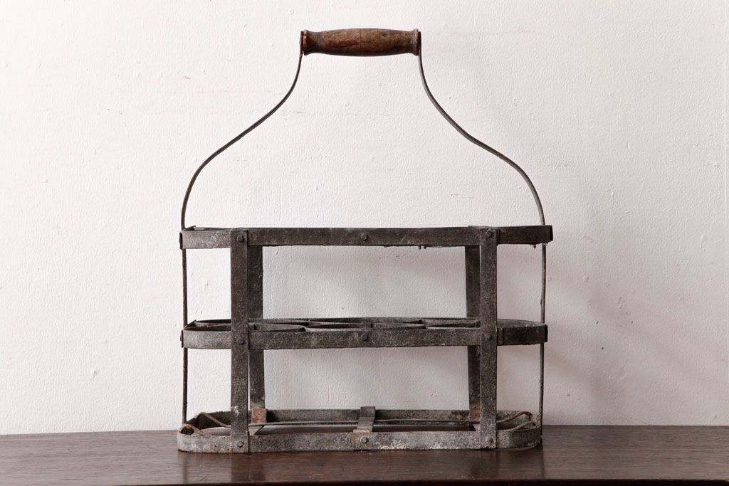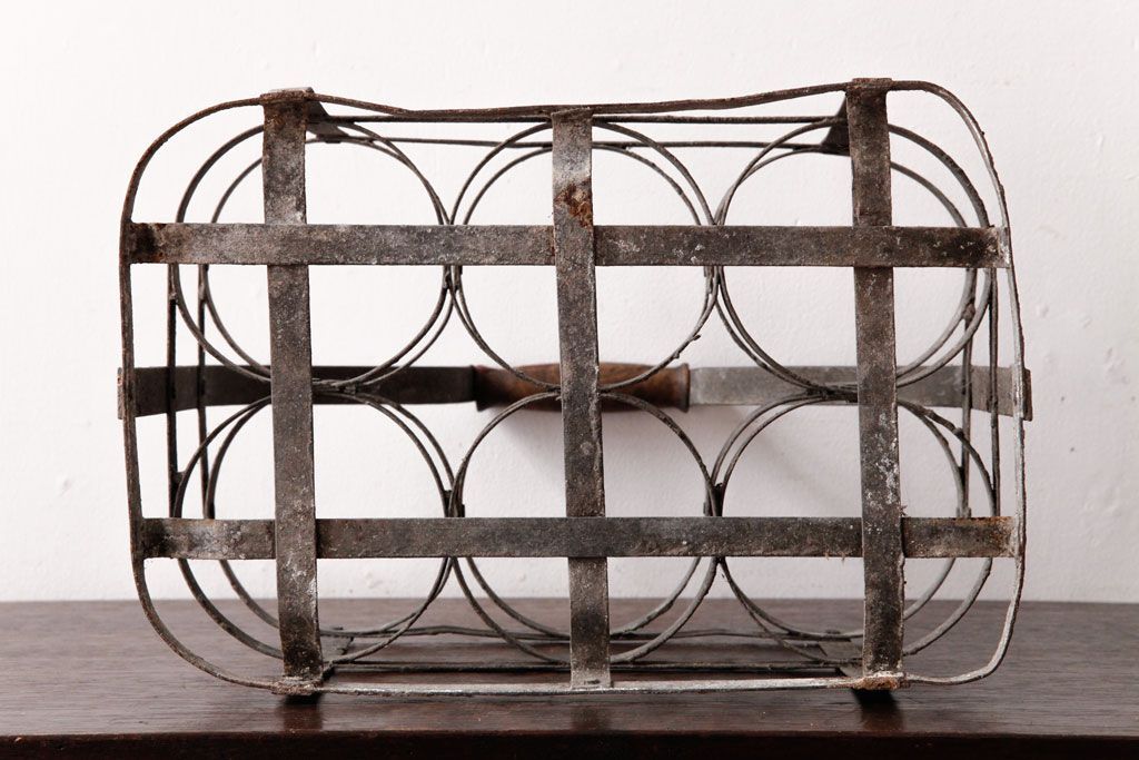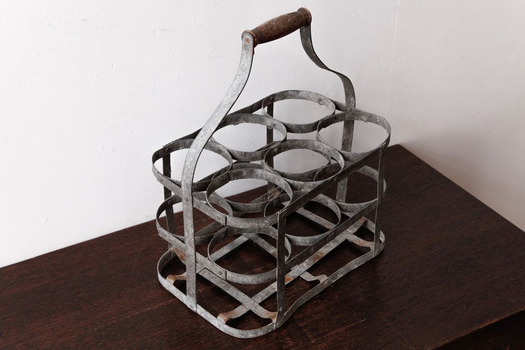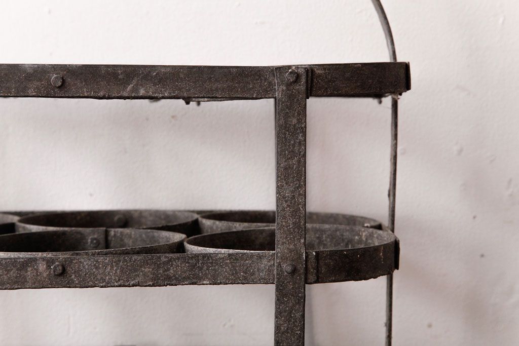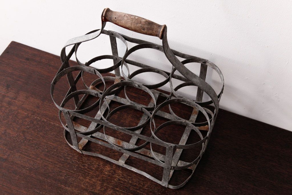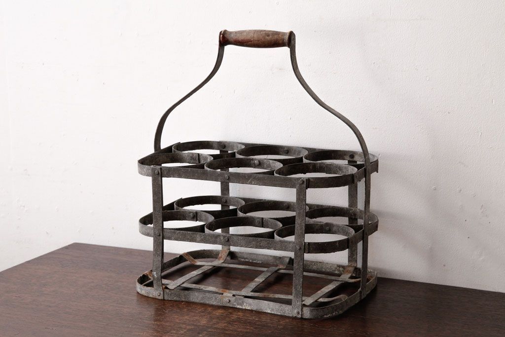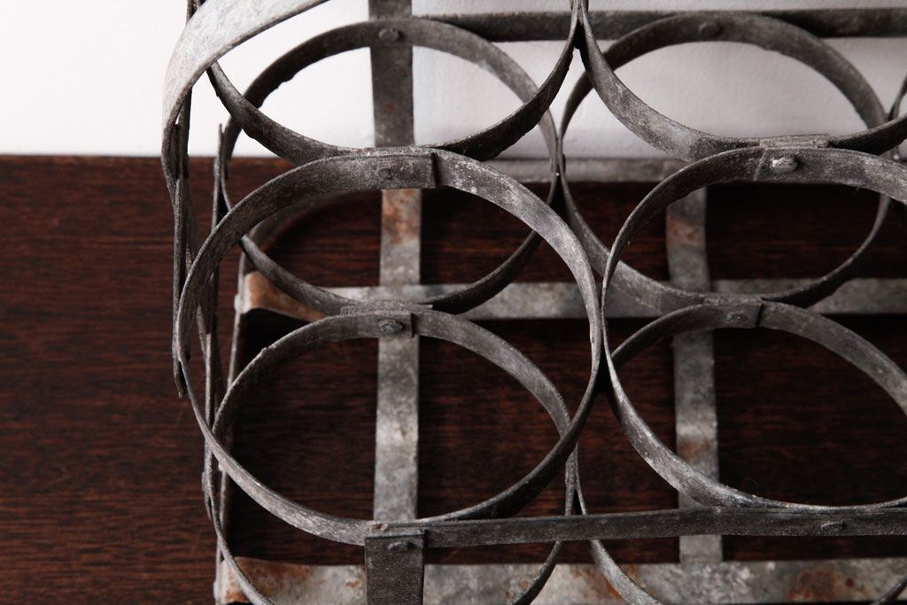 ラフジュ工房> 小物収納・トランク> バスケット > アンティーク雑貨 ビンテージ アイアン製 6連 シャビーでおしゃれなボトルケース(ボトルラック)(1)