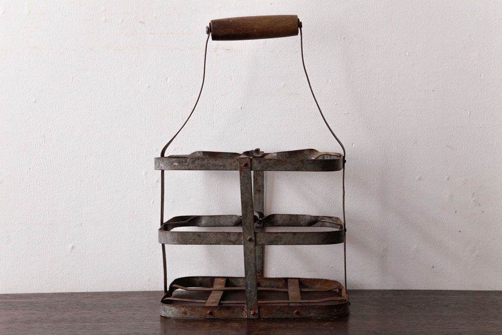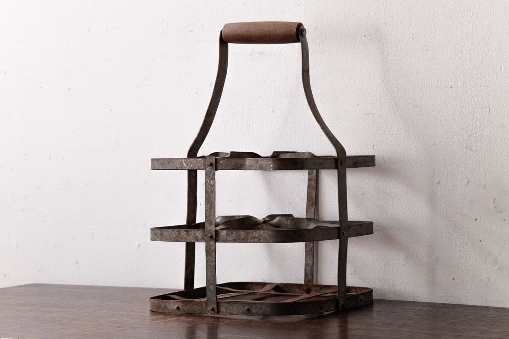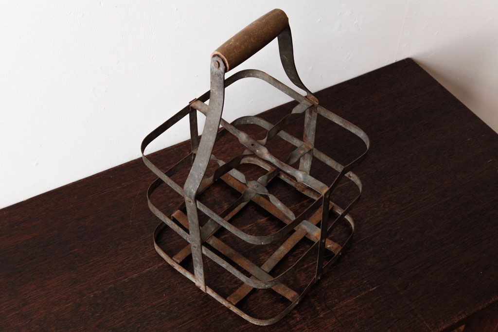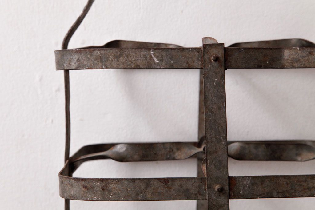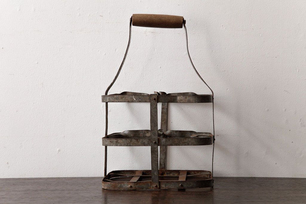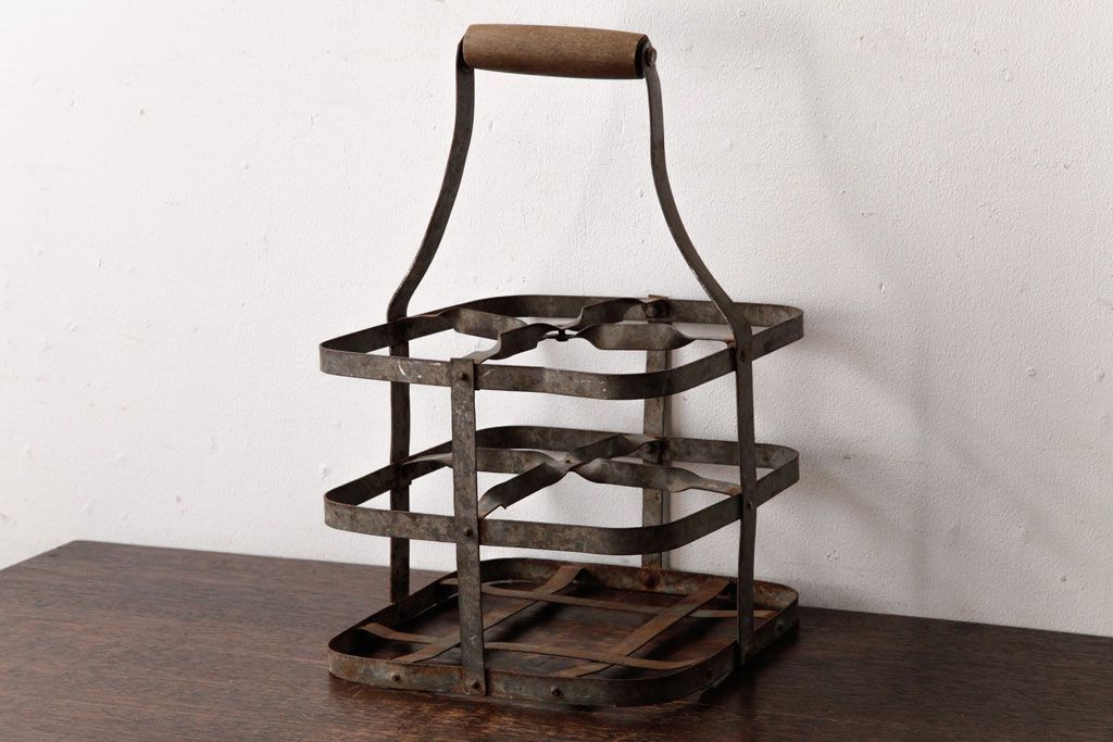 ラフジュ工房> 小物収納・トランク> バスケット > アンティーク雑貨 イギリスビンテージ 4連 ブロカントスタイルにぴったりなアイアン製ボトルラック(ボトルケース)
