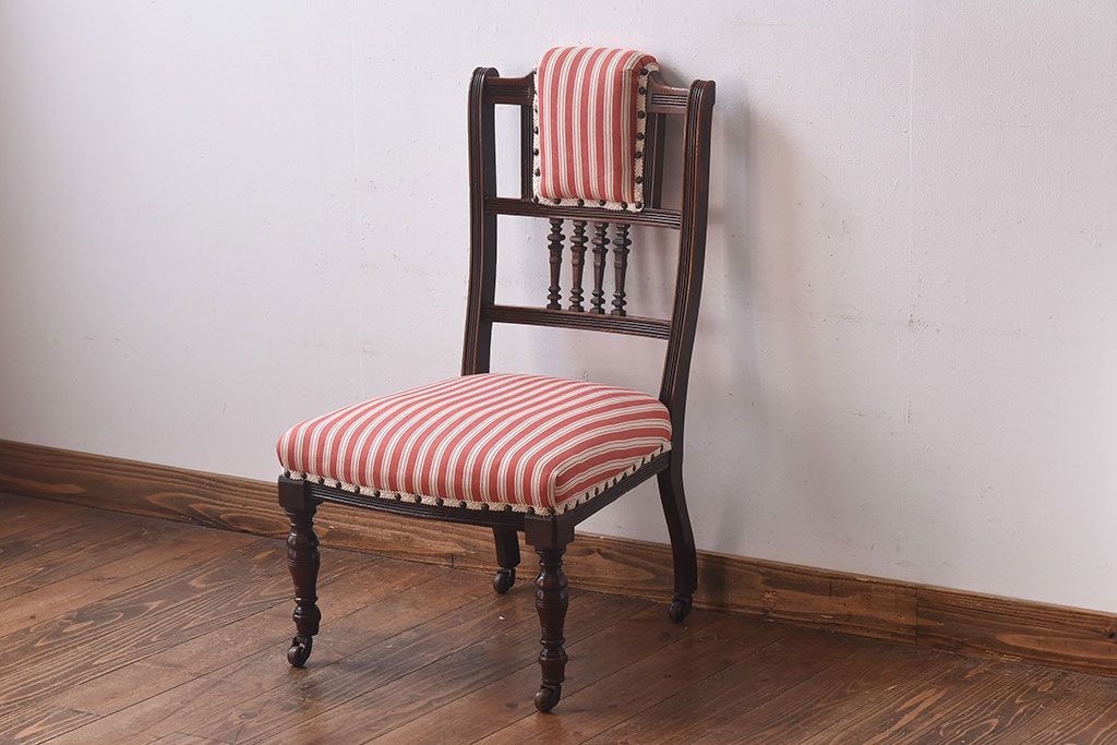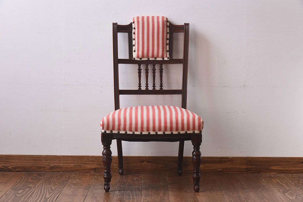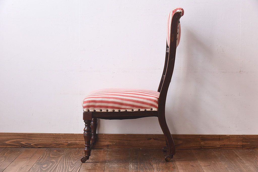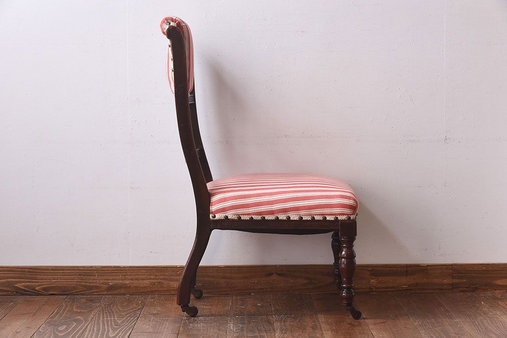 ラフジュ工房> 椅子・ベンチ> ダイニングチェア > アンティーク家具 イギリスアンティーク ウォールナット材 上品な佇まいのキャスター付きナーシングチェア(椅子)