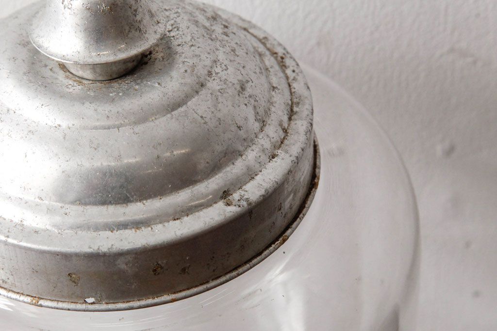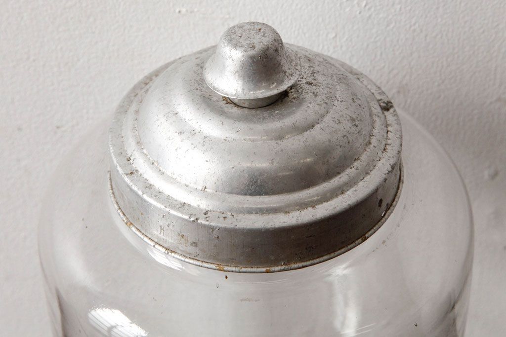 ラフジュ工房> 洋食器・キッチン用品 > アンティーク雑貨 昭和レトロ 味のあるアルミ蓋の筒型ガラス瓶(キャニスター)
