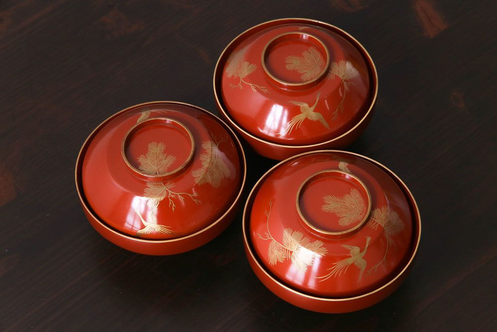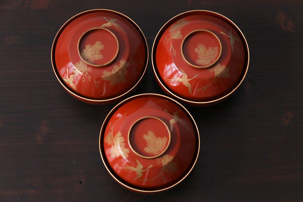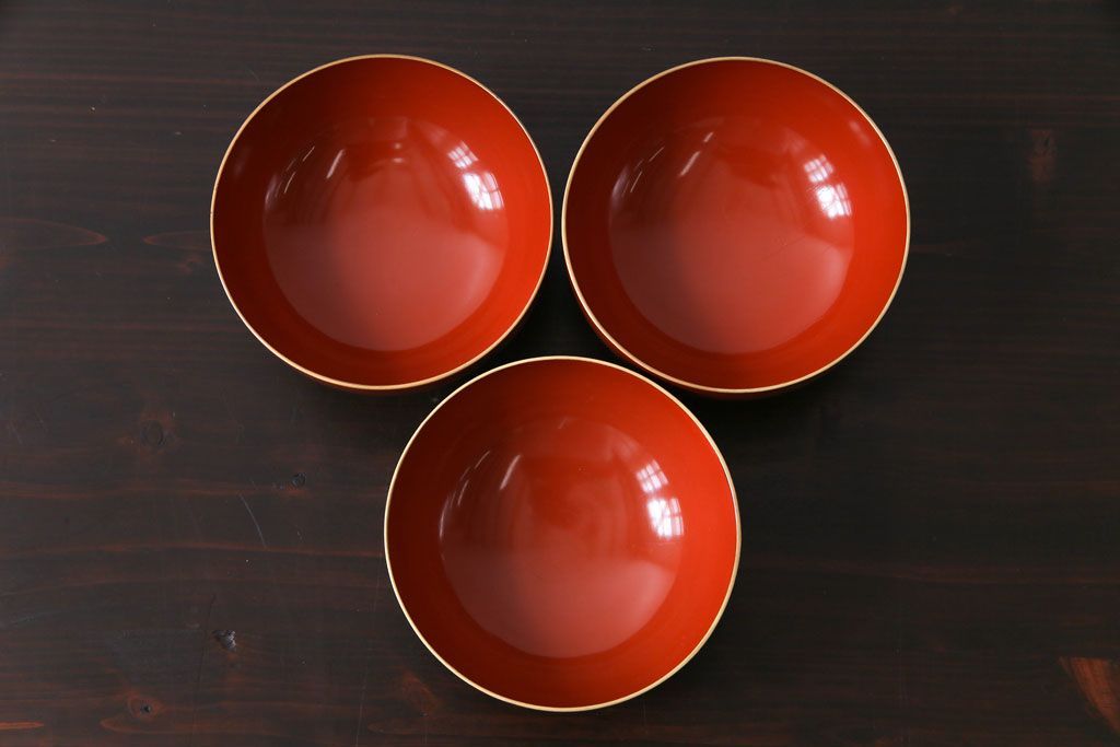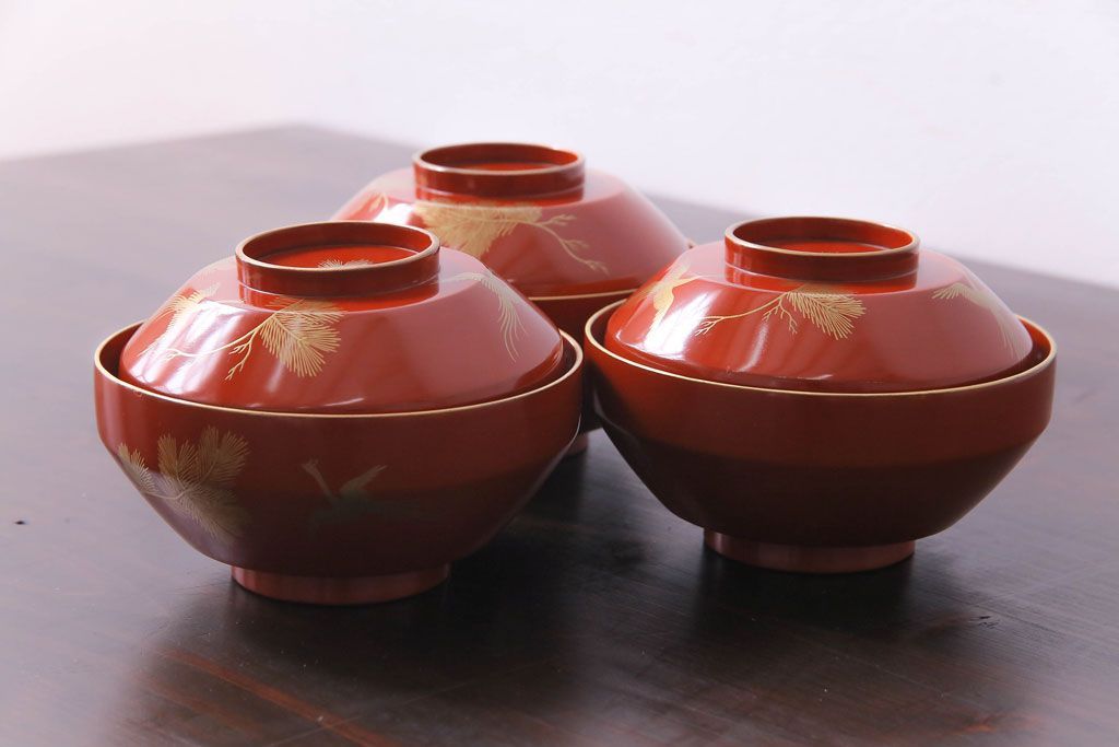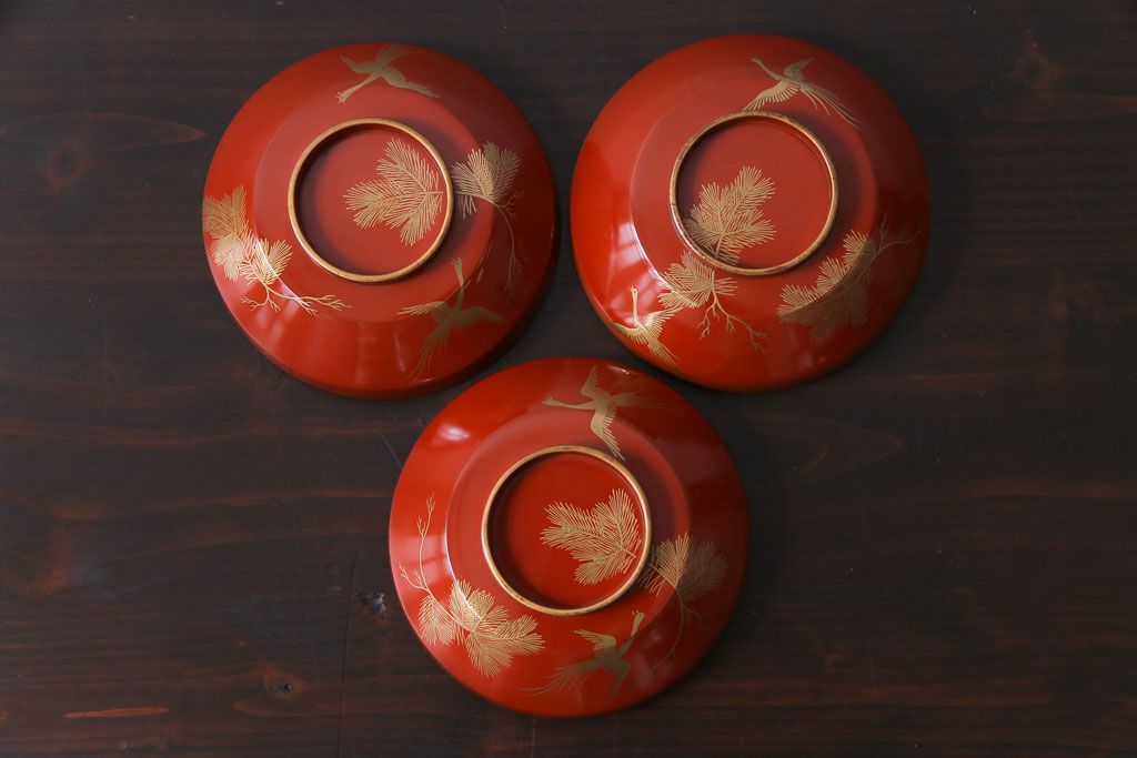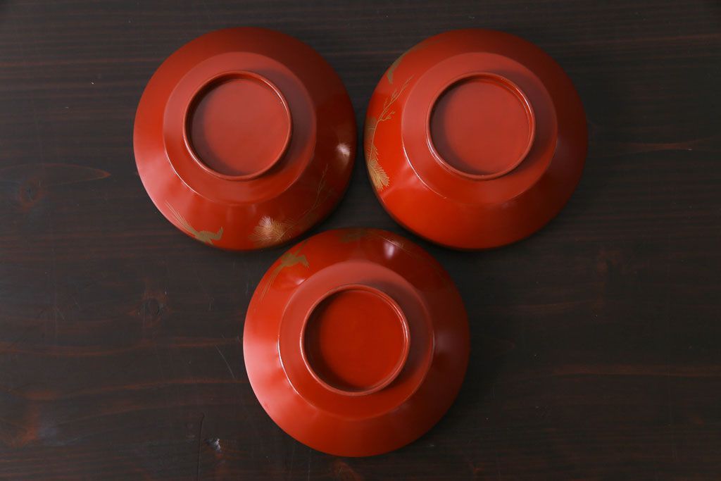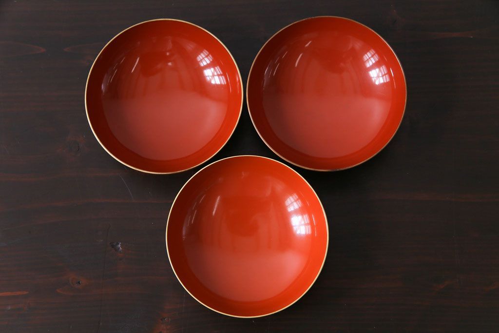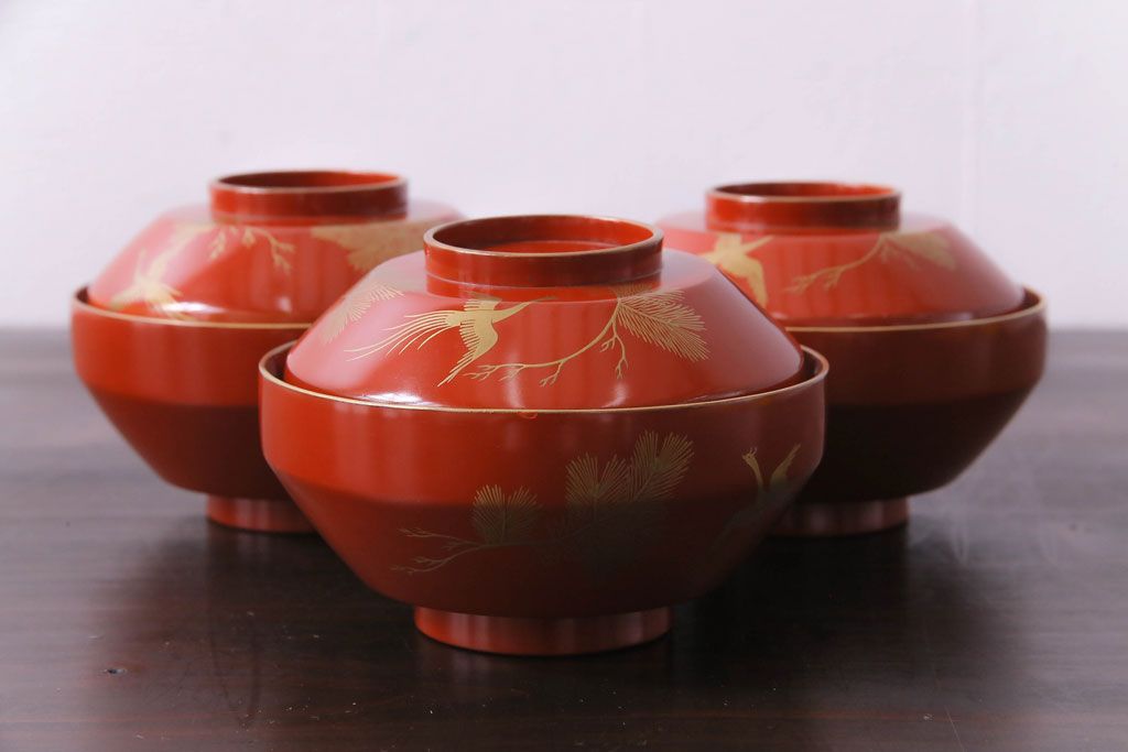 ラフジュ工房> 和食器・茶道具> お椀・茶碗 > アンティーク 大正昭和初期 鳳凰 朱塗り木製碗3客セット(漆器)