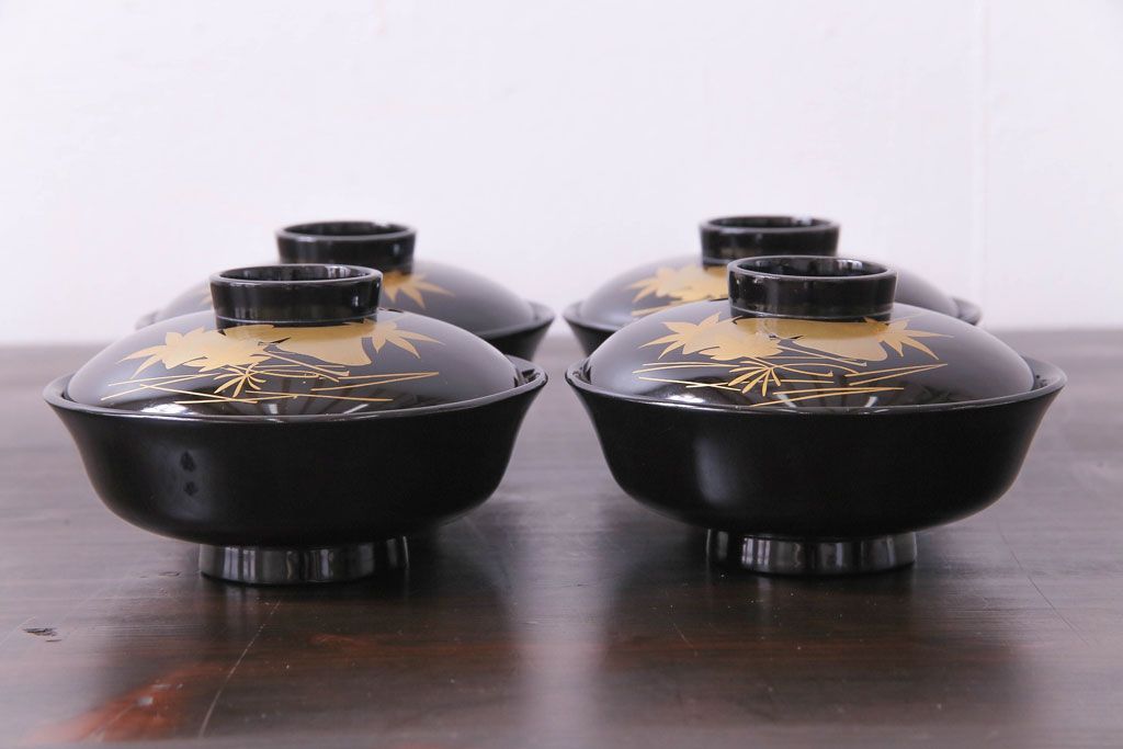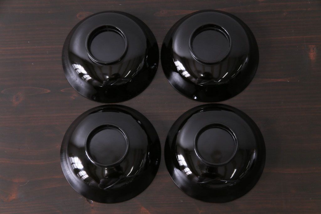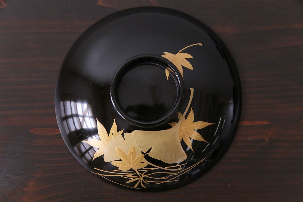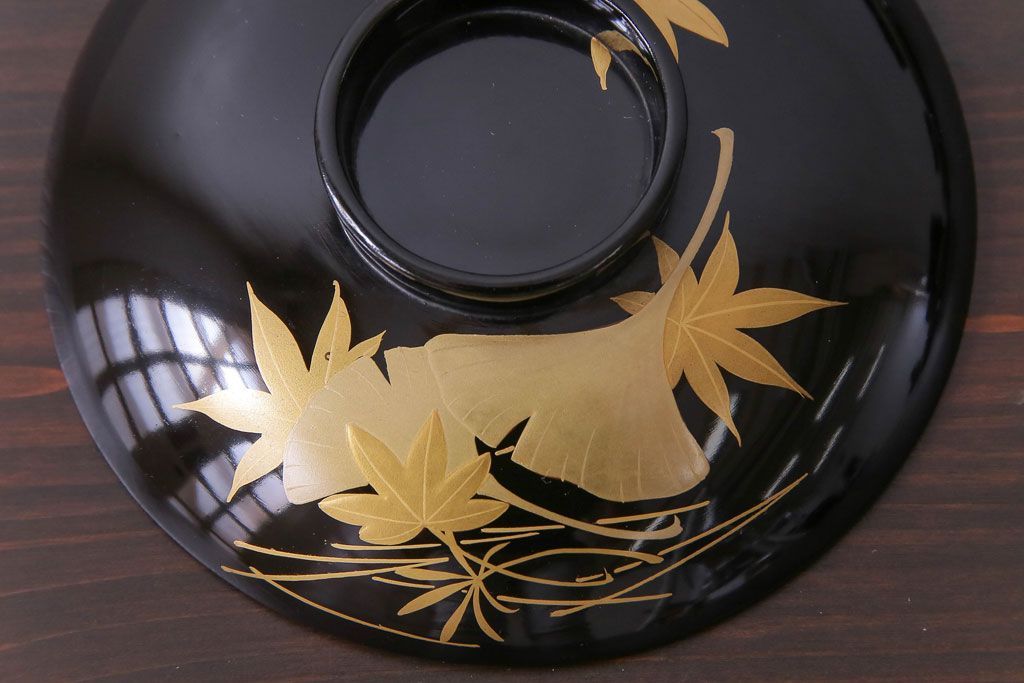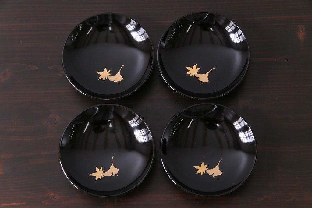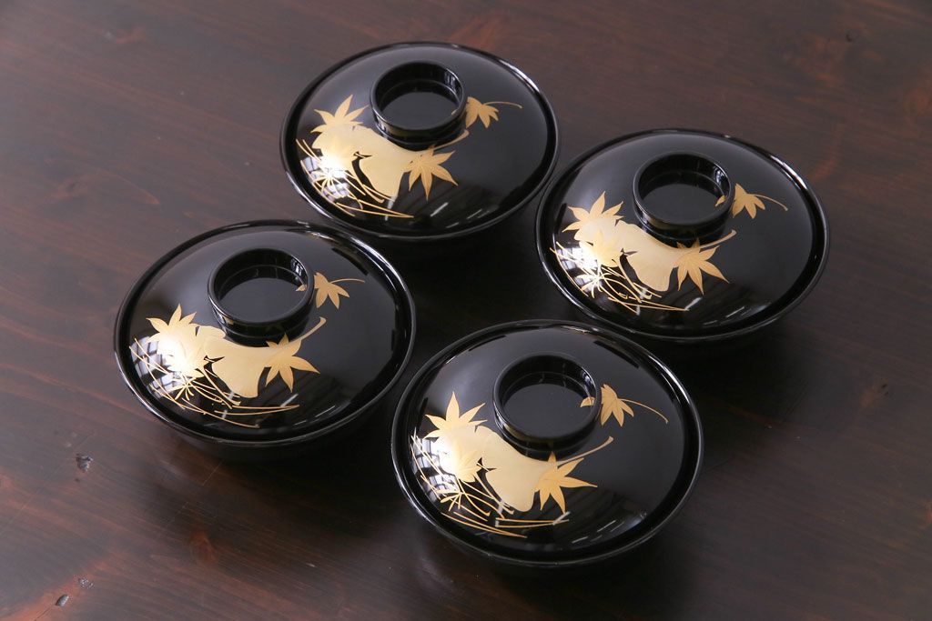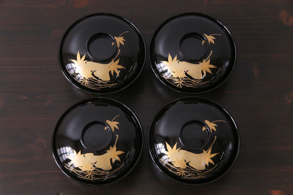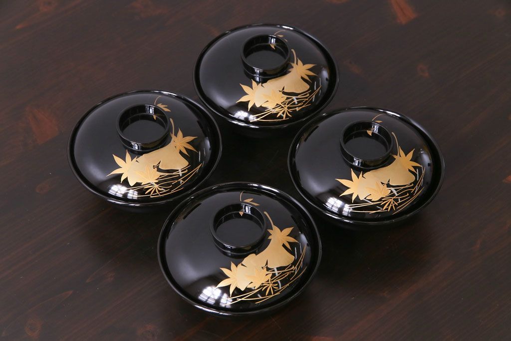 和製アンティーク 黒漆塗り 紅葉と銀杏の図柄が和の雰囲気漂う木製碗4客セット(漆器)
