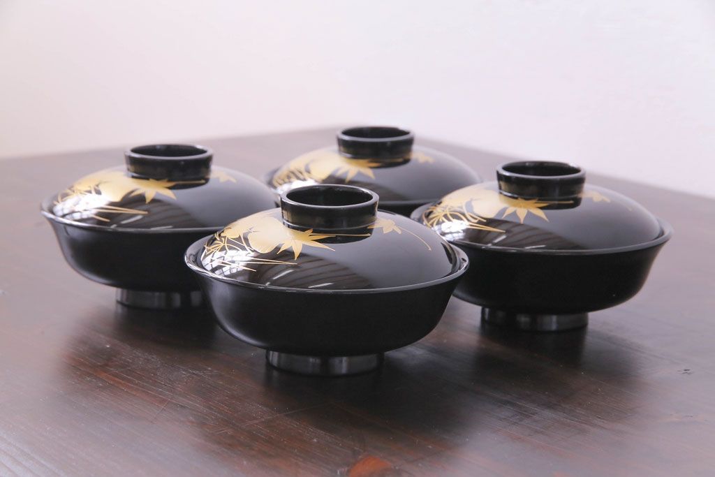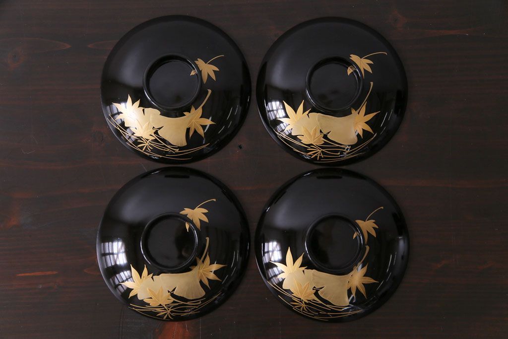 ラフジュ工房> 和食器・茶道具> お椀・茶碗 > 和製アンティーク 黒漆塗り 紅葉と銀杏の図柄が和の雰囲気漂う木製碗4客セット(漆器)