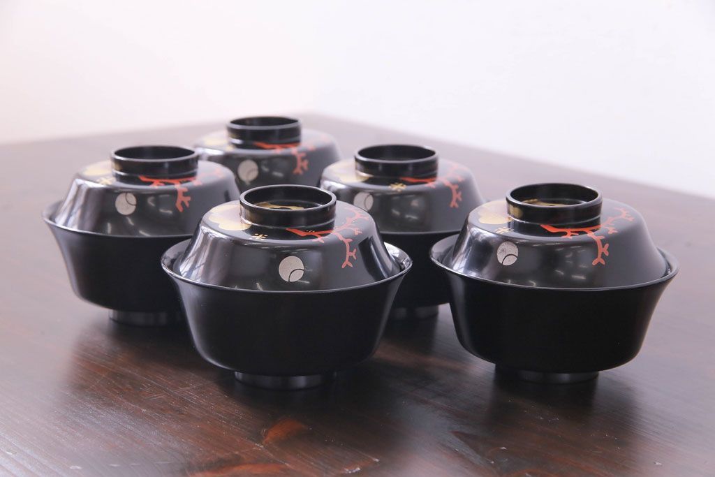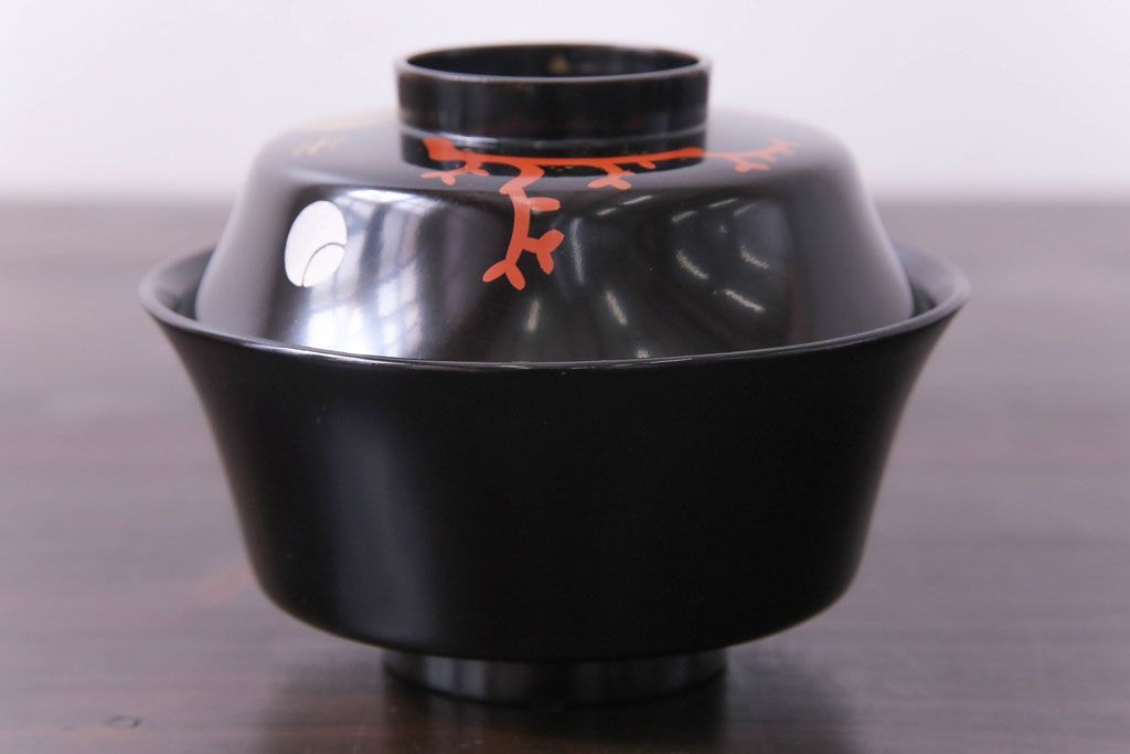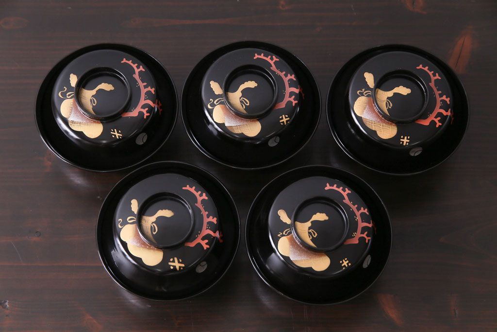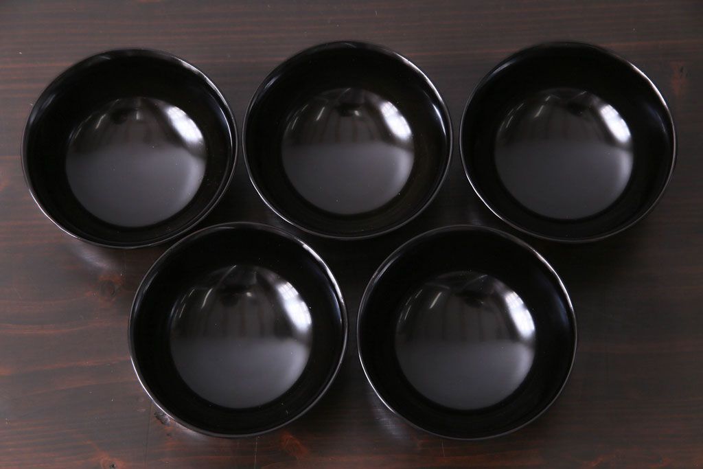 ラフジュ工房> 和食器・茶道具> お椀・茶碗 > 和製アンティーク 黒漆器 赤珊瑚が描かれた木製碗5客セット(漆器)