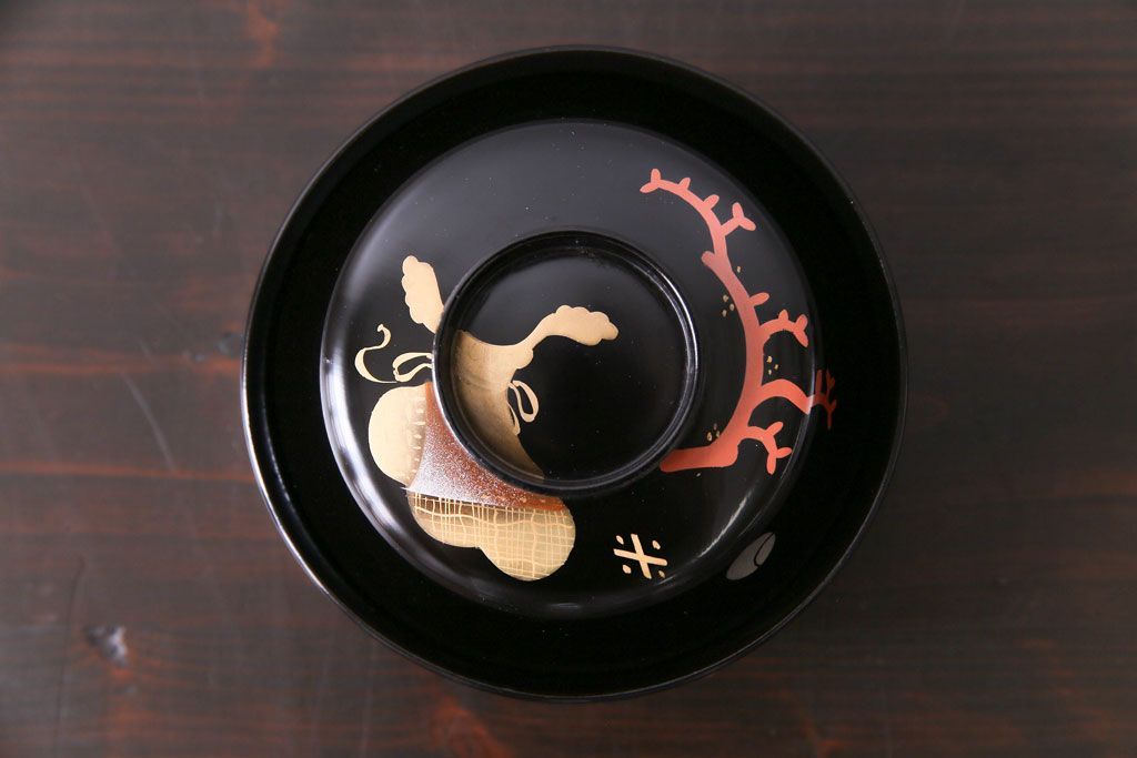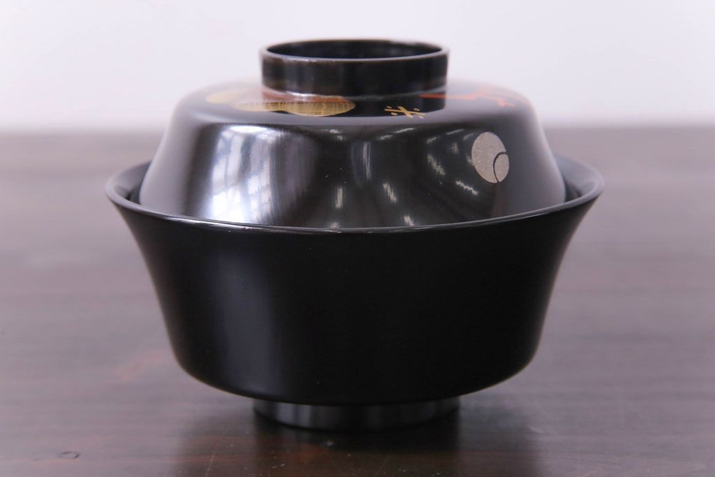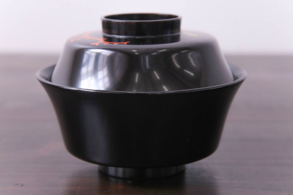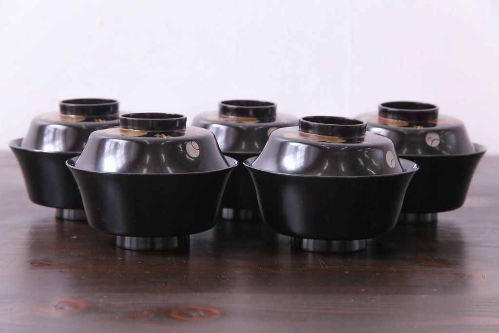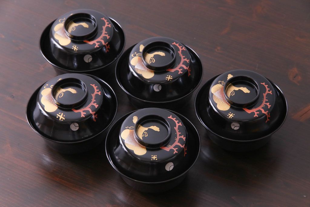 ラフジュ工房> 和食器・茶道具> お椀・茶碗 > 和製アンティーク 黒漆器 赤珊瑚が描かれた木製碗5客セット(漆器)