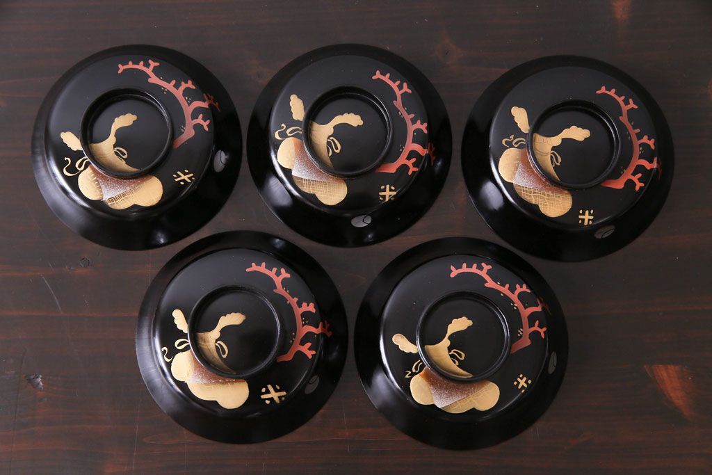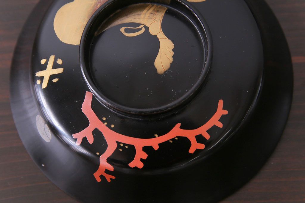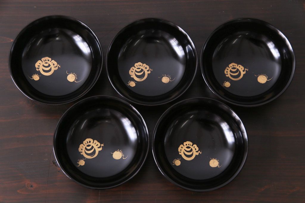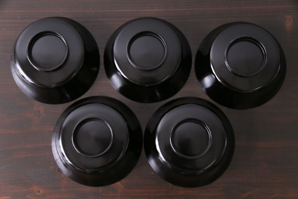 ラフジュ工房> 骨董・美術品> 骨董-漆器 > 和製アンティーク 黒漆器 赤珊瑚が描かれた木製碗5客セット(漆器)